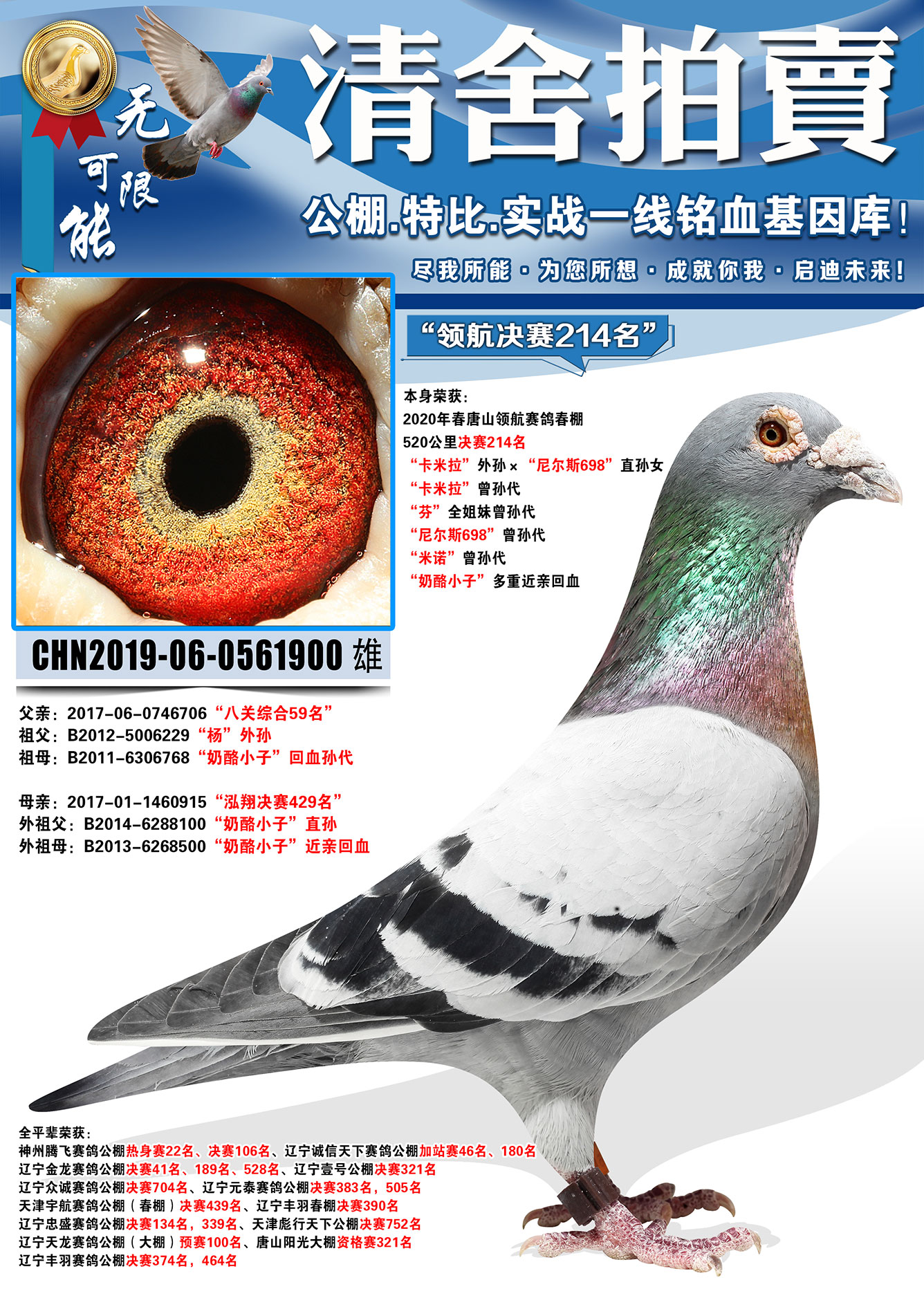 所有拍卖鸽全部血统真实!!个人鉴鸽观点不一,飞不飞天上见.血统成绩第一