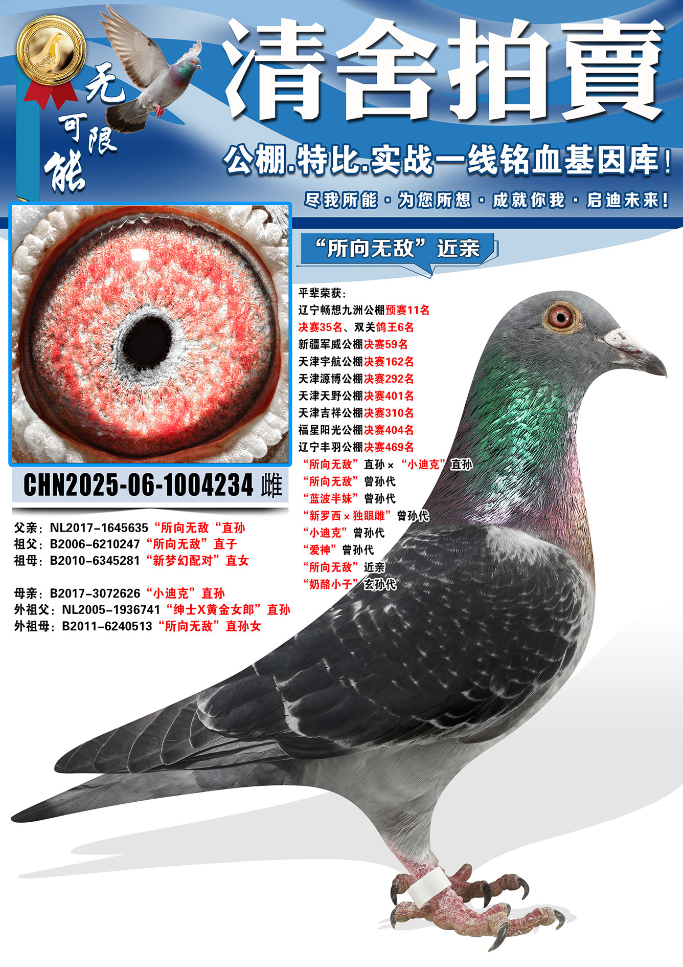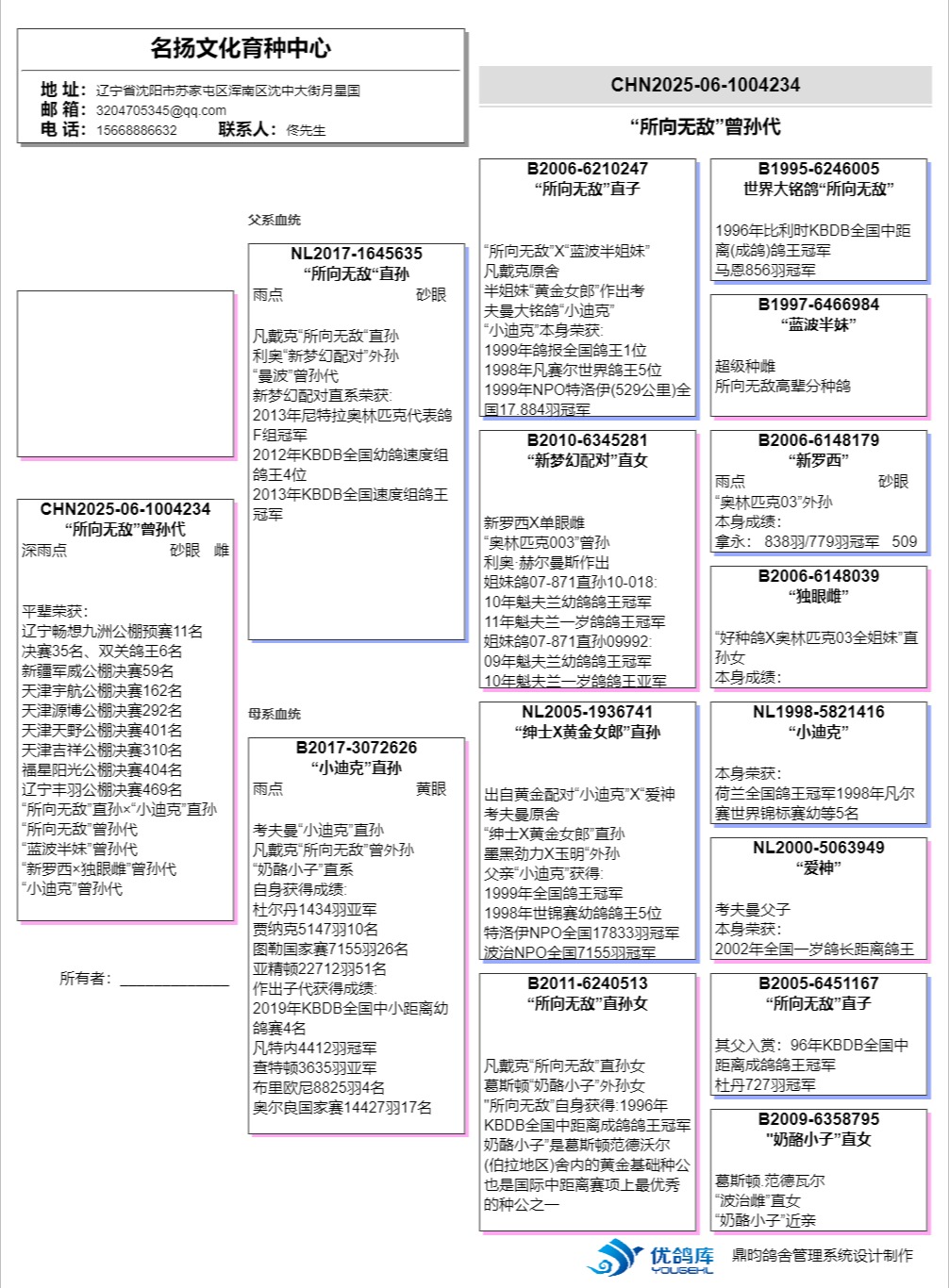 所有拍卖鸽全部血统真实!!个人鉴鸽观点不一,飞不飞天上见.血统成绩第一