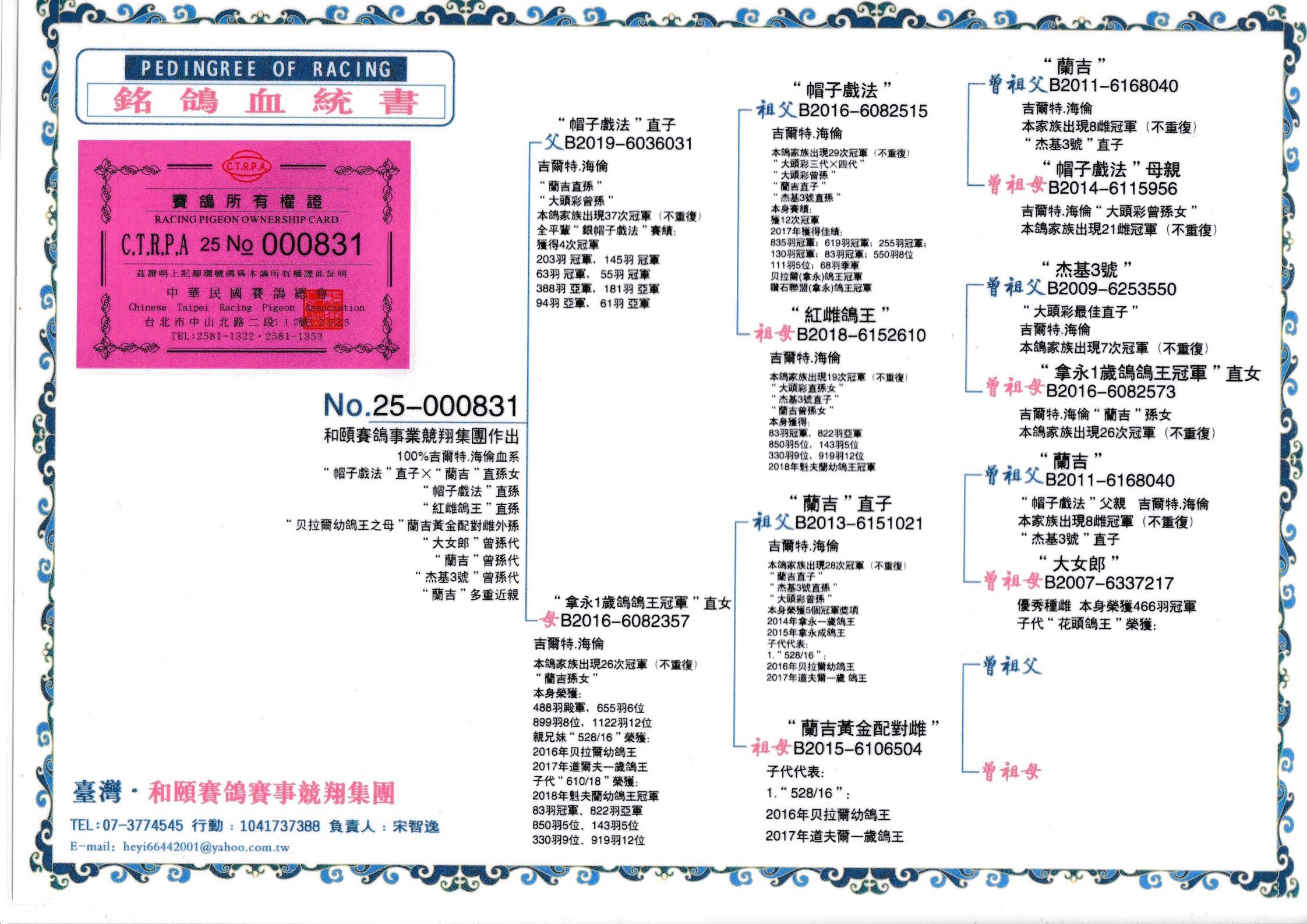 所有拍卖鸽全部血统真实!!个人鉴鸽观点不一,飞不飞天上见.血统成绩第一
