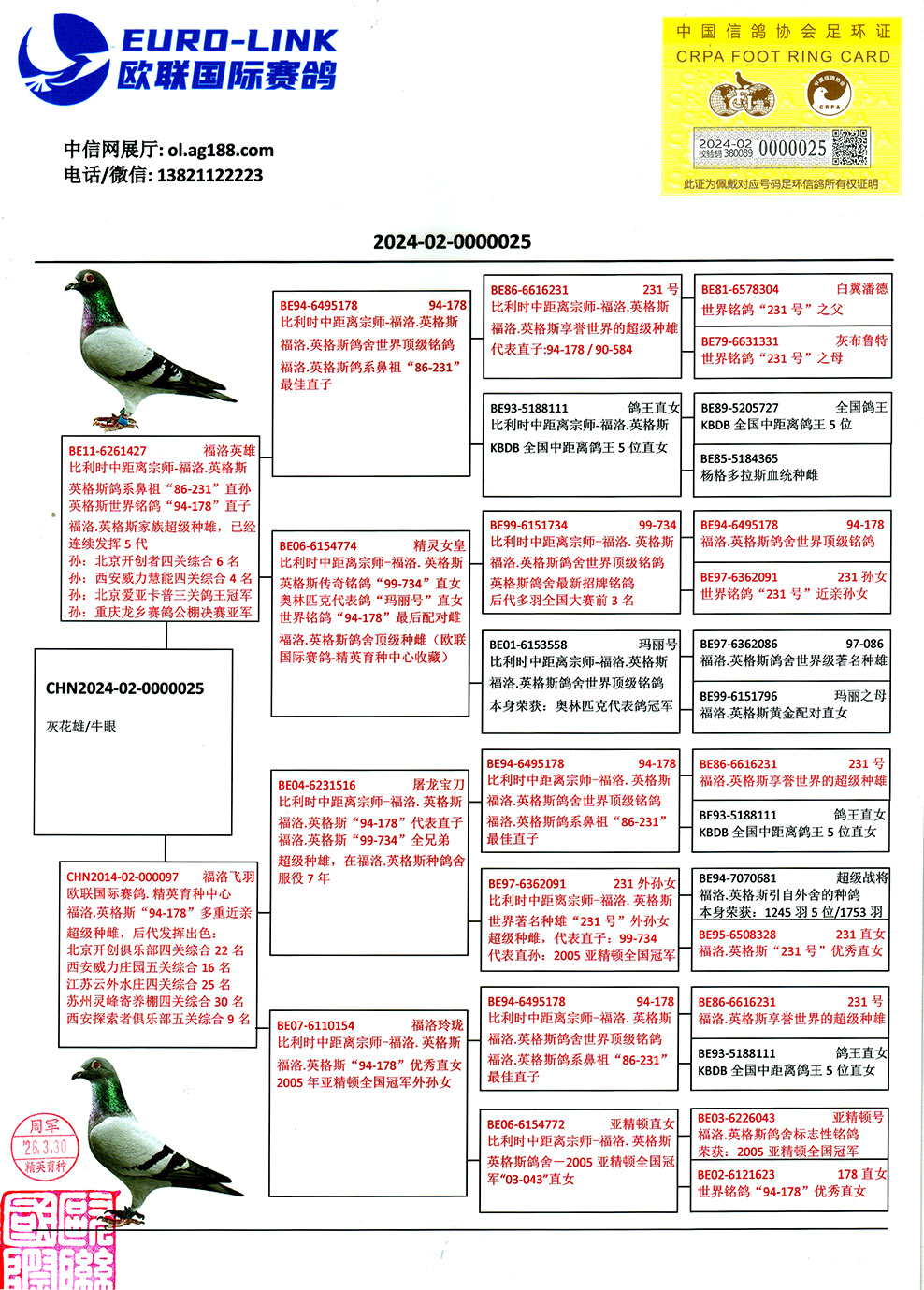 - 当前查看拍卖鸽:英格斯世界铭鸽178近亲直孙
