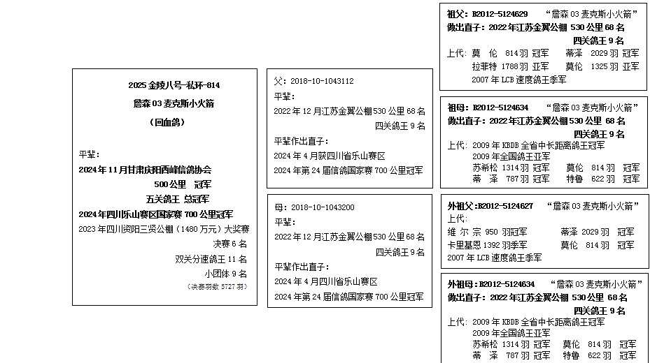福建三明林辉2025年10月获500公里决赛冠军,指定冠军,A组冠军, B组冠军,普赛冠军,双冠鸽王亚军。 2025年6月获福建闽清鸽会350公里冠军