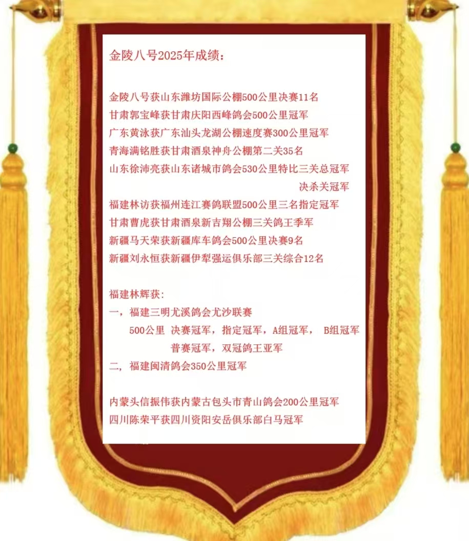 金陵八号2025年12月获山东潍坊国际公棚500公里决赛11名(拿破仑)