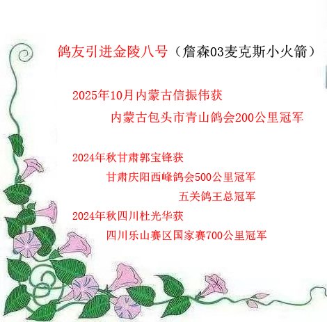 金陵八号(乔 花 飞奴) 2020年获甘肃庆阳帝晖公棚:第二关300公里鸽王季军 第三关400公里鸽王冠军 第四关500公里鸽王亚军