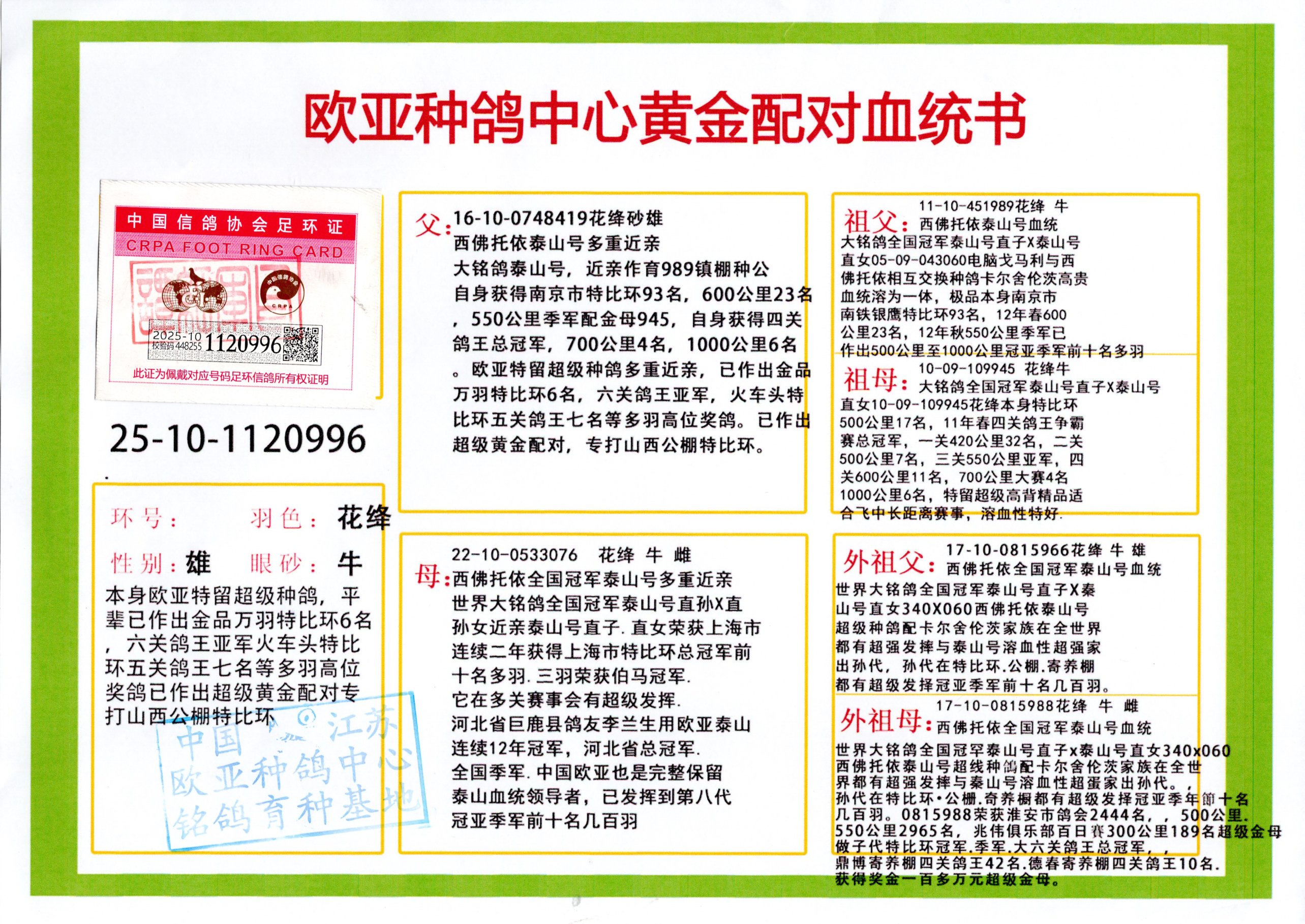 24年秋南京特比环欧亚荣获大团体冠军.小团体冠军551公里大特比13名.14名.16名.19名.20名.21名.24名.26名.27名.28名.42名.52名.54名.57名.65名.66名.68名.70名.71名.72名.74名.76名.80名.82名.83名.84名.85名.86名.90名.92名.110名.116名.121名.122名.128名.131名.158名.161名.164名.165名.166名.172名.174名.177名.182名.195名.196名.201名.205名.208名.210名.216名.253名.269名.275名.276名.294名.296名.299名,,24年秋云南天南铜都公棚决赛415名.天南铜都小棚决赛409名.云南玉活公棚决赛102名.490名.团体32名上笼二羽进二羽,天南铜都大棚506公里决赛445名。热烈祝贺河北省巨鹿县李兰生老师用欧亚泰山号血系连续十一年夺冠军,河北省国家赛冠军.全国季军等多次前十名高位,扬州王军王总用欧亚利奥24年春季获山东翔宇公棚决赛33名盖比53名。南京刘正龙刘总用欧亚盖比获得24年秋山东潍坊国际公棚决赛42名.精英赛30名.三关鸽王71名.决赛86名.加站赛16名.南京市特比环A组鸽王9名.B组鸽王5名.6名.C组鸽王5名.精英赛冠军4名.技能赛A组冠军4名.5名.秦淮区特比环荣获15名.46名.48名.87名。四川西昌徐亮徐总用欧亚利奥获得凉山州聚友决赛177名.第二关亚军双关鸽王19名.三关鸽王105名.云南豪庭公棚决赛603名。热烈祝贺24年四川重庆翔园鸽舍用欧亚泰山号荣获春季400公里冠军.秋季500公里冠军,河北王总用詹森X利奥获得千羽千翔公棚400公里冠军,广东蔡楷焕荣获24年秋爱好者 赛鸽俱乐部三关鸽王季军.一关420公里99名.二关450公里11名.三关520公里32名.单关季军.7名.12名,江西李卫兴荣获贵州红枫公棚8名.共翔俱乐部寄养棚四关综合鸽王30名.一关400公里78名.二关500公里55名.三关520公里37名.四关500公里57名.同父母获公棚18名.雷鸣获得武汉黄浦育翔中心冠军,四川陈文获得四川明鸿俱乐部300公里梦幻2名.3名.4名.9名.10名.13名.14名.15名.31名.34名.40名.41名.42名.43名.69名.71名.72名.73名.74名.94名.95名.97名.98名.99名.419公里决赛荣获总冠军7名.总共归巢9羽,四川徐亮获豪庭决赛603名,山西郑勇获得山西泰鑫公棚决赛255名詹森红狐,热烈祝贺马总获得开尔(飞跃队)决赛9名获奖金1310000万元.第一关52名,天津津福资赛180公里96名.获奖金429543万元,欧亚支持全国鸽友24年秋多人报喜 祝大家取得更好成绩,给欧亚报喜鸽友欧亚决定给每人赠送一羽超级种鸽。欧亚俱乐部特比环多关鸽王成绩:15年秋淮安特比环黑色星期一全会上笼9700多羽,当天无鸽归巢,第二天全会归巢357羽,本舍归巢158羽.前十名八羽.前一百名归巢57羽,16年春季获五关鸽王总冠军,总亚军四名.六名.七名.九名.十名.晶艺俱乐部520公里冠亚季军5名.6名.7名.9名.11名等,火车头冠军.季军6名.8名.9名.10名,16年秋晶艺俱乐部特比环520公里亚军.季军4名.6名.7名.9名,15年春南京白下特比环冠军.亚军.季军6名.7名.8名.9名.10名.指定鸽A B组获得冠军.亚军.季军4名.5名.,17年淮安特比环亚军.4名.5名.7名.8名.10名.六关鸽王总冠军.4名.6名.9名.10名,寄养棚宿迁刘总20羽特比环获冠军.季军.4名.7名.8名.9名等。18年荣获万羽特比环六关鸽王总冠军.总亚军.总季军.6名.8名.十名.单关四羽冠军.二羽亚军.四羽季军.前十名27羽。19年秋万羽特比环六关鸽王总亚军.总季军.5名.8名等,单关二羽冠军.三羽亚军.一羽季军前十名31羽。20年秋淮安市鸽会四关特比环大赛风雨无阻鸽王亚军.鸽王六名,金品俱乐部万羽特比环六关鸽王总冠军,总亚军.四名.五名.六名.七名.八名.十名.前二百名鸽王35羽,单关冠亚季军前十名四十多羽,火车头五关鸽王季军.六名.八名.前二百名鸽王十七羽。20年春荣获淮安五区一市四关鸽王总冠军.亚军.四名.八名.九名。21年秋荣获金品万羽特比环大赛六关鸽王总亚军.总季军.四名.七名.九名.十名.单关冠亚军季军前十名三十多羽。火车头协会鸽王六名.七名.十名.单关前十名十七羽。22年秋荣获鸽王总冠军.总亚军.5名.7名.8名.9名.11名.单关冠亚季军前十名三十多羽,第一关单关前二百名四十多羽,第二关前二百名三十多羽,第三关前二百名四十多羽,第四关前二百名四十多羽,第五关前一百名53羽。23年秋荣获鸽王季军.五名.八名.十名.13名.17名.20名.27名等多羽鸽王.单关前十名二十多羽。公棚.寄养棚部分成绩:16年秋宁夏黄河公棚总冠军电脑戈马力指定通炮冠军,17年送八羽参赛获得鸽王八名进奖四名,支持韩总荣获八名。支持鸽友荣获宁夏中卫公棚决赛总冠军.精英赛冠军,支持18年宁夏黄河公棚决赛冠军詹森X泰山。安徽鼎博寄养棚院内外四关鸽王总冠军.鸽王十七名.三十七名同窝,鸽王39名.42名.58名.67名。18年山东公棚预赛冠军.决赛65名.送八羽进奖五羽.指定获奔驰汽车一辆。支持鸽友获得云南蓝云公棚冠军.盖比X佛卡门。支持鸽友荣获云南银集公棚决赛冠军 詹森427X520血系 速度赛6700羽冠军。17年荣获金马俱乐部寄养棚四关鸽王总冠军.季军.六名.八名.第一关冠军.亚军.季军四名.七名.十一名.金牌教练奖。支持鸽友18年北京费翔公棚预赛九名电脑X桑杰士,支持鸽友荣获陕西威力公棚决赛11名.内蒙古临河寄养棚四关鸽王六名.詹森配泰山,支持河北王总用欧亚詹森427配胡本喜获20年秋开尔青年棚季军。云南东荣公棚16年预赛冠军.决赛77名.17年决赛12名.詹森红狐X泰山,17年平安公棚决赛4名 詹森427。欧亚获得21年金母寄养棚第一关四名.第二关5名.第三关5名.6名.7名.10名.三关鸽王总冠军,四关鸽王14名.十羽鸽王。支持河