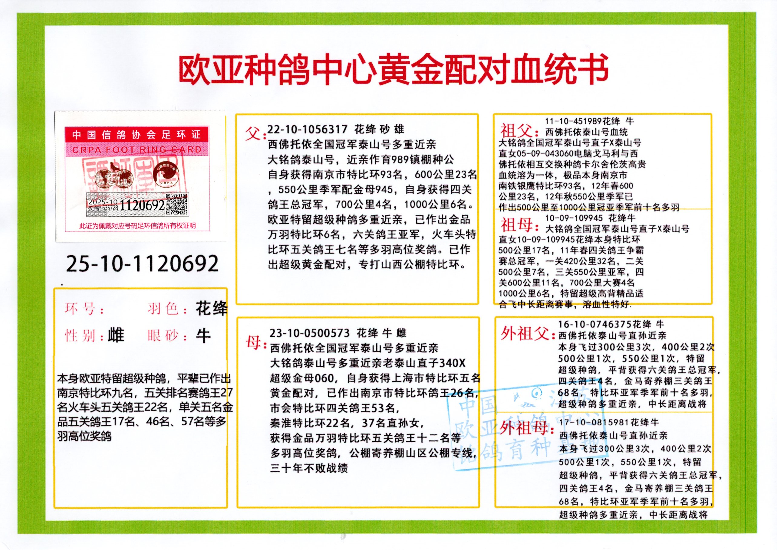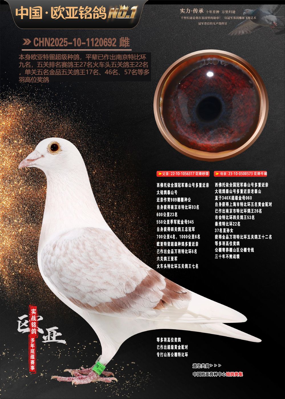 24年秋南京特比环欧亚荣获大团体冠军.小团体冠军551公里大特比13名.14名.16名.19名.20名.21名.24名.26名.27名.28名.42名.52名.54名.57名.65名.66名.68名.70名.71名.72名.74名.76名.80名.82名.83名.84名.85名.86名.90名.92名.110名.116名.121名.122名.128名.131名.158名.161名.164名.165名.166名.172名.174名.177名.182名.195名.196名.201名.205名.208名.210名.216名.253名.269名.275名.276名.294名.296名.299名,,24年秋云南天南铜都公棚决赛415名.天南铜都小棚决赛409名.云南玉活公棚决赛102名.490名.团体32名上笼二羽进二羽,天南铜都大棚506公里决赛445名。热烈祝贺河北省巨鹿县李兰生老师用欧亚泰山号血系连续十一年夺冠军,河北省国家赛冠军.全国季军等多次前十名高位,扬州王军王总用欧亚利奥24年春季获山东翔宇公棚决赛33名盖比53名。南京刘正龙刘总用欧亚盖比获得24年秋山东潍坊国际公棚决赛42名.精英赛30名.三关鸽王71名.决赛86名.加站赛16名.南京市特比环A组鸽王9名.B组鸽王5名.6名.C组鸽王5名.精英赛冠军4名.技能赛A组冠军4名.5名.秦淮区特比环荣获15名.46名.48名.87名。四川西昌徐亮徐总用欧亚利奥获得凉山州聚友决赛177名.第二关亚军双关鸽王19名.三关鸽王105名.云南豪庭公棚决赛603名。热烈祝贺24年四川重庆翔园鸽舍用欧亚泰山号荣获春季400公里冠军.秋季500公里冠军,河北王总用詹森X利奥获得千羽千翔公棚400公里冠军,广东蔡楷焕荣获24年秋爱好者 赛鸽俱乐部三关鸽王季军.一关420公里99名.二关450公里11名.三关520公里32名.单关季军.7名.12名,江西李卫兴荣获贵州红枫公棚8名.共翔俱乐部寄养棚四关综合鸽王30名.一关400公里78名.二关500公里55名.三关520公里37名.四关500公里57名.同父母获公棚18名.雷鸣获得武汉黄浦育翔中心冠军,四川陈文获得四川明鸿俱乐部300公里梦幻2名.3名.4名.9名.10名.13名.14名.15名.31名.34名.40名.41名.42名.43名.69名.71名.72名.73名.74名.94名.95名.97名.98名.99名.419公里决赛荣获总冠军7名.总共归巢9羽,四川徐亮获豪庭决赛603名,山西郑勇获得山西泰鑫公棚决赛255名詹森红狐,热烈祝贺马总获得开尔(飞跃队)决赛9名获奖金1310000万元.第一关52名,天津津福资赛180公里96名.获奖金429543万元,欧亚支持全国鸽友24年秋多人报喜 祝大家取得更好成绩,给欧亚报喜鸽友欧亚决定给每人赠送一羽超级种鸽。欧亚俱乐部特比环多关鸽王成绩:15年秋淮安特比环黑色星期一全会上笼9700多羽,当天无鸽归巢,第二天全会归巢357羽,本舍归巢158羽.前十名八羽.前一百名归巢57羽,16年春季获五关鸽王总冠军,总亚军四名.六名.七名.九名.十名.晶艺俱乐部520公里冠亚季军5名.6名.7名.9名.11名等,火车头冠军.季军6名.8名.9名.10名,16年秋晶艺俱乐部特比环520公里亚军.季军4名.6名.7名.9名,15年春南京白下特比环冠军.亚军.季军6名.7名.8名.9名.10名.指定鸽A B组获得冠军.亚军.季军4名.5名.,17年淮安特比环亚军.4名.5名.7名.8名.10名.六关鸽王总冠军.4名.6名.9名.10名,寄养棚宿迁刘总20羽特比环获冠军.季军.4名.7名.8名.9名等。18年荣获万羽特比环六关鸽王总冠军.总亚军.总季军.6名.8名.十名.单关四羽冠军.二羽亚军.四羽季军.前十名27羽。19年秋万羽特比环六关鸽王总亚军.总季军.5名.8名等,单关二羽冠军.三羽亚军.一羽季军前十名31羽。20年秋淮安市鸽会四关特比环大赛风雨无阻鸽王亚军.鸽王六名,金品俱乐部万羽特比环六关鸽王总冠军,总亚军.四名.五名.六名.七名.八名.十名.前二百名鸽王35羽,单关冠亚季军前十名四十多羽,火车头五关鸽王季军.六名.八名.前二百名鸽王十七羽。20年春荣获淮安五区一市四关鸽王总冠军.亚军.四名.八名.九名。21年秋荣获金品万羽特比环大赛六关鸽王总亚军.总季军.四名.七名.九名.十名.单关冠亚军季军前十名三十多羽。火车头协会鸽王六名.七名.十名.单关前十名十七羽。22年秋荣获鸽王总冠军.总亚军.5名.7名.8名.9名.11名.单关冠亚季军前十名三十多羽,第一关单关前二百名四十多羽,第二关前二百名三十多羽,第三关前二百名四十多羽,第四关前二百名四十多羽,第五关前一百名53羽。23年秋荣获鸽王季军.五名.八名.十名.13名.17名.20名.27名等多羽鸽王.单关前十名二十多羽。公棚.寄养棚部分成绩:16年秋宁夏黄河公棚总冠军电脑戈马力指定通炮冠军,17年送八羽参赛获得鸽王八名进奖四名,支持韩总荣获八名。支持鸽友荣获宁夏中卫公棚决赛总冠军.精英赛冠军,支持18年宁夏黄河公棚决赛冠军詹森X泰山。安徽鼎博寄养棚院内外四关鸽王总冠军.鸽王十七名.三十七名同窝,鸽王39名.42名.58名.67名。18年山东公棚预赛冠军.决赛65名.送八羽进奖五羽.指定获奔驰汽车一辆。支持鸽友获得云南蓝云公棚冠军.盖比X佛卡门。支持鸽友荣获云南银集公棚决赛冠军 詹森427X520血系 速度赛6700羽冠军。17年荣获金马俱乐部寄养棚四关鸽王总冠军.季军.六名.八名.第一关冠军.亚军.季军四名.七名.十一名.金牌教练奖。支持鸽友18年北京费翔公棚预赛九名电脑X桑杰士,支持鸽友荣获陕西威力公棚决赛11名.内蒙古临河寄养棚四关鸽王六名.詹森配泰山,支持河北王总用欧亚詹森427配胡本喜获20年秋开尔青年棚季军。云南东荣公棚16年预赛冠军.决赛77名.17年决赛12名.詹森红狐X泰山,17年平安公棚决赛4名 詹森427。欧亚获得21年金母寄养棚第一关四名.第二关5名.第三关5名.6名.7名.10名.三关鸽王总冠军,四关鸽王14名.十羽鸽王。支持河