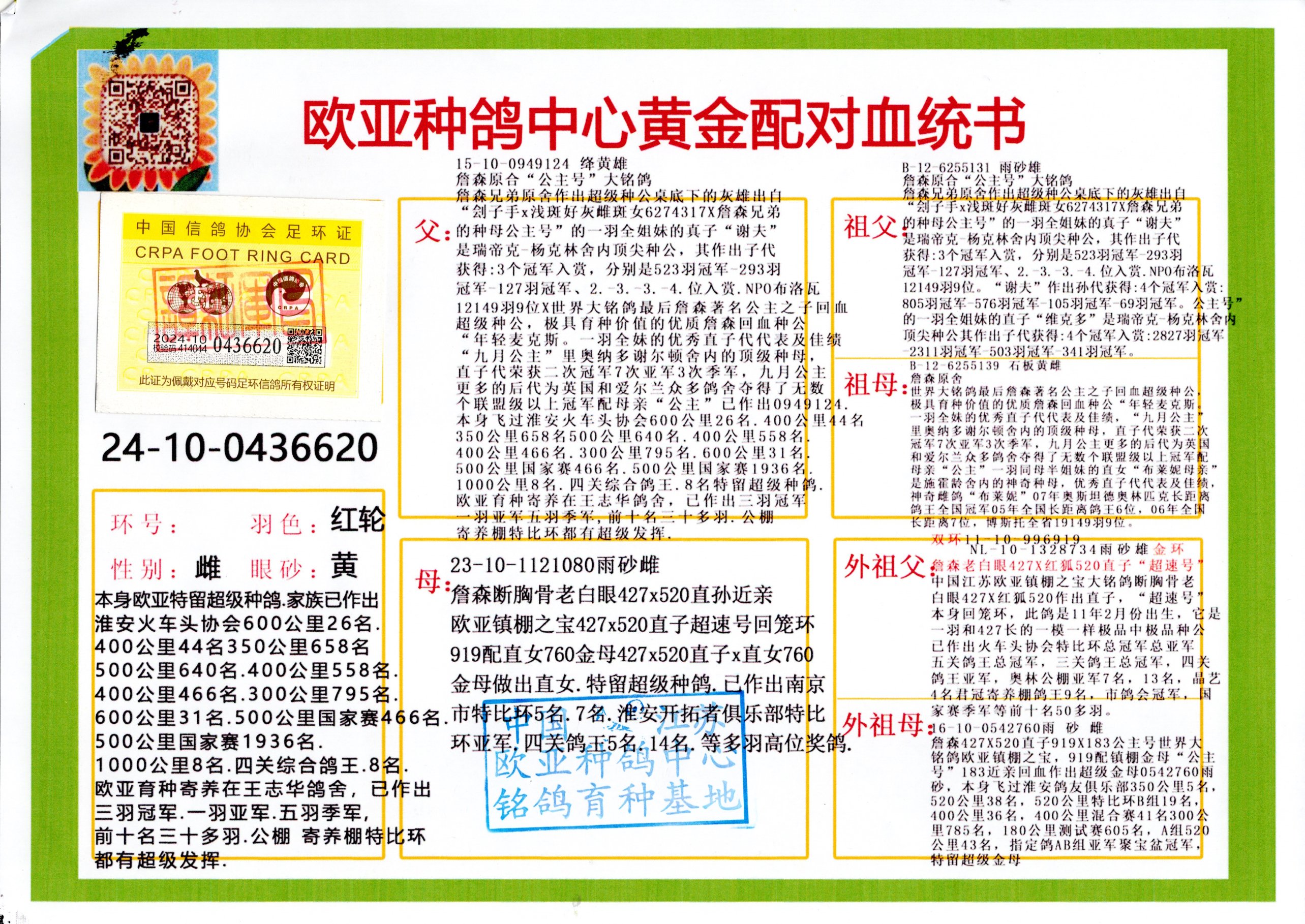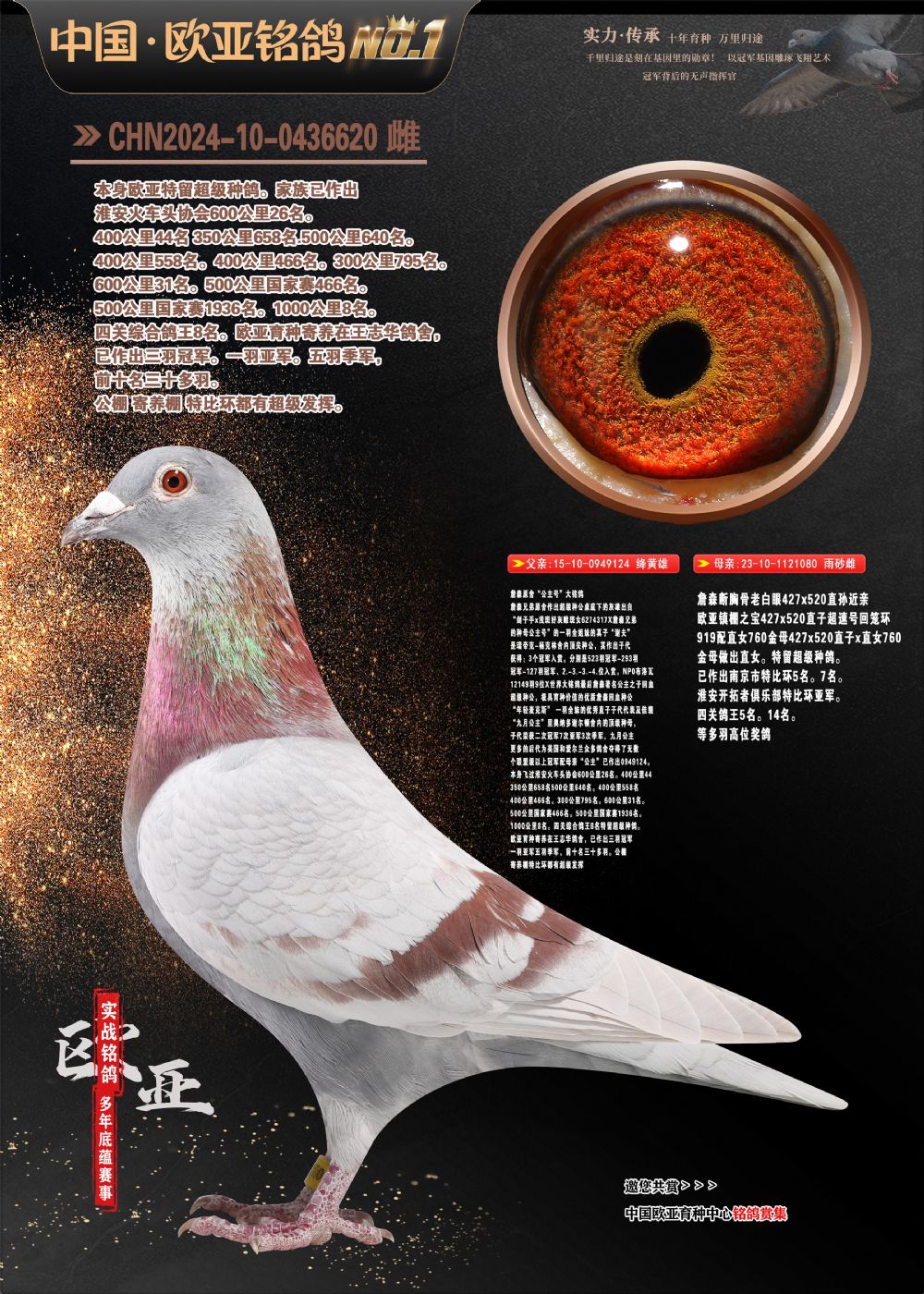24年秋南京特比环欧亚荣获大团体冠军.小团体冠军551公里大特比13名.14名.16名.19名.20名.21名.24名.26名.27名.28名.42名.52名.54名.57名.65名.66名.68名.70名.71名.72名.74名.76名.80名.82名.83名.84名.85名.86名.90名.92名.110名.116名.121名.122名.128名.131名.158名.161名.164名.165名.166名.172名.174名.177名.182名.195名.196名.201名.205名.208名.210名.216名.253名.269名.275名.276名.294名.296名.299名,,24年秋云南天南铜都公棚决赛415名.天南铜都小棚决赛409名.云南玉活公棚决赛102名.490名.团体32名上笼二羽进二羽,天南铜都大棚506公里决赛445名。热烈祝贺河北省巨鹿县李兰生老师用欧亚泰山号血系连续十一年夺冠军,河北省国家赛冠军.全国季军等多次前十名高位,扬州王军王总用欧亚利奥24年春季获山东翔宇公棚决赛33名盖比53名。南京刘正龙刘总用欧亚盖比获得24年秋山东潍坊国际公棚决赛42名.精英赛30名.三关鸽王71名.决赛86名.加站赛16名.南京市特比环A组鸽王9名.B组鸽王5名.6名.C组鸽王5名.精英赛冠军4名.技能赛A组冠军4名.5名.秦淮区特比环荣获15名.46名.48名.87名。四川西昌徐亮徐总用欧亚利奥获得凉山州聚友决赛177名.第二关亚军双关鸽王19名.三关鸽王105名.云南豪庭公棚决赛603名。热烈祝贺24年四川重庆翔园鸽舍用欧亚泰山号荣获春季400公里冠军.秋季500公里冠军,河北王总用詹森X利奥获得千羽千翔公棚400公里冠军,广东蔡楷焕荣获24年秋爱好者 赛鸽俱乐部三关鸽王季军.一关420公里99名.二关450公里11名.三关520公里32名.单关季军.7名.12名,江西李卫兴荣获贵州红枫公棚8名.共翔俱乐部寄养棚四关综合鸽王30名.一关400公里78名.二关500公里55名.三关520公里37名.四关500公里57名.同父母获公棚18名.雷鸣获得武汉黄浦育翔中心冠军,四川陈文获得四川明鸿俱乐部300公里梦幻2名.3名.4名.9名.10名.13名.14名.15名.31名.34名.40名.41名.42名.43名.69名.71名.72名.73名.74名.94名.95名.97名.98名.99名.419公里决赛荣获总冠军7名.总共归巢9羽,四川徐亮获豪庭决赛603名,山西郑勇获得山西泰鑫公棚决赛255名詹森红狐,热烈祝贺马总获得开尔(飞跃队)决赛9名获奖金1310000万元.第一关52名,天津津福资赛180公里96名.获奖金429543万元,欧亚支持全国鸽友24年秋多人报喜 祝大家取得更好成绩,给欧亚报喜鸽友欧亚决定给每人赠送一羽超级种鸽。欧亚俱乐部特比环多关鸽王成绩:15年秋淮安特比环黑色星期一全会上笼9700多羽,当天无鸽归巢,第二天全会归巢357羽,本舍归巢158羽.前十名八羽.前一百名归巢57羽,16年春季获五关鸽王总冠军,总亚军四名.六名.七名.九名.十名.晶艺俱乐部520公里冠亚季军5名.6名.7名.9名.11名等,火车头冠军.季军6名.8名.9名.10名,16年秋晶艺俱乐部特比环520公里亚军.季军4名.6名.7名.9名,15年春南京白下特比环冠军.亚军.季军6名.7名.8名.9名.10名.指定鸽A B组获得冠军.亚军.季军4名.5名.,17年淮安特比环亚军.4名.5名.7名.8名.10名.六关鸽王总冠军.4名.6名.9名.10名,寄养棚宿迁刘总20羽特比环获冠军.季军.4名.7名.8名.9名等。18年荣获万羽特比环六关鸽王总冠军.总亚军.总季军.6名.8名.十名.单关四羽冠军.二羽亚军.四羽季军.前十名27羽。19年秋万羽特比环六关鸽王总亚军.总季军.5名.8名等,单关二羽冠军.三羽亚军.一羽季军前十名31羽。20年秋淮安市鸽会四关特比环大赛风雨无阻鸽王亚军.鸽王六名,金品俱乐部万羽特比环六关鸽王总冠军,总亚军.四名.五名.六名.七名.八名.十名.前二百名鸽王35羽,单关冠亚季军前十名四十多羽,火车头五关鸽王季军.六名.八名.前二百名鸽王十七羽。20年春荣获淮安五区一市四关鸽王总冠军.亚军.四名.八名.九名。21年秋荣获金品万羽特比环大赛六关鸽王总亚军.总季军.四名.七名.九名.十名.单关冠亚军季军前十名三十多羽。火车头协会鸽王六名.七名.十名.单关前十名十七羽。22年秋荣获鸽王总冠军.总亚军.5名.7名.8名.9名.11名.单关冠亚季军前十名三十多羽,第一关单关前二百名四十多羽,第二关前二百名三十多羽,第三关前二百名四十多羽,第四关前二百名四十多羽,第五关前一百名53羽。23年秋荣获鸽王季军.五名.八名.十名.13名.17名.20名.27名等多羽鸽王.单关前十名二十多羽。公棚.寄养棚部分成绩:16年秋宁夏黄河公棚总冠军电脑戈马力指定通炮冠军,17年送八羽参赛获得鸽王八名进奖四名,支持韩总荣获八名。支持鸽友荣获宁夏中卫公棚决赛总冠军.精英赛冠军,支持18年宁夏黄河公棚决赛冠军詹森X泰山。安徽鼎博寄养棚院内外四关鸽王总冠军.鸽王十七名.三十七名同窝,鸽王39名.42名.58名.67名。18年山东公棚预赛冠军.决赛65名.送八羽进奖五羽.指定获奔驰汽车一辆。支持鸽友获得云南蓝云公棚冠军.盖比X佛卡门。支持鸽友荣获云南银集公棚决赛冠军 詹森427X520血系 速度赛6700羽冠军。17年荣获金马俱乐部寄养棚四关鸽王总冠军.季军.六名.八名.第一关冠军.亚军.季军四名.七名.十一名.金牌教练奖。支持鸽友18年北京费翔公棚预赛九名电脑X桑杰士,支持鸽友荣获陕西威力公棚决赛11名.内蒙古临河寄养棚四关鸽王六名.詹森配泰山,支持河北王总用欧亚詹森427配胡本喜获20年秋开尔青年棚季军。云南东荣公棚16年预赛冠军.决赛77名.17年决赛12名.詹森红狐X泰山,17年平安公棚决赛4名 詹森427。欧亚获得21年金母寄养棚第一关四名.第二关5名.第三关5名.6名.7名.10名.三关鸽王总冠军,四关鸽王14名.十羽鸽王。支持河