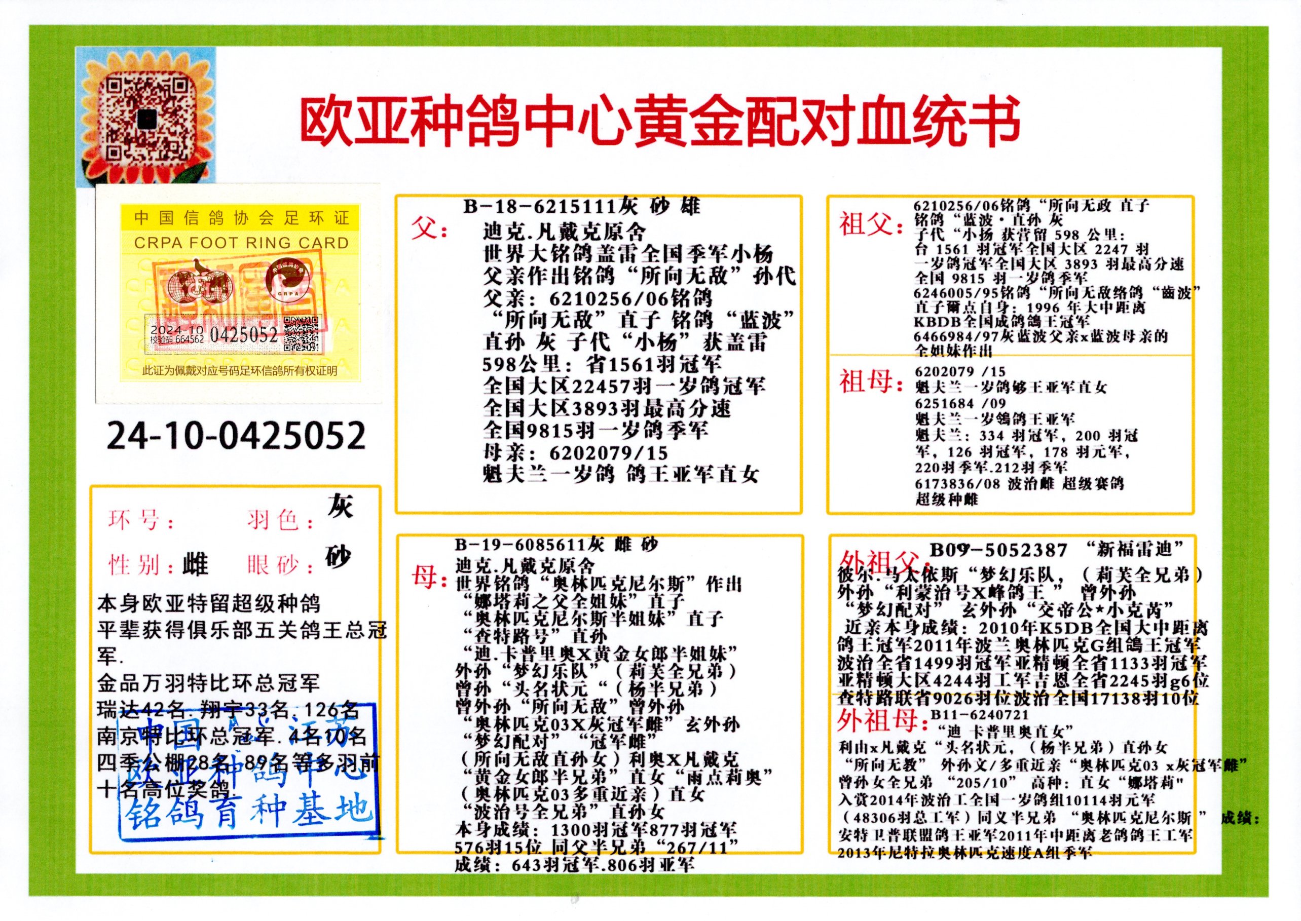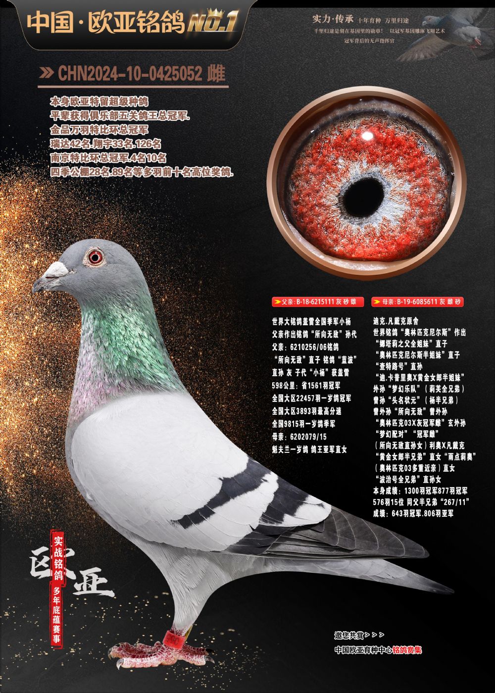 24年秋南京特比环欧亚荣获大团体冠军.小团体冠军551公里大特比13名.14名.16名.19名.20名.21名.24名.26名.27名.28名.42名.52名.54名.57名.65名.66名.68名.70名.71名.72名.74名.76名.80名.82名.83名.84名.85名.86名.90名.92名.110名.116名.121名.122名.128名.131名.158名.161名.164名.165名.166名.172名.174名.177名.182名.195名.196名.201名.205名.208名.210名.216名.253名.269名.275名.276名.294名.296名.299名,,24年秋云南天南铜都公棚决赛415名.天南铜都小棚决赛409名.云南玉活公棚决赛102名.490名.团体32名上笼二羽进二羽,天南铜都大棚506公里决赛445名。热烈祝贺河北省巨鹿县李兰生老师用欧亚泰山号血系连续十一年夺冠军,河北省国家赛冠军.全国季军等多次前十名高位,扬州王军王总用欧亚利奥24年春季获山东翔宇公棚决赛33名盖比53名。南京刘正龙刘总用欧亚盖比获得24年秋山东潍坊国际公棚决赛42名.精英赛30名.三关鸽王71名.决赛86名.加站赛16名.南京市特比环A组鸽王9名.B组鸽王5名.6名.C组鸽王5名.精英赛冠军4名.技能赛A组冠军4名.5名.秦淮区特比环荣获15名.46名.48名.87名。四川西昌徐亮徐总用欧亚利奥获得凉山州聚友决赛177名.第二关亚军双关鸽王19名.三关鸽王105名.云南豪庭公棚决赛603名。热烈祝贺24年四川重庆翔园鸽舍用欧亚泰山号荣获春季400公里冠军.秋季500公里冠军,河北王总用詹森X利奥获得千羽千翔公棚400公里冠军,广东蔡楷焕荣获24年秋爱好者 赛鸽俱乐部三关鸽王季军.一关420公里99名.二关450公里11名.三关520公里32名.单关季军.7名.12名,江西李卫兴荣获贵州红枫公棚8名.共翔俱乐部寄养棚四关综合鸽王30名.一关400公里78名.二关500公里55名.三关520公里37名.四关500公里57名.同父母获公棚18名.雷鸣获得武汉黄浦育翔中心冠军,四川陈文获得四川明鸿俱乐部300公里梦幻2名.3名.4名.9名.10名.13名.14名.15名.31名.34名.40名.41名.42名.43名.69名.71名.72名.73名.74名.94名.95名.97名.98名.99名.419公里决赛荣获总冠军7名.总共归巢9羽,四川徐亮获豪庭决赛603名,山西郑勇获得山西泰鑫公棚决赛255名詹森红狐,热烈祝贺马总获得开尔(飞跃队)决赛9名获奖金1310000万元.第一关52名,天津津福资赛180公里96名.获奖金429543万元,欧亚支持全国鸽友24年秋多人报喜 祝大家取得更好成绩,给欧亚报喜鸽友欧亚决定给每人赠送一羽超级种鸽。欧亚俱乐部特比环多关鸽王成绩:15年秋淮安特比环黑色星期一全会上笼9700多羽,当天无鸽归巢,第二天全会归巢357羽,本舍归巢158羽.前十名八羽.前一百名归巢57羽,16年春季获五关鸽王总冠军,总亚军四名.六名.七名.九名.十名.晶艺俱乐部520公里冠亚季军5名.6名.7名.9名.11名等,火车头冠军.季军6名.8名.9名.10名,16年秋晶艺俱乐部特比环520公里亚军.季军4名.6名.7名.9名,15年春南京白下特比环冠军.亚军.季军6名.7名.8名.9名.10名.指定鸽A B组获得冠军.亚军.季军4名.5名.,17年淮安特比环亚军.4名.5名.7名.8名.10名.六关鸽王总冠军.4名.6名.9名.10名,寄养棚宿迁刘总20羽特比环获冠军.季军.4名.7名.8名.9名等。18年荣获万羽特比环六关鸽王总冠军.总亚军.总季军.6名.8名.十名.单关四羽冠军.二羽亚军.四羽季军.前十名27羽。19年秋万羽特比环六关鸽王总亚军.总季军.5名.8名等,单关二羽冠军.三羽亚军.一羽季军前十名31羽。20年秋淮安市鸽会四关特比环大赛风雨无阻鸽王亚军.鸽王六名,金品俱乐部万羽特比环六关鸽王总冠军,总亚军.四名.五名.六名.七名.八名.十名.前二百名鸽王35羽,单关冠亚季军前十名四十多羽,火车头五关鸽王季军.六名.八名.前二百名鸽王十七羽。20年春荣获淮安五区一市四关鸽王总冠军.亚军.四名.八名.九名。21年秋荣获金品万羽特比环大赛六关鸽王总亚军.总季军.四名.七名.九名.十名.单关冠亚军季军前十名三十多羽。火车头协会鸽王六名.七名.十名.单关前十名十七羽。22年秋荣获鸽王总冠军.总亚军.5名.7名.8名.9名.11名.单关冠亚季军前十名三十多羽,第一关单关前二百名四十多羽,第二关前二百名三十多羽,第三关前二百名四十多羽,第四关前二百名四十多羽,第五关前一百名53羽。23年秋荣获鸽王季军.五名.八名.十名.13名.17名.20名.27名等多羽鸽王.单关前十名二十多羽。公棚.寄养棚部分成绩:16年秋宁夏黄河公棚总冠军电脑戈马力指定通炮冠军,17年送八羽参赛获得鸽王八名进奖四名,支持韩总荣获八名。支持鸽友荣获宁夏中卫公棚决赛总冠军.精英赛冠军,支持18年宁夏黄河公棚决赛冠军詹森X泰山。安徽鼎博寄养棚院内外四关鸽王总冠军.鸽王十七名.三十七名同窝,鸽王39名.42名.58名.67名。18年山东公棚预赛冠军.决赛65名.送八羽进奖五羽.指定获奔驰汽车一辆。支持鸽友获得云南蓝云公棚冠军.盖比X佛卡门。支持鸽友荣获云南银集公棚决赛冠军 詹森427X520血系 速度赛6700羽冠军。17年荣获金马俱乐部寄养棚四关鸽王总冠军.季军.六名.八名.第一关冠军.亚军.季军四名.七名.十一名.金牌教练奖。支持鸽友18年北京费翔公棚预赛九名电脑X桑杰士,支持鸽友荣获陕西威力公棚决赛11名.内蒙古临河寄养棚四关鸽王六名.詹森配泰山,支持河北王总用欧亚詹森427配胡本喜获20年秋开尔青年棚季军。云南东荣公棚16年预赛冠军.决赛77名.17年决赛12名.詹森红狐X泰山,17年平安公棚决赛4名 詹森427。欧亚获得21年金母寄养棚第一关四名.第二关5名.第三关5名.6名.7名.10名.三关鸽王总冠军,四关鸽王14名.十羽鸽王。支持河