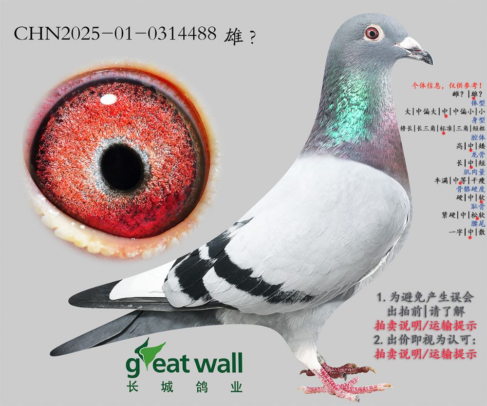 因拍卖鸽均是未做育过的种鸽或幼鸽,图内所标雌雄仅供参考,实际性别已实物为准。不做退换理由。