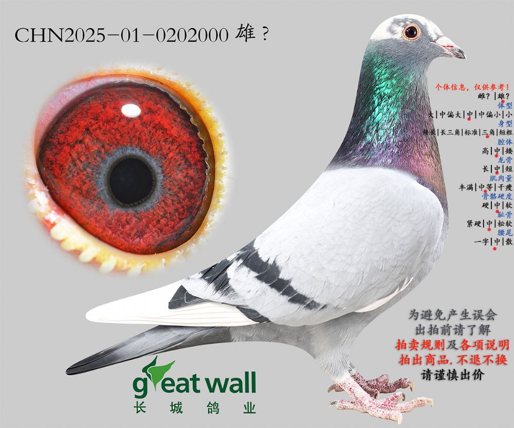 因拍卖鸽均是未做育过的种鸽或幼鸽,图内所标雌雄仅供参考,实际性别已实物为准。不做退换理由。