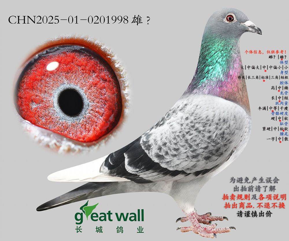 因拍卖鸽均是未做育过的种鸽或幼鸽,图内所标雌雄仅供参考,实际性别已实物为准。不做退换理由。