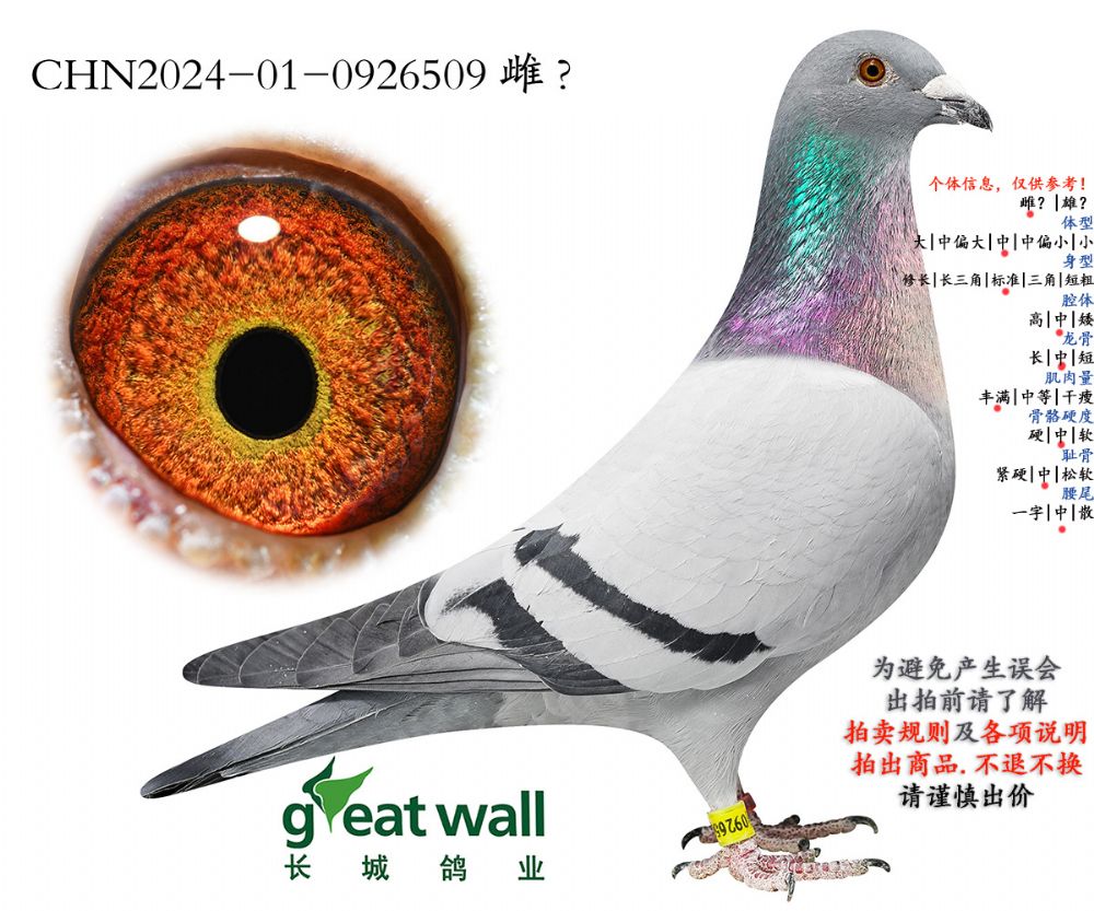 因拍卖鸽均是未做育过的种鸽或幼鸽,图内所标雌雄仅供参考,实际性别已实物为准。不做退换理由。