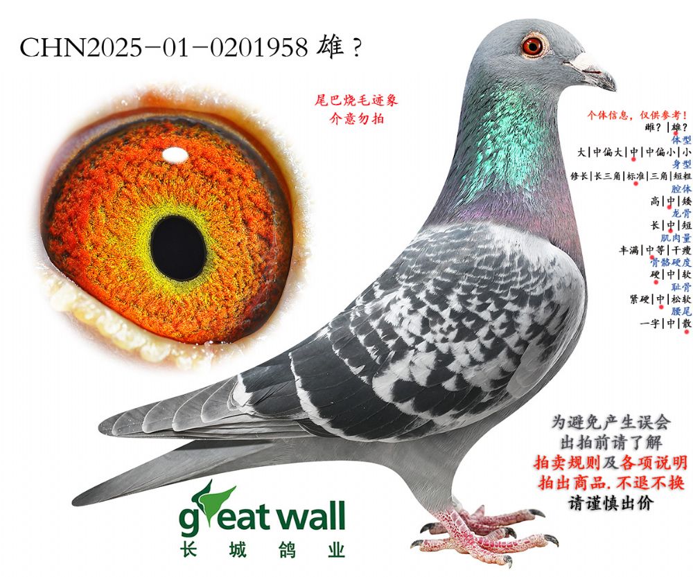 因拍卖鸽均是未做育过的种鸽或幼鸽,图内所标雌雄仅供参考,实际性别已实物为准。不做退换理由。