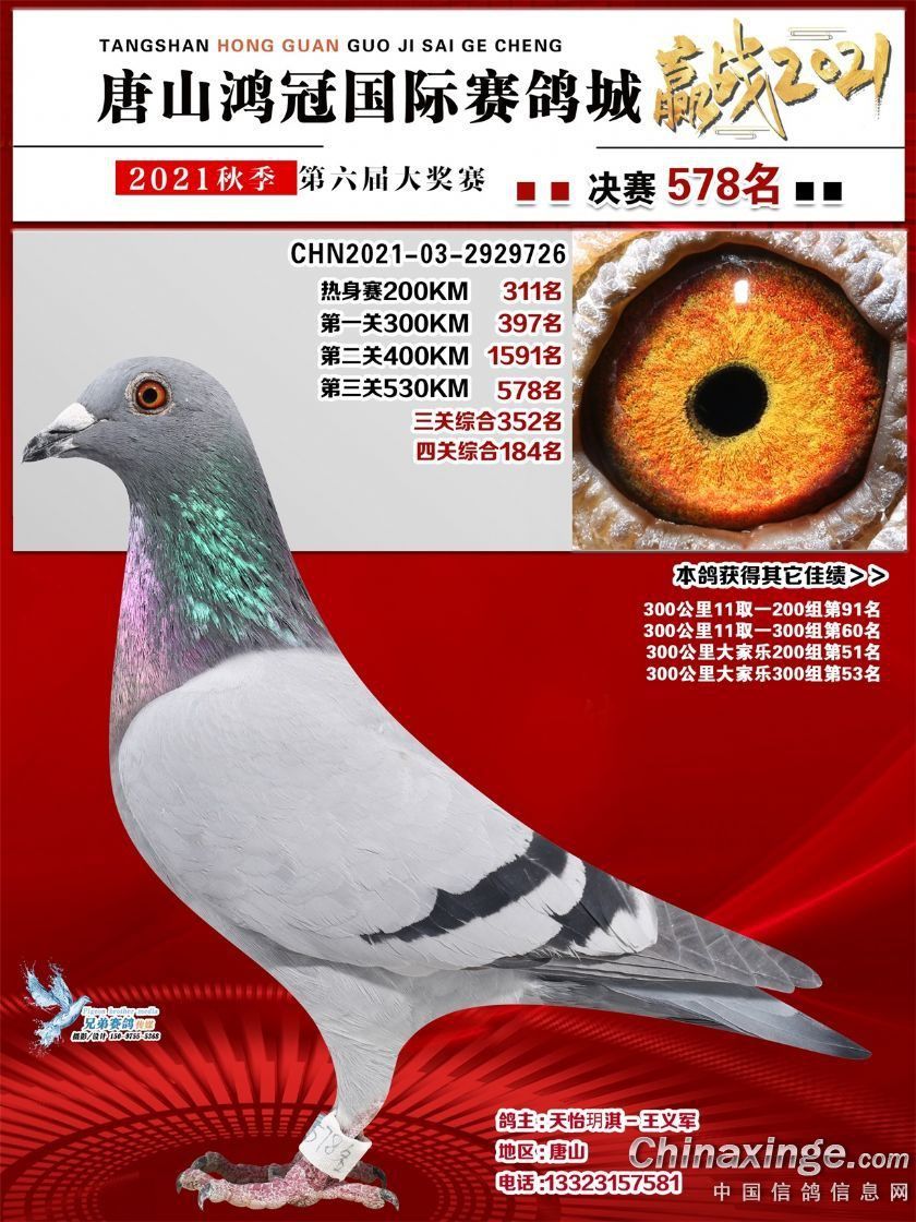 唐山鸿冠国际赛鸽城530公里决赛578名;参与指定:1800元;