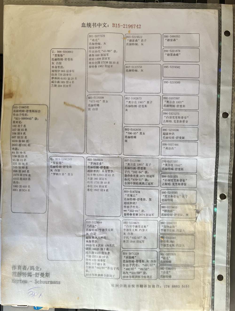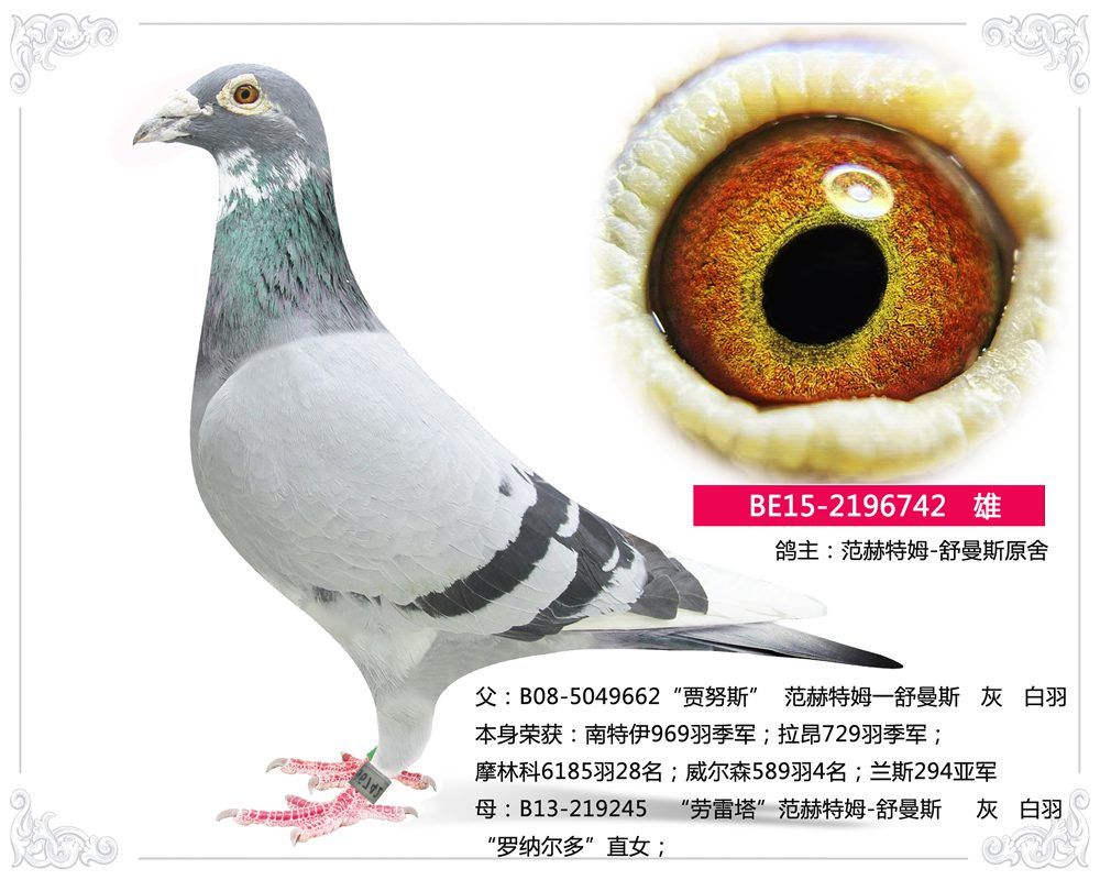 父:B08-5049662“贾努斯” 范赫特姆一舒曼斯 灰 白羽 本身荣获:南特伊969羽季军;拉昂729羽季军;摩林科6185羽28名;威尔森589羽4名;兰斯294亚军