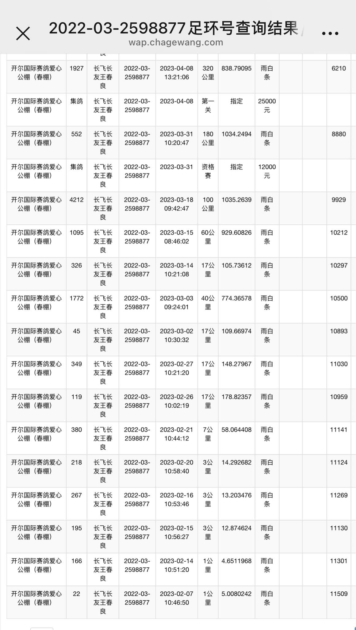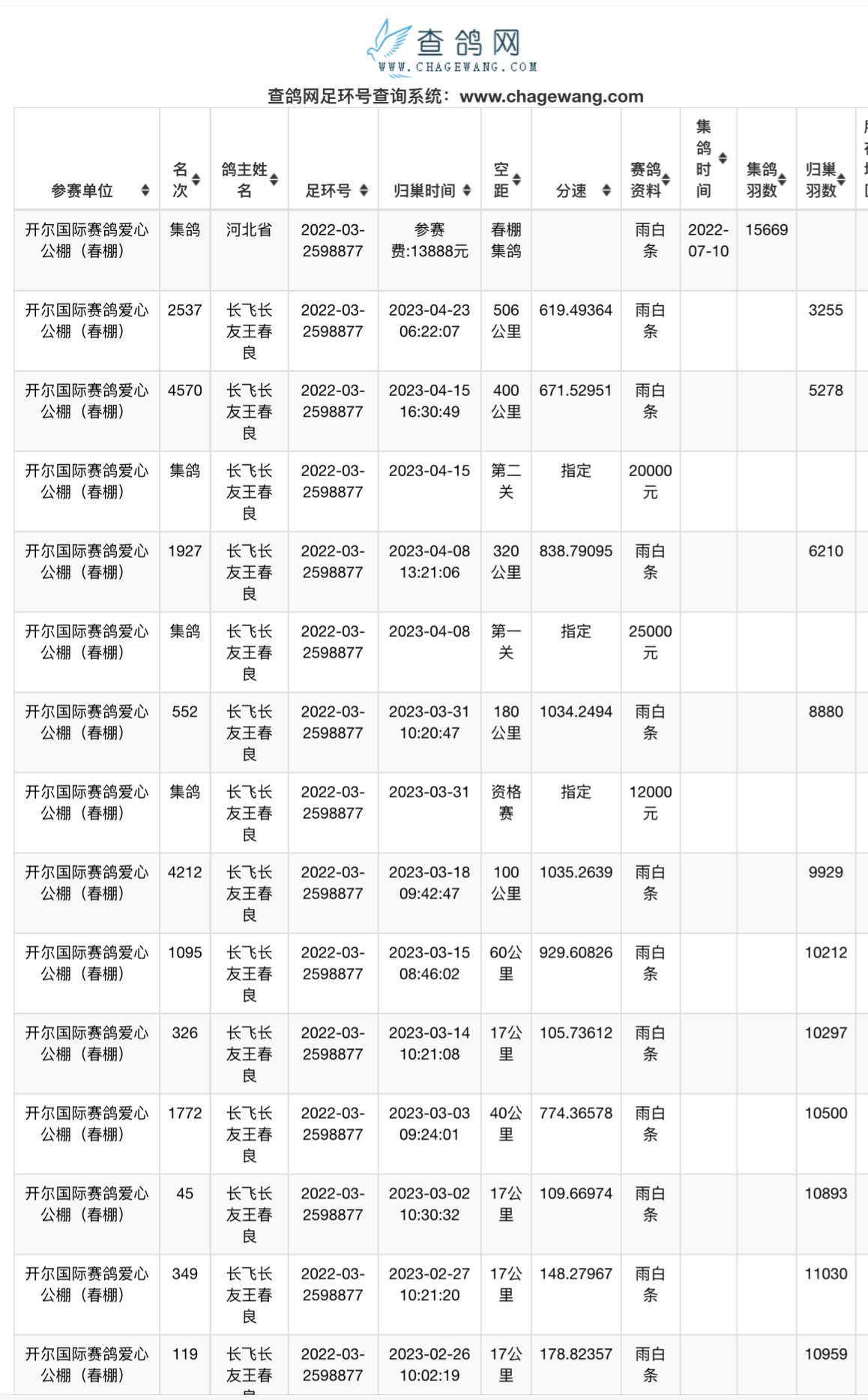 开尔国际赛鸽爱心公棚(春棚)第二关400公里4570名;参与指定:20000元;