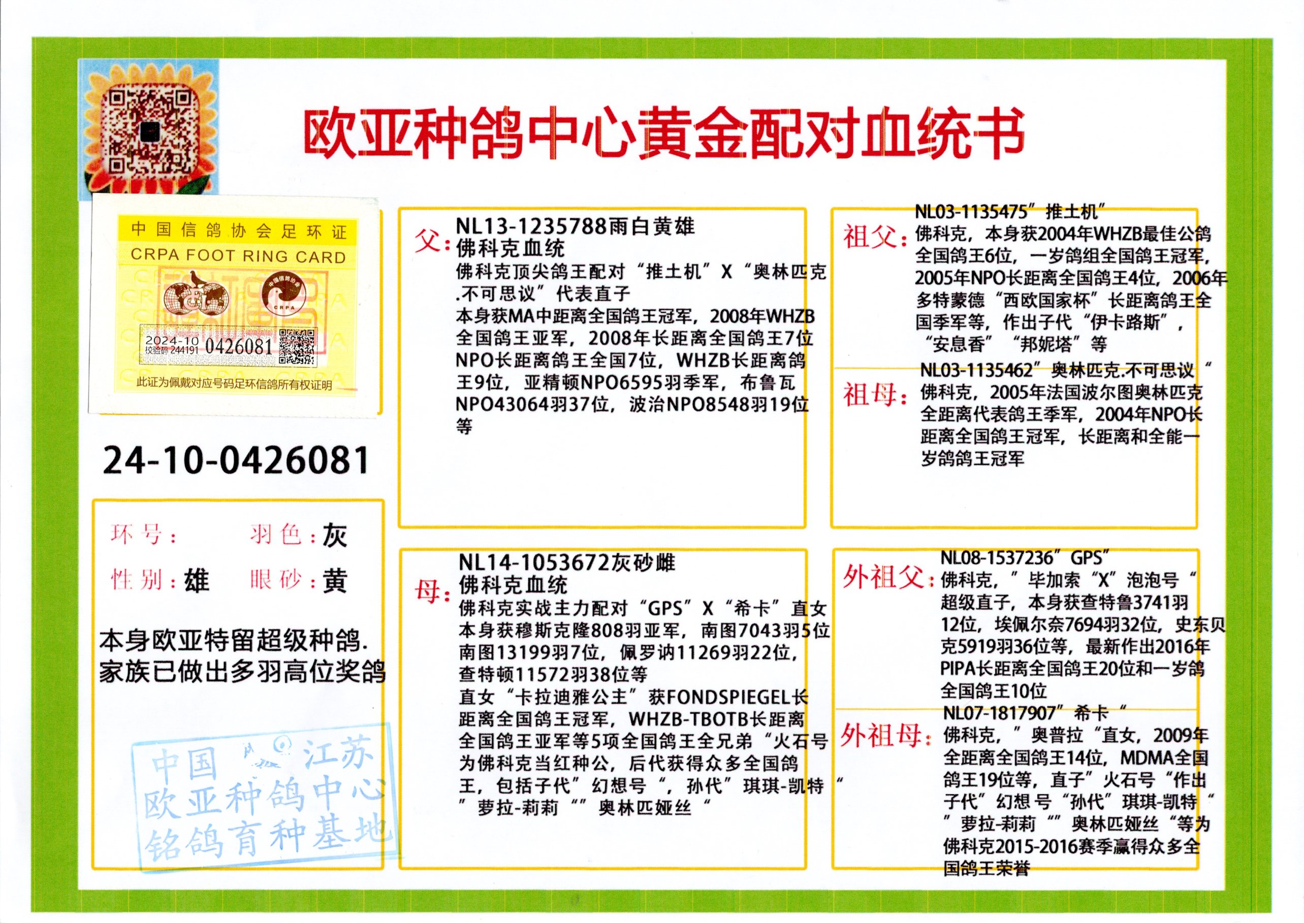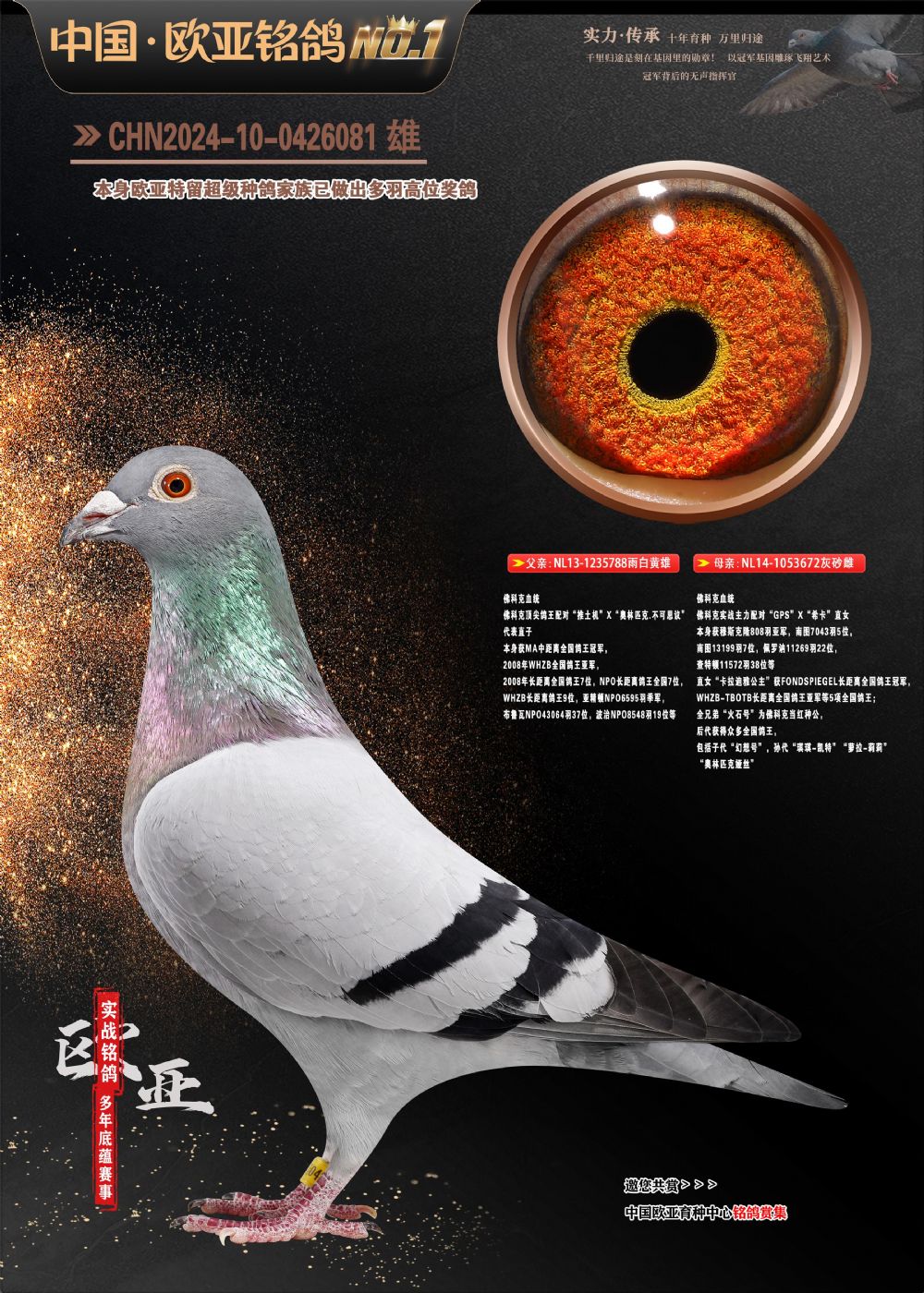 24年秋南京特比环欧亚荣获大团体冠军.小团体冠军551公里大特比13名.14名.16名.19名.20名.21名.24名.26名.27名.28名.42名.52名.54名.57名.65名.66名.68名.70名.71名.72名.74名.76名.80名.82名.83名.84名.85名.86名.90名.92名.110名.116名.121名.122名.128名.131名.158名.161名.164名.165名.166名.172名.174名.177名.182名.195名.196名.201名.205名.208名.210名.216名.253名.269名.275名.276名.294名.296名.299名,,24年秋云南天南铜都公棚决赛415名.天南铜都小棚决赛409名.云南玉活公棚决赛102名.490名.团体32名上笼二羽进二羽,天南铜都大棚506公里决赛445名。热烈祝贺河北省巨鹿县李兰生老师用欧亚泰山号血系连续十一年夺冠军,河北省国家赛冠军.全国季军等多次前十名高位,扬州王军王总用欧亚利奥24年春季获山东翔宇公棚决赛33名盖比53名。南京刘正龙刘总用欧亚盖比获得24年秋山东潍坊国际公棚决赛42名.精英赛30名.三关鸽王71名.决赛86名.加站赛16名.南京市特比环A组鸽王9名.B组鸽王5名.6名.C组鸽王5名.精英赛冠军4名.技能赛A组冠军4名.5名.秦淮区特比环荣获15名.46名.48名.87名。四川西昌徐亮徐总用欧亚利奥获得凉山州聚友决赛177名.第二关亚军双关鸽王19名.三关鸽王105名.云南豪庭公棚决赛603名。热烈祝贺24年四川重庆翔园鸽舍用欧亚泰山号荣获春季400公里冠军.秋季500公里冠军,河北王总用詹森X利奥获得千羽千翔公棚400公里冠军,广东蔡楷焕荣获24年秋爱好者 赛鸽俱乐部三关鸽王季军.一关420公里99名.二关450公里11名.三关520公里32名.单关季军.7名.12名,江西李卫兴荣获贵州红枫公棚8名.共翔俱乐部寄养棚四关综合鸽王30名.一关400公里78名.二关500公里55名.三关520公里37名.四关500公里57名.同父母获公棚18名.雷鸣获得武汉黄浦育翔中心冠军,四川陈文获得四川明鸿俱乐部300公里梦幻2名.3名.4名.9名.10名.13名.14名.15名.31名.34名.40名.41名.42名.43名.69名.71名.72名.73名.74名.94名.95名.97名.98名.99名.419公里决赛荣获总冠军7名.总共归巢9羽,四川徐亮获豪庭决赛603名,山西郑勇获得山西泰鑫公棚决赛255名詹森红狐,热烈祝贺马总获得开尔(飞跃队)决赛9名获奖金1310000万元.第一关52名,天津津福资赛180公里96名.获奖金429543万元,欧亚支持全国鸽友24年秋多人报喜 祝大家取得更好成绩,给欧亚报喜鸽友欧亚决定给每人赠送一羽超级种鸽。欧亚俱乐部特比环多关鸽王成绩:15年秋淮安特比环黑色星期一全会上笼9700多羽,当天无鸽归巢,第二天全会归巢357羽,本舍归巢158羽.前十名八羽.前一百名归巢57羽,16年春季获五关鸽王总冠军,总亚军四名.六名.七名.九名.十名.晶艺俱乐部520公里冠亚季军5名.6名.7名.9名.11名等,火车头冠军.季军6名.8名.9名.10名,16年秋晶艺俱乐部特比环520公里亚军.季军4名.6名.7名.9名,15年春南京白下特比环冠军.亚军.季军6名.7名.8名.9名.10名.指定鸽A B组获得冠军.亚军.季军4名.5名.,17年淮安特比环亚军.4名.5名.7名.8名.10名.六关鸽王总冠军.4名.6名.9名.10名,寄养棚宿迁刘总20羽特比环获冠军.季军.4名.7名.8名.9名等。18年荣获万羽特比环六关鸽王总冠军.总亚军.总季军.6名.8名.十名.单关四羽冠军.二羽亚军.四羽季军.前十名27羽。19年秋万羽特比环六关鸽王总亚军.总季军.5名.8名等,单关二羽冠军.三羽亚军.一羽季军前十名31羽。20年秋淮安市鸽会四关特比环大赛风雨无阻鸽王亚军.鸽王六名,金品俱乐部万羽特比环六关鸽王总冠军,总亚军.四名.五名.六名.七名.八名.十名.前二百名鸽王35羽,单关冠亚季军前十名四十多羽,火车头五关鸽王季军.六名.八名.前二百名鸽王十七羽。20年春荣获淮安五区一市四关鸽王总冠军.亚军.四名.八名.九名。21年秋荣获金品万羽特比环大赛六关鸽王总亚军.总季军.四名.七名.九名.十名.单关冠亚军季军前十名三十多羽。火车头协会鸽王六名.七名.十名.单关前十名十七羽。22年秋荣获鸽王总冠军.总亚军.5名.7名.8名.9名.11名.单关冠亚季军前十名三十多羽,第一关单关前二百名四十多羽,第二关前二百名三十多羽,第三关前二百名四十多羽,第四关前二百名四十多羽,第五关前一百名53羽。23年秋荣获鸽王季军.五名.八名.十名.13名.17名.20名.27名等多羽鸽王.单关前十名二十多羽。公棚.寄养棚部分成绩:16年秋宁夏黄河公棚总冠军电脑戈马力指定通炮冠军,17年送八羽参赛获得鸽王八名进奖四名,支持韩总荣获八名。支持鸽友荣获宁夏中卫公棚决赛总冠军.精英赛冠军,支持18年宁夏黄河公棚决赛冠军詹森X泰山。安徽鼎博寄养棚院内外四关鸽王总冠军.鸽王十七名.三十七名同窝,鸽王39名.42名.58名.67名。18年山东公棚预赛冠军.决赛65名.送八羽进奖五羽.指定获奔驰汽车一辆。支持鸽友获得云南蓝云公棚冠军.盖比X佛卡门。支持鸽友荣获云南银集公棚决赛冠军 詹森427X520血系 速度赛6700羽冠军。17年荣获金马俱乐部寄养棚四关鸽王总冠军.季军.六名.八名.第一关冠军.亚军.季军四名.七名.十一名.金牌教练奖。支持鸽友18年北京费翔公棚预赛九名电脑X桑杰士,支持鸽友荣获陕西威力公棚决赛11名.内蒙古临河寄养棚四关鸽王六名.詹森配泰山,支持河北王总用欧亚詹森427配胡本喜获20年秋开尔青年棚季军。云南东荣公棚16年预赛冠军.决赛77名.17年决赛12名.詹森红狐X泰山,17年平安公棚决赛4名 詹森427。欧亚获得21年金母寄养棚第一关四名.第二关5名.第三关5名.6名.7名.10名.三关鸽王总冠军,四关鸽王14名.十羽鸽王。支持河