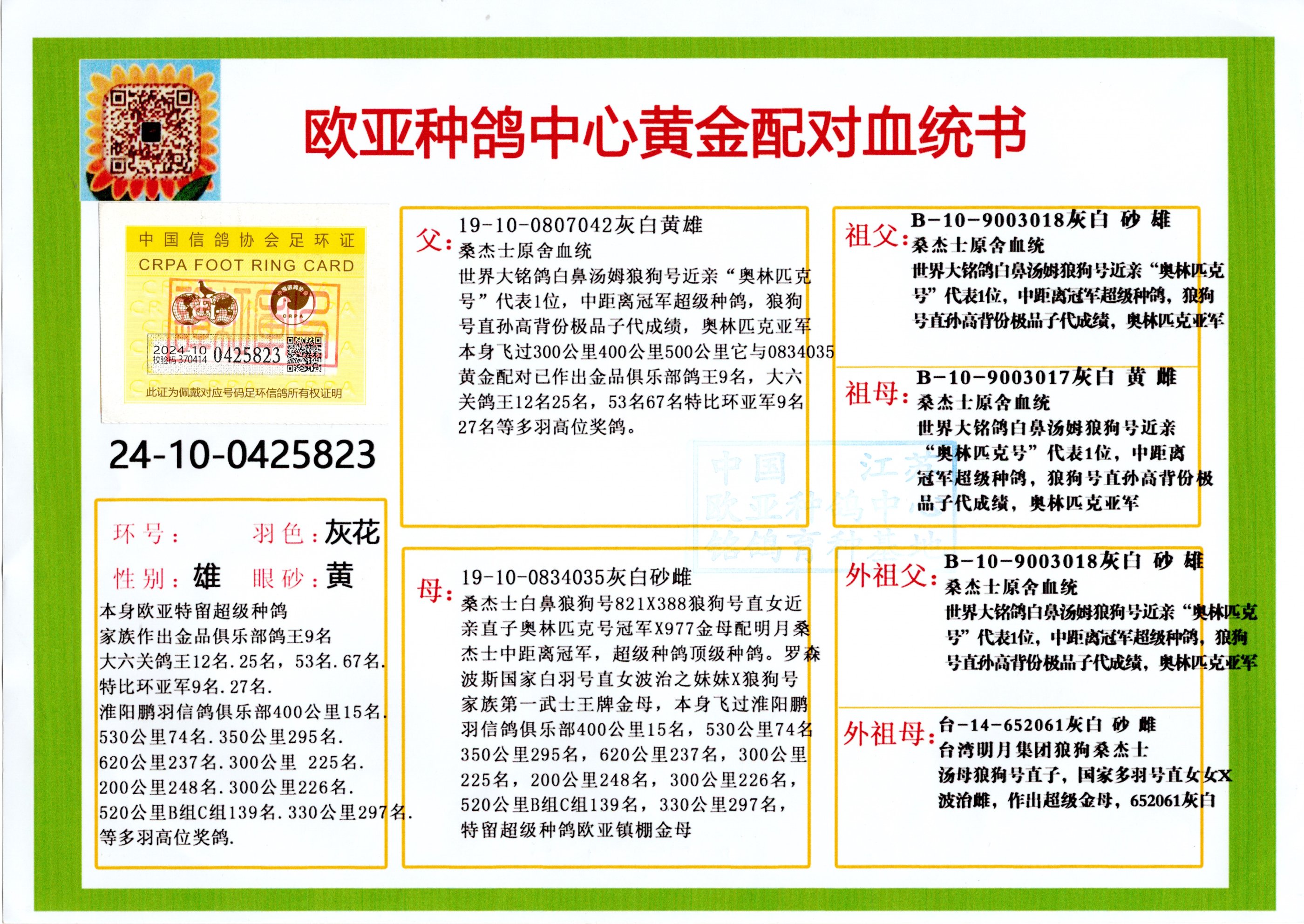 24年秋南京特比环欧亚荣获大团体冠军.小团体冠军551公里大特比13名.14名.16名.19名.20名.21名.24名.26名.27名.28名.42名.52名.54名.57名.65名.66名.68名.70名.71名.72名.74名.76名.80名.82名.83名.84名.85名.86名.90名.92名.110名.116名.121名.122名.128名.131名.158名.161名.164名.165名.166名.172名.174名.177名.182名.195名.196名.201名.205名.208名.210名.216名.253名.269名.275名.276名.294名.296名.299名,,24年秋云南天南铜都公棚决赛415名.天南铜都小棚决赛409名.云南玉活公棚决赛102名.490名.团体32名上笼二羽进二羽,天南铜都大棚506公里决赛445名。热烈祝贺河北省巨鹿县李兰生老师用欧亚泰山号血系连续十一年夺冠军,河北省国家赛冠军.全国季军等多次前十名高位,扬州王军王总用欧亚利奥24年春季获山东翔宇公棚决赛33名盖比53名。南京刘正龙刘总用欧亚盖比获得24年秋山东潍坊国际公棚决赛42名.精英赛30名.三关鸽王71名.决赛86名.加站赛16名.南京市特比环A组鸽王9名.B组鸽王5名.6名.C组鸽王5名.精英赛冠军4名.技能赛A组冠军4名.5名.秦淮区特比环荣获15名.46名.48名.87名。四川西昌徐亮徐总用欧亚利奥获得凉山州聚友决赛177名.第二关亚军双关鸽王19名.三关鸽王105名.云南豪庭公棚决赛603名。热烈祝贺24年四川重庆翔园鸽舍用欧亚泰山号荣获春季400公里冠军.秋季500公里冠军,河北王总用詹森X利奥获得千羽千翔公棚400公里冠军,广东蔡楷焕荣获24年秋爱好者 赛鸽俱乐部三关鸽王季军.一关420公里99名.二关450公里11名.三关520公里32名.单关季军.7名.12名,江西李卫兴荣获贵州红枫公棚8名.共翔俱乐部寄养棚四关综合鸽王30名.一关400公里78名.二关500公里55名.三关520公里37名.四关500公里57名.同父母获公棚18名.雷鸣获得武汉黄浦育翔中心冠军,四川陈文获得四川明鸿俱乐部300公里梦幻2名.3名.4名.9名.10名.13名.14名.15名.31名.34名.40名.41名.42名.43名.69名.71名.72名.73名.74名.94名.95名.97名.98名.99名.419公里决赛荣获总冠军7名.总共归巢9羽,四川徐亮获豪庭决赛603名,山西郑勇获得山西泰鑫公棚决赛255名詹森红狐,热烈祝贺马总获得开尔(飞跃队)决赛9名获奖金1310000万元.第一关52名,天津津福资赛180公里96名.获奖金429543万元,欧亚支持全国鸽友24年秋多人报喜 祝大家取得更好成绩,给欧亚报喜鸽友欧亚决定给每人赠送一羽超级种鸽。欧亚俱乐部特比环多关鸽王成绩:15年秋淮安特比环黑色星期一全会上笼9700多羽,当天无鸽归巢,第二天全会归巢357羽,本舍归巢158羽.前十名八羽.前一百名归巢57羽,16年春季获五关鸽王总冠军,总亚军四名.六名.七名.九名.十名.晶艺俱乐部520公里冠亚季军5名.6名.7名.9名.11名等,火车头冠军.季军6名.8名.9名.10名,16年秋晶艺俱乐部特比环520公里亚军.季军4名.6名.7名.9名,15年春南京白下特比环冠军.亚军.季军6名.7名.8名.9名.10名.指定鸽A B组获得冠军.亚军.季军4名.5名.,17年淮安特比环亚军.4名.5名.7名.8名.10名.六关鸽王总冠军.4名.6名.9名.10名,寄养棚宿迁刘总20羽特比环获冠军.季军.4名.7名.8名.9名等。18年荣获万羽特比环六关鸽王总冠军.总亚军.总季军.6名.8名.十名.单关四羽冠军.二羽亚军.四羽季军.前十名27羽。19年秋万羽特比环六关鸽王总亚军.总季军.5名.8名等,单关二羽冠军.三羽亚军.一羽季军前十名31羽。20年秋淮安市鸽会四关特比环大赛风雨无阻鸽王亚军.鸽王六名,金品俱乐部万羽特比环六关鸽王总冠军,总亚军.四名.五名.六名.七名.八名.十名.前二百名鸽王35羽,单关冠亚季军前十名四十多羽,火车头五关鸽王季军.六名.八名.前二百名鸽王十七羽。20年春荣获淮安五区一市四关鸽王总冠军.亚军.四名.八名.九名。21年秋荣获金品万羽特比环大赛六关鸽王总亚军.总季军.四名.七名.九名.十名.单关冠亚军季军前十名三十多羽。火车头协会鸽王六名.七名.十名.单关前十名十七羽。22年秋荣获鸽王总冠军.总亚军.5名.7名.8名.9名.11名.单关冠亚季军前十名三十多羽,第一关单关前二百名四十多羽,第二关前二百名三十多羽,第三关前二百名四十多羽,第四关前二百名四十多羽,第五关前一百名53羽。23年秋荣获鸽王季军.五名.八名.十名.13名.17名.20名.27名等多羽鸽王.单关前十名二十多羽。公棚.寄养棚部分成绩:16年秋宁夏黄河公棚总冠军电脑戈马力指定通炮冠军,17年送八羽参赛获得鸽王八名进奖四名,支持韩总荣获八名。支持鸽友荣获宁夏中卫公棚决赛总冠军.精英赛冠军,支持18年宁夏黄河公棚决赛冠军詹森X泰山。安徽鼎博寄养棚院内外四关鸽王总冠军.鸽王十七名.三十七名同窝,鸽王39名.42名.58名.67名。18年山东公棚预赛冠军.决赛65名.送八羽进奖五羽.指定获奔驰汽车一辆。支持鸽友获得云南蓝云公棚冠军.盖比X佛卡门。支持鸽友荣获云南银集公棚决赛冠军 詹森427X520血系 速度赛6700羽冠军。17年荣获金马俱乐部寄养棚四关鸽王总冠军.季军.六名.八名.第一关冠军.亚军.季军四名.七名.十一名.金牌教练奖。支持鸽友18年北京费翔公棚预赛九名电脑X桑杰士,支持鸽友荣获陕西威力公棚决赛11名.内蒙古临河寄养棚四关鸽王六名.詹森配泰山,支持河北王总用欧亚詹森427配胡本喜获20年秋开尔青年棚季军。云南东荣公棚16年预赛冠军.决赛77名.17年决赛12名.詹森红狐X泰山,17年平安公棚决赛4名 詹森427。欧亚获得21年金母寄养棚第一关四名.第二关5名.第三关5名.6名.7名.10名.三关鸽王总冠军,四关鸽王14名.十羽鸽王。支持河