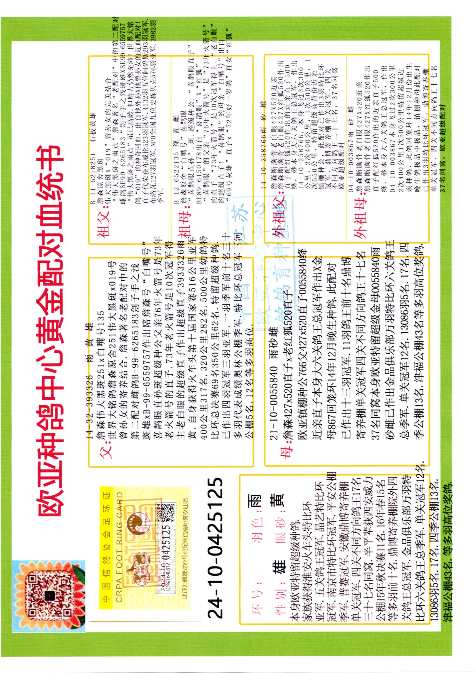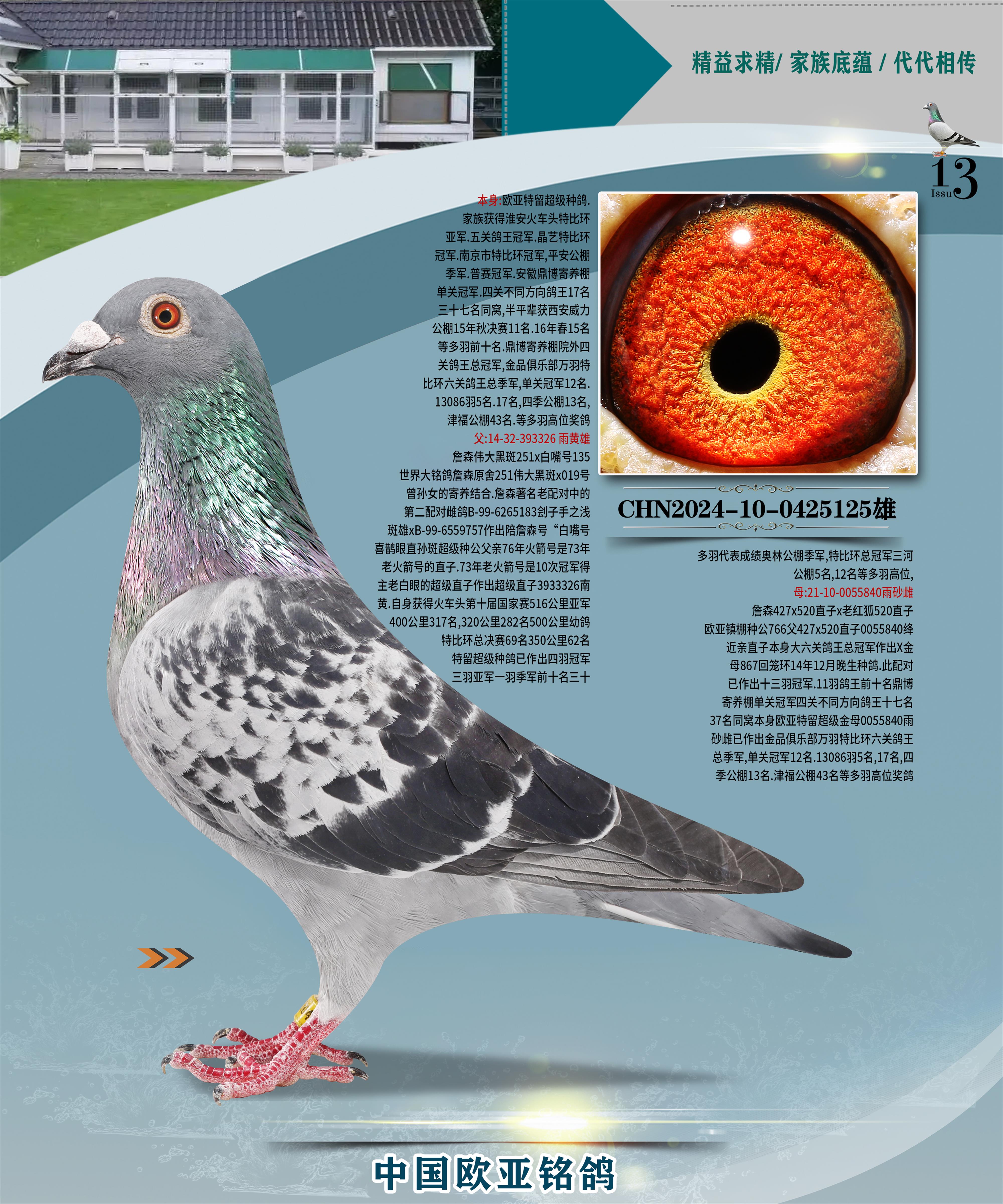 24年秋南京特比环欧亚荣获大团体冠军.小团体冠军551公里大特比13名.14名.16名.19名.20名.21名.24名.26名.27名.28名.42名.52名.54名.57名.65名.66名.68名.70名.71名.72名.74名.76名.80名.82名.83名.84名.85名.86名.90名.92名.110名.116名.121名.122名.128名.131名.158名.161名.164名.165名.166名.172名.174名.177名.182名.195名.196名.201名.205名.208名.210名.216名.253名.269名.275名.276名.294名.296名.299名,,24年秋云南天南铜都公棚决赛415名.天南铜都小棚决赛409名.云南玉活公棚决赛102名.490名.团体32名上笼二羽进二羽,天南铜都大棚506公里决赛445名。热烈祝贺河北省巨鹿县李兰生老师用欧亚泰山号血系连续十一年夺冠军,河北省国家赛冠军.全国季军等多次前十名高位,扬州王军王总用欧亚利奥24年春季获山东翔宇公棚决赛33名盖比53名。南京刘正龙刘总用欧亚盖比获得24年秋山东潍坊国际公棚决赛42名.精英赛30名.三关鸽王71名.决赛86名.加站赛16名.南京市特比环A组鸽王9名.B组鸽王5名.6名.C组鸽王5名.精英赛冠军4名.技能赛A组冠军4名.5名.秦淮区特比环荣获15名.46名.48名.87名。四川西昌徐亮徐总用欧亚利奥获得凉山州聚友决赛177名.第二关亚军双关鸽王19名.三关鸽王105名.云南豪庭公棚决赛603名。热烈祝贺24年四川重庆翔园鸽舍用欧亚泰山号荣获春季400公里冠军.秋季500公里冠军,河北王总用詹森X利奥获得千羽千翔公棚400公里冠军,广东蔡楷焕荣获24年秋爱好者 赛鸽俱乐部三关鸽王季军.一关420公里99名.二关450公里11名.三关520公里32名.单关季军.7名.12名,江西李卫兴荣获贵州红枫公棚8名.共翔俱乐部寄养棚四关综合鸽王30名.一关400公里78名.二关500公里55名.三关520公里37名.四关500公里57名.同父母获公棚18名.雷鸣获得武汉黄浦育翔中心冠军,四川陈文获得四川明鸿俱乐部300公里梦幻2名.3名.4名.9名.10名.13名.14名.15名.31名.34名.40名.41名.42名.43名.69名.71名.72名.73名.74名.94名.95名.97名.98名.99名.419公里决赛荣获总冠军7名.总共归巢9羽,四川徐亮获豪庭决赛603名,山西郑勇获得山西泰鑫公棚决赛255名詹森红狐,热烈祝贺马总获得开尔(飞跃队)决赛9名获奖金1310000万元.第一关52名,天津津福资赛180公里96名.获奖金429543万元,欧亚支持全国鸽友24年秋多人报喜 祝大家取得更好成绩,给欧亚报喜鸽友欧亚决定给每人赠送一羽超级种鸽。欧亚俱乐部特比环多关鸽王成绩:15年秋淮安特比环黑色星期一全会上笼9700多羽,当天无鸽归巢,第二天全会归巢357羽,本舍归巢158羽.前十名八羽.前一百名归巢57羽,16年春季获五关鸽王总冠军,总亚军四名.六名.七名.九名.十名.晶艺俱乐部520公里冠亚季军5名.6名.7名.9名.11名等,火车头冠军.季军6名.8名.9名.10名,16年秋晶艺俱乐部特比环520公里亚军.季军4名.6名.7名.9名,15年春南京白下特比环冠军.亚军.季军6名.7名.8名.9名.10名.指定鸽A B组获得冠军.亚军.季军4名.5名.,17年淮安特比环亚军.4名.5名.7名.8名.10名.六关鸽王总冠军.4名.6名.9名.10名,寄养棚宿迁刘总20羽特比环获冠军.季军.4名.7名.8名.9名等。18年荣获万羽特比环六关鸽王总冠军.总亚军.总季军.6名.8名.十名.单关四羽冠军.二羽亚军.四羽季军.前十名27羽。19年秋万羽特比环六关鸽王总亚军.总季军.5名.8名等,单关二羽冠军.三羽亚军.一羽季军前十名31羽。20年秋淮安市鸽会四关特比环大赛风雨无阻鸽王亚军.鸽王六名,金品俱乐部万羽特比环六关鸽王总冠军,总亚军.四名.五名.六名.七名.八名.十名.前二百名鸽王35羽,单关冠亚季军前十名四十多羽,火车头五关鸽王季军.六名.八名.前二百名鸽王十七羽。20年春荣获淮安五区一市四关鸽王总冠军.亚军.四名.八名.九名。21年秋荣获金品万羽特比环大赛六关鸽王总亚军.总季军.四名.七名.九名.十名.单关冠亚军季军前十名三十多羽。火车头协会鸽王六名.七名.十名.单关前十名十七羽。22年秋荣获鸽王总冠军.总亚军.5名.7名.8名.9名.11名.单关冠亚季军前十名三十多羽,第一关单关前二百名四十多羽,第二关前二百名三十多羽,第三关前二百名四十多羽,第四关前二百名四十多羽,第五关前一百名53羽。23年秋荣获鸽王季军.五名.八名.十名.13名.17名.20名.27名等多羽鸽王.单关前十名二十多羽。公棚.寄养棚部分成绩:16年秋宁夏黄河公棚总冠军电脑戈马力指定通炮冠军,17年送八羽参赛获得鸽王八名进奖四名,支持韩总荣获八名。支持鸽友荣获宁夏中卫公棚决赛总冠军.精英赛冠军,支持18年宁夏黄河公棚决赛冠军詹森X泰山。安徽鼎博寄养棚院内外四关鸽王总冠军.鸽王十七名.三十七名同窝,鸽王39名.42名.58名.67名。18年山东公棚预赛冠军.决赛65名.送八羽进奖五羽.指定获奔驰汽车一辆。支持鸽友获得云南蓝云公棚冠军.盖比X佛卡门。支持鸽友荣获云南银集公棚决赛冠军 詹森427X520血系 速度赛6700羽冠军。17年荣获金马俱乐部寄养棚四关鸽王总冠军.季军.六名.八名.第一关冠军.亚军.季军四名.七名.十一名.金牌教练奖。支持鸽友18年北京费翔公棚预赛九名电脑X桑杰士,支持鸽友荣获陕西威力公棚决赛11名.内蒙古临河寄养棚四关鸽王六名.詹森配泰山,支持河北王总用欧亚詹森427配胡本喜获20年秋开尔青年棚季军。云南东荣公棚16年预赛冠军.决赛77名.17年决赛12名.詹森红狐X泰山,17年平安公棚决赛4名 詹森427。欧亚获得21年金母寄养棚第一关四名.第二关5名.第三关5名.6名.7名.10名.三关鸽王总冠军,四关鸽王14名.十羽鸽王。支持河