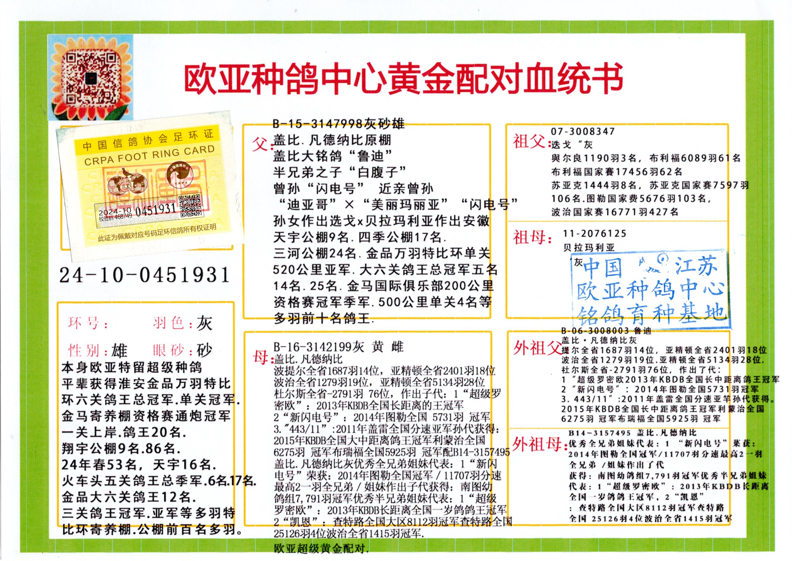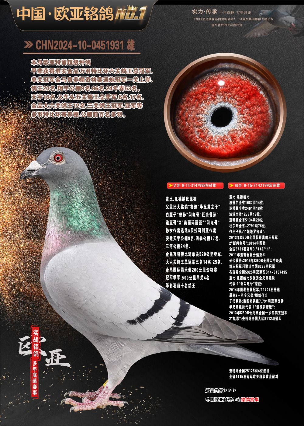 24年秋南京特比环欧亚荣获大团体冠军.小团体冠军551公里大特比13名.14名.16名.19名.20名.21名.24名.26名.27名.28名.42名.52名.54名.57名.65名.66名.68名.70名.71名.72名.74名.76名.80名.82名.83名.84名.85名.86名.90名.92名.110名.116名.121名.122名.128名.131名.158名.161名.164名.165名.166名.172名.174名.177名.182名.195名.196名.201名.205名.208名.210名.216名.253名.269名.275名.276名.294名.296名.299名,,24年秋云南天南铜都公棚决赛415名.天南铜都小棚决赛409名.云南玉活公棚决赛102名.490名.团体32名上笼二羽进二羽,天南铜都大棚506公里决赛445名。热烈祝贺河北省巨鹿县李兰生老师用欧亚泰山号血系连续十一年夺冠军,河北省国家赛冠军.全国季军等多次前十名高位,扬州王军王总用欧亚利奥24年春季获山东翔宇公棚决赛33名盖比53名。南京刘正龙刘总用欧亚盖比获得24年秋山东潍坊国际公棚决赛42名.精英赛30名.三关鸽王71名.决赛86名.加站赛16名.南京市特比环A组鸽王9名.B组鸽王5名.6名.C组鸽王5名.精英赛冠军4名.技能赛A组冠军4名.5名.秦淮区特比环荣获15名.46名.48名.87名。四川西昌徐亮徐总用欧亚利奥获得凉山州聚友决赛177名.第二关亚军双关鸽王19名.三关鸽王105名.云南豪庭公棚决赛603名。热烈祝贺24年四川重庆翔园鸽舍用欧亚泰山号荣获春季400公里冠军.秋季500公里冠军,河北王总用詹森X利奥获得千羽千翔公棚400公里冠军,广东蔡楷焕荣获24年秋爱好者 赛鸽俱乐部三关鸽王季军.一关420公里99名.二关450公里11名.三关520公里32名.单关季军.7名.12名,江西李卫兴荣获贵州红枫公棚8名.共翔俱乐部寄养棚四关综合鸽王30名.一关400公里78名.二关500公里55名.三关520公里37名.四关500公里57名.同父母获公棚18名.雷鸣获得武汉黄浦育翔中心冠军,四川陈文获得四川明鸿俱乐部300公里梦幻2名.3名.4名.9名.10名.13名.14名.15名.31名.34名.40名.41名.42名.43名.69名.71名.72名.73名.74名.94名.95名.97名.98名.99名.419公里决赛荣获总冠军7名.总共归巢9羽,四川徐亮获豪庭决赛603名,山西郑勇获得山西泰鑫公棚决赛255名詹森红狐,热烈祝贺马总获得开尔(飞跃队)决赛9名获奖金1310000万元.第一关52名,天津津福资赛180公里96名.获奖金429543万元,欧亚支持全国鸽友24年秋多人报喜 祝大家取得更好成绩,给欧亚报喜鸽友欧亚决定给每人赠送一羽超级种鸽。欧亚俱乐部特比环多关鸽王成绩:15年秋淮安特比环黑色星期一全会上笼9700多羽,当天无鸽归巢,第二天全会归巢357羽,本舍归巢158羽.前十名八羽.前一百名归巢57羽,16年春季获五关鸽王总冠军,总亚军四名.六名.七名.九名.十名.晶艺俱乐部520公里冠亚季军5名.6名.7名.9名.11名等,火车头冠军.季军6名.8名.9名.10名,16年秋晶艺俱乐部特比环520公里亚军.季军4名.6名.7名.9名,15年春南京白下特比环冠军.亚军.季军6名.7名.8名.9名.10名.指定鸽A B组获得冠军.亚军.季军4名.5名.,17年淮安特比环亚军.4名.5名.7名.8名.10名.六关鸽王总冠军.4名.6名.9名.10名,寄养棚宿迁刘总20羽特比环获冠军.季军.4名.7名.8名.9名等。18年荣获万羽特比环六关鸽王总冠军.总亚军.总季军.6名.8名.十名.单关四羽冠军.二羽亚军.四羽季军.前十名27羽。19年秋万羽特比环六关鸽王总亚军.总季军.5名.8名等,单关二羽冠军.三羽亚军.一羽季军前十名31羽。20年秋淮安市鸽会四关特比环大赛风雨无阻鸽王亚军.鸽王六名,金品俱乐部万羽特比环六关鸽王总冠军,总亚军.四名.五名.六名.七名.八名.十名.前二百名鸽王35羽,单关冠亚季军前十名四十多羽,火车头五关鸽王季军.六名.八名.前二百名鸽王十七羽。20年春荣获淮安五区一市四关鸽王总冠军.亚军.四名.八名.九名。21年秋荣获金品万羽特比环大赛六关鸽王总亚军.总季军.四名.七名.九名.十名.单关冠亚军季军前十名三十多羽。火车头协会鸽王六名.七名.十名.单关前十名十七羽。22年秋荣获鸽王总冠军.总亚军.5名.7名.8名.9名.11名.单关冠亚季军前十名三十多羽,第一关单关前二百名四十多羽,第二关前二百名三十多羽,第三关前二百名四十多羽,第四关前二百名四十多羽,第五关前一百名53羽。23年秋荣获鸽王季军.五名.八名.十名.13名.17名.20名.27名等多羽鸽王.单关前十名二十多羽。公棚.寄养棚部分成绩:16年秋宁夏黄河公棚总冠军电脑戈马力指定通炮冠军,17年送八羽参赛获得鸽王八名进奖四名,支持韩总荣获八名。支持鸽友荣获宁夏中卫公棚决赛总冠军.精英赛冠军,支持18年宁夏黄河公棚决赛冠军詹森X泰山。安徽鼎博寄养棚院内外四关鸽王总冠军.鸽王十七名.三十七名同窝,鸽王39名.42名.58名.67名。18年山东公棚预赛冠军.决赛65名.送八羽进奖五羽.指定获奔驰汽车一辆。支持鸽友获得云南蓝云公棚冠军.盖比X佛卡门。支持鸽友荣获云南银集公棚决赛冠军 詹森427X520血系 速度赛6700羽冠军。17年荣获金马俱乐部寄养棚四关鸽王总冠军.季军.六名.八名.第一关冠军.亚军.季军四名.七名.十一名.金牌教练奖。支持鸽友18年北京费翔公棚预赛九名电脑X桑杰士,支持鸽友荣获陕西威力公棚决赛11名.内蒙古临河寄养棚四关鸽王六名.詹森配泰山,支持河北王总用欧亚詹森427配胡本喜获20年秋开尔青年棚季军。云南东荣公棚16年预赛冠军.决赛77名.17年决赛12名.詹森红狐X泰山,17年平安公棚决赛4名 詹森427。欧亚获得21年金母寄养棚第一关四名.第二关5名.第三关5名.6名.7名.10名.三关鸽王总冠军,四关鸽王14名.十羽鸽王。支持河
