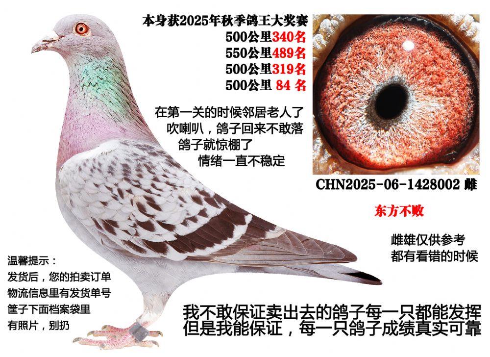 注:照片上的公母由摄影师标注,有个别的可能会标记错误,有的发现标错的已经更改过来了,不排除没有发现错误的,还请拍鸽子的鸽友自行鉴别后出拍,具体雌雄以收到实物为准!
