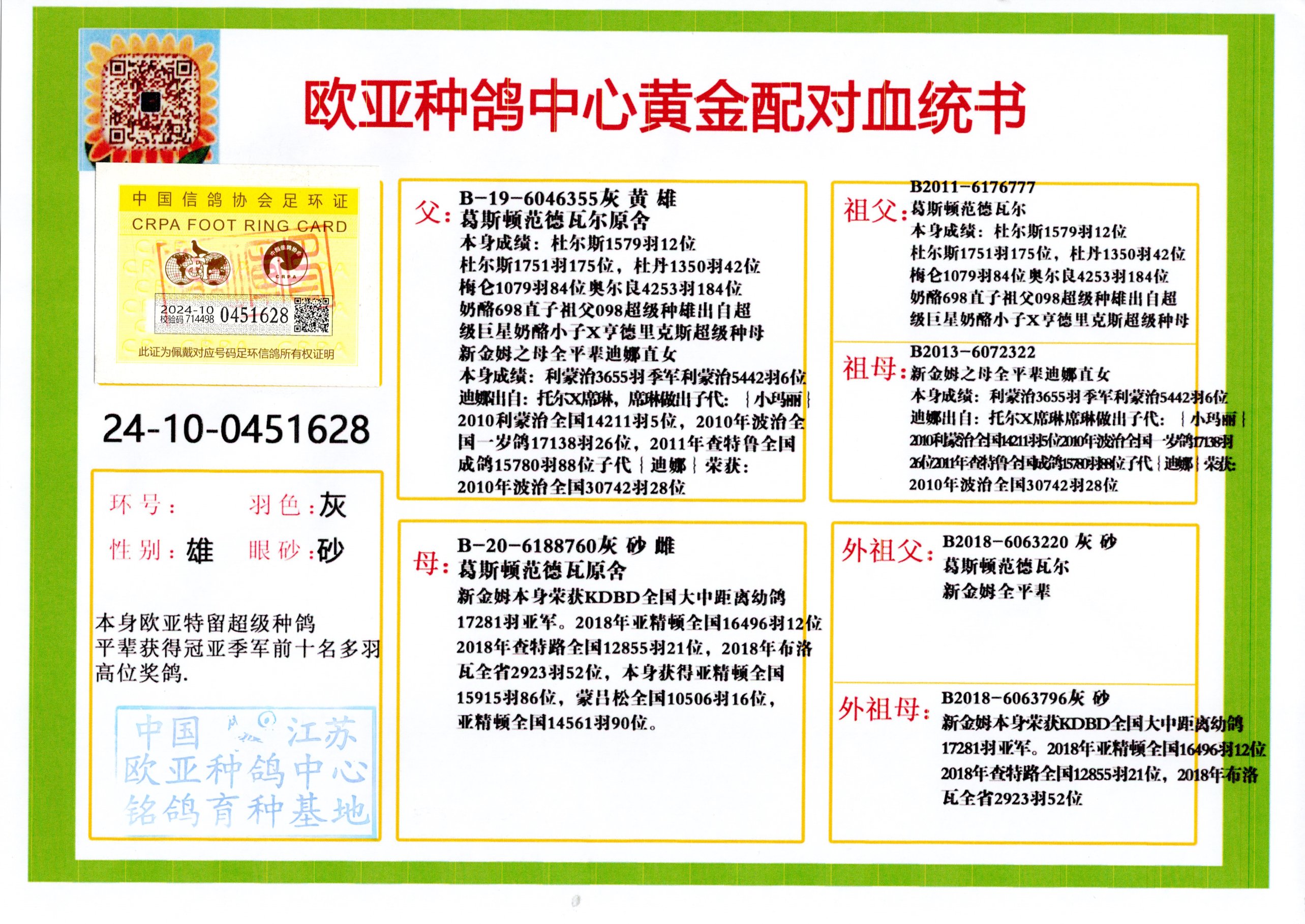 24年秋南京特比环欧亚荣获大团体冠军.小团体冠军551公里大特比13名.14名.16名.19名.20名.21名.24名.26名.27名.28名.42名.52名.54名.57名.65名.66名.68名.70名.71名.72名.74名.76名.80名.82名.83名.84名.85名.86名.90名.92名.110名.116名.121名.122名.128名.131名.158名.161名.164名.165名.166名.172名.174名.177名.182名.195名.196名.201名.205名.208名.210名.216名.253名.269名.275名.276名.294名.296名.299名,,24年秋云南天南铜都公棚决赛415名.天南铜都小棚决赛409名.云南玉活公棚决赛102名.490名.团体32名上笼二羽进二羽,天南铜都大棚506公里决赛445名。热烈祝贺河北省巨鹿县李兰生老师用欧亚泰山号血系连续十一年夺冠军,河北省国家赛冠军.全国季军等多次前十名高位,扬州王军王总用欧亚利奥24年春季获山东翔宇公棚决赛33名盖比53名。南京刘正龙刘总用欧亚盖比获得24年秋山东潍坊国际公棚决赛42名.精英赛30名.三关鸽王71名.决赛86名.加站赛16名.南京市特比环A组鸽王9名.B组鸽王5名.6名.C组鸽王5名.精英赛冠军4名.技能赛A组冠军4名.5名.秦淮区特比环荣获15名.46名.48名.87名。四川西昌徐亮徐总用欧亚利奥获得凉山州聚友决赛177名.第二关亚军双关鸽王19名.三关鸽王105名.云南豪庭公棚决赛603名。热烈祝贺24年四川重庆翔园鸽舍用欧亚泰山号荣获春季400公里冠军.秋季500公里冠军,河北王总用詹森X利奥获得千羽千翔公棚400公里冠军,广东蔡楷焕荣获24年秋爱好者 赛鸽俱乐部三关鸽王季军.一关420公里99名.二关450公里11名.三关520公里32名.单关季军.7名.12名,江西李卫兴荣获贵州红枫公棚8名.共翔俱乐部寄养棚四关综合鸽王30名.一关400公里78名.二关500公里55名.三关520公里37名.四关500公里57名.同父母获公棚18名.雷鸣获得武汉黄浦育翔中心冠军,四川陈文获得四川明鸿俱乐部300公里梦幻2名.3名.4名.9名.10名.13名.14名.15名.31名.34名.40名.41名.42名.43名.69名.71名.72名.73名.74名.94名.95名.97名.98名.99名.419公里决赛荣获总冠军7名.总共归巢9羽,四川徐亮获豪庭决赛603名,山西郑勇获得山西泰鑫公棚决赛255名詹森红狐,热烈祝贺马总获得开尔(飞跃队)决赛9名获奖金1310000万元.第一关52名,天津津福资赛180公里96名.获奖金429543万元,欧亚支持全国鸽友24年秋多人报喜 祝大家取得更好成绩,给欧亚报喜鸽友欧亚决定给每人赠送一羽超级种鸽。欧亚俱乐部特比环多关鸽王成绩:15年秋淮安特比环黑色星期一全会上笼9700多羽,当天无鸽归巢,第二天全会归巢357羽,本舍归巢158羽.前十名八羽.前一百名归巢57羽,16年春季获五关鸽王总冠军,总亚军四名.六名.七名.九名.十名.晶艺俱乐部520公里冠亚季军5名.6名.7名.9名.11名等,火车头冠军.季军6名.8名.9名.10名,16年秋晶艺俱乐部特比环520公里亚军.季军4名.6名.7名.9名,15年春南京白下特比环冠军.亚军.季军6名.7名.8名.9名.10名.指定鸽A B组获得冠军.亚军.季军4名.5名.,17年淮安特比环亚军.4名.5名.7名.8名.10名.六关鸽王总冠军.4名.6名.9名.10名,寄养棚宿迁刘总20羽特比环获冠军.季军.4名.7名.8名.9名等。18年荣获万羽特比环六关鸽王总冠军.总亚军.总季军.6名.8名.十名.单关四羽冠军.二羽亚军.四羽季军.前十名27羽。19年秋万羽特比环六关鸽王总亚军.总季军.5名.8名等,单关二羽冠军.三羽亚军.一羽季军前十名31羽。20年秋淮安市鸽会四关特比环大赛风雨无阻鸽王亚军.鸽王六名,金品俱乐部万羽特比环六关鸽王总冠军,总亚军.四名.五名.六名.七名.八名.十名.前二百名鸽王35羽,单关冠亚季军前十名四十多羽,火车头五关鸽王季军.六名.八名.前二百名鸽王十七羽。20年春荣获淮安五区一市四关鸽王总冠军.亚军.四名.八名.九名。21年秋荣获金品万羽特比环大赛六关鸽王总亚军.总季军.四名.七名.九名.十名.单关冠亚军季军前十名三十多羽。火车头协会鸽王六名.七名.十名.单关前十名十七羽。22年秋荣获鸽王总冠军.总亚军.5名.7名.8名.9名.11名.单关冠亚季军前十名三十多羽,第一关单关前二百名四十多羽,第二关前二百名三十多羽,第三关前二百名四十多羽,第四关前二百名四十多羽,第五关前一百名53羽。23年秋荣获鸽王季军.五名.八名.十名.13名.17名.20名.27名等多羽鸽王.单关前十名二十多羽。公棚.寄养棚部分成绩:16年秋宁夏黄河公棚总冠军电脑戈马力指定通炮冠军,17年送八羽参赛获得鸽王八名进奖四名,支持韩总荣获八名。支持鸽友荣获宁夏中卫公棚决赛总冠军.精英赛冠军,支持18年宁夏黄河公棚决赛冠军詹森X泰山。安徽鼎博寄养棚院内外四关鸽王总冠军.鸽王十七名.三十七名同窝,鸽王39名.42名.58名.67名。18年山东公棚预赛冠军.决赛65名.送八羽进奖五羽.指定获奔驰汽车一辆。支持鸽友获得云南蓝云公棚冠军.盖比X佛卡门。支持鸽友荣获云南银集公棚决赛冠军 詹森427X520血系 速度赛6700羽冠军。17年荣获金马俱乐部寄养棚四关鸽王总冠军.季军.六名.八名.第一关冠军.亚军.季军四名.七名.十一名.金牌教练奖。支持鸽友18年北京费翔公棚预赛九名电脑X桑杰士,支持鸽友荣获陕西威力公棚决赛11名.内蒙古临河寄养棚四关鸽王六名.詹森配泰山,支持河北王总用欧亚詹森427配胡本喜获20年秋开尔青年棚季军。云南东荣公棚16年预赛冠军.决赛77名.17年决赛12名.詹森红狐X泰山,17年平安公棚决赛4名 詹森427。欧亚获得21年金母寄养棚第一关四名.第二关5名.第三关5名.6名.7名.10名.三关鸽王总冠军,四关鸽王14名.十羽鸽王。支持河