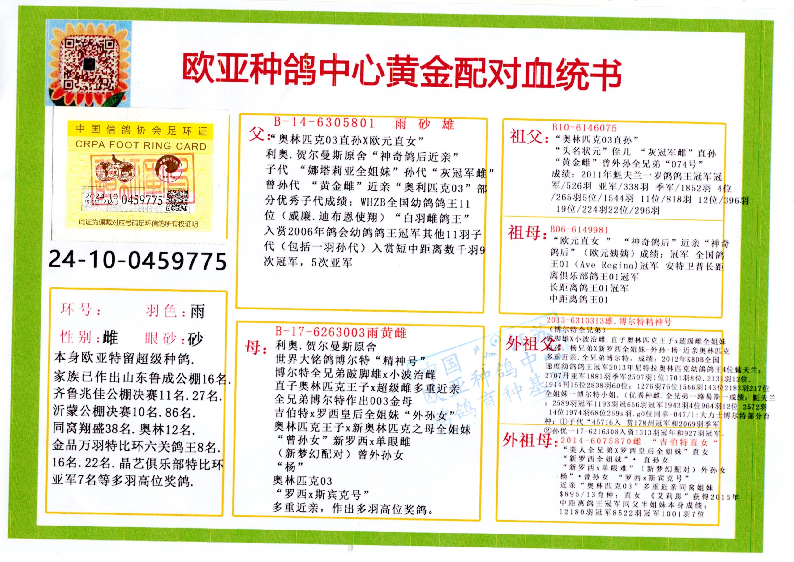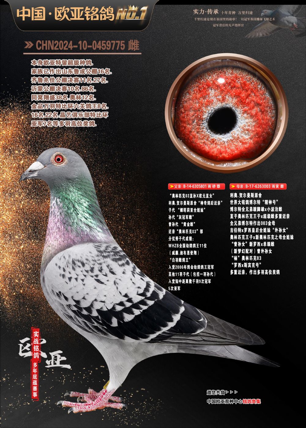 24年秋南京特比环欧亚荣获大团体冠军.小团体冠军551公里大特比13名.14名.16名.19名.20名.21名.24名.26名.27名.28名.42名.52名.54名.57名.65名.66名.68名.70名.71名.72名.74名.76名.80名.82名.83名.84名.85名.86名.90名.92名.110名.116名.121名.122名.128名.131名.158名.161名.164名.165名.166名.172名.174名.177名.182名.195名.196名.201名.205名.208名.210名.216名.253名.269名.275名.276名.294名.296名.299名,,24年秋云南天南铜都公棚决赛415名.天南铜都小棚决赛409名.云南玉活公棚决赛102名.490名.团体32名上笼二羽进二羽,天南铜都大棚506公里决赛445名。热烈祝贺河北省巨鹿县李兰生老师用欧亚泰山号血系连续十一年夺冠军,河北省国家赛冠军.全国季军等多次前十名高位,扬州王军王总用欧亚利奥24年春季获山东翔宇公棚决赛33名盖比53名。南京刘正龙刘总用欧亚盖比获得24年秋山东潍坊国际公棚决赛42名.精英赛30名.三关鸽王71名.决赛86名.加站赛16名.南京市特比环A组鸽王9名.B组鸽王5名.6名.C组鸽王5名.精英赛冠军4名.技能赛A组冠军4名.5名.秦淮区特比环荣获15名.46名.48名.87名。四川西昌徐亮徐总用欧亚利奥获得凉山州聚友决赛177名.第二关亚军双关鸽王19名.三关鸽王105名.云南豪庭公棚决赛603名。热烈祝贺24年四川重庆翔园鸽舍用欧亚泰山号荣获春季400公里冠军.秋季500公里冠军,河北王总用詹森X利奥获得千羽千翔公棚400公里冠军,广东蔡楷焕荣获24年秋爱好者 赛鸽俱乐部三关鸽王季军.一关420公里99名.二关450公里11名.三关520公里32名.单关季军.7名.12名,江西李卫兴荣获贵州红枫公棚8名.共翔俱乐部寄养棚四关综合鸽王30名.一关400公里78名.二关500公里55名.三关520公里37名.四关500公里57名.同父母获公棚18名.雷鸣获得武汉黄浦育翔中心冠军,四川陈文获得四川明鸿俱乐部300公里梦幻2名.3名.4名.9名.10名.13名.14名.15名.31名.34名.40名.41名.42名.43名.69名.71名.72名.73名.74名.94名.95名.97名.98名.99名.419公里决赛荣获总冠军7名.总共归巢9羽,四川徐亮获豪庭决赛603名,山西郑勇获得山西泰鑫公棚决赛255名詹森红狐,热烈祝贺马总获得开尔(飞跃队)决赛9名获奖金1310000万元.第一关52名,天津津福资赛180公里96名.获奖金429543万元,欧亚支持全国鸽友24年秋多人报喜 祝大家取得更好成绩,给欧亚报喜鸽友欧亚决定给每人赠送一羽超级种鸽。欧亚俱乐部特比环多关鸽王成绩:15年秋淮安特比环黑色星期一全会上笼9700多羽,当天无鸽归巢,第二天全会归巢357羽,本舍归巢158羽.前十名八羽.前一百名归巢57羽,16年春季获五关鸽王总冠军,总亚军四名.六名.七名.九名.十名.晶艺俱乐部520公里冠亚季军5名.6名.7名.9名.11名等,火车头冠军.季军6名.8名.9名.10名,16年秋晶艺俱乐部特比环520公里亚军.季军4名.6名.7名.9名,15年春南京白下特比环冠军.亚军.季军6名.7名.8名.9名.10名.指定鸽A B组获得冠军.亚军.季军4名.5名.,17年淮安特比环亚军.4名.5名.7名.8名.10名.六关鸽王总冠军.4名.6名.9名.10名,寄养棚宿迁刘总20羽特比环获冠军.季军.4名.7名.8名.9名等。18年荣获万羽特比环六关鸽王总冠军.总亚军.总季军.6名.8名.十名.单关四羽冠军.二羽亚军.四羽季军.前十名27羽。19年秋万羽特比环六关鸽王总亚军.总季军.5名.8名等,单关二羽冠军.三羽亚军.一羽季军前十名31羽。20年秋淮安市鸽会四关特比环大赛风雨无阻鸽王亚军.鸽王六名,金品俱乐部万羽特比环六关鸽王总冠军,总亚军.四名.五名.六名.七名.八名.十名.前二百名鸽王35羽,单关冠亚季军前十名四十多羽,火车头五关鸽王季军.六名.八名.前二百名鸽王十七羽。20年春荣获淮安五区一市四关鸽王总冠军.亚军.四名.八名.九名。21年秋荣获金品万羽特比环大赛六关鸽王总亚军.总季军.四名.七名.九名.十名.单关冠亚军季军前十名三十多羽。火车头协会鸽王六名.七名.十名.单关前十名十七羽。22年秋荣获鸽王总冠军.总亚军.5名.7名.8名.9名.11名.单关冠亚季军前十名三十多羽,第一关单关前二百名四十多羽,第二关前二百名三十多羽,第三关前二百名四十多羽,第四关前二百名四十多羽,第五关前一百名53羽。23年秋荣获鸽王季军.五名.八名.十名.13名.17名.20名.27名等多羽鸽王.单关前十名二十多羽。公棚.寄养棚部分成绩:16年秋宁夏黄河公棚总冠军电脑戈马力指定通炮冠军,17年送八羽参赛获得鸽王八名进奖四名,支持韩总荣获八名。支持鸽友荣获宁夏中卫公棚决赛总冠军.精英赛冠军,支持18年宁夏黄河公棚决赛冠军詹森X泰山。安徽鼎博寄养棚院内外四关鸽王总冠军.鸽王十七名.三十七名同窝,鸽王39名.42名.58名.67名。18年山东公棚预赛冠军.决赛65名.送八羽进奖五羽.指定获奔驰汽车一辆。支持鸽友获得云南蓝云公棚冠军.盖比X佛卡门。支持鸽友荣获云南银集公棚决赛冠军 詹森427X520血系 速度赛6700羽冠军。17年荣获金马俱乐部寄养棚四关鸽王总冠军.季军.六名.八名.第一关冠军.亚军.季军四名.七名.十一名.金牌教练奖。支持鸽友18年北京费翔公棚预赛九名电脑X桑杰士,支持鸽友荣获陕西威力公棚决赛11名.内蒙古临河寄养棚四关鸽王六名.詹森配泰山,支持河北王总用欧亚詹森427配胡本喜获20年秋开尔青年棚季军。云南东荣公棚16年预赛冠军.决赛77名.17年决赛12名.詹森红狐X泰山,17年平安公棚决赛4名 詹森427。欧亚获得21年金母寄养棚第一关四名.第二关5名.第三关5名.6名.7名.10名.三关鸽王总冠军,四关鸽王14名.十羽鸽王。支持河