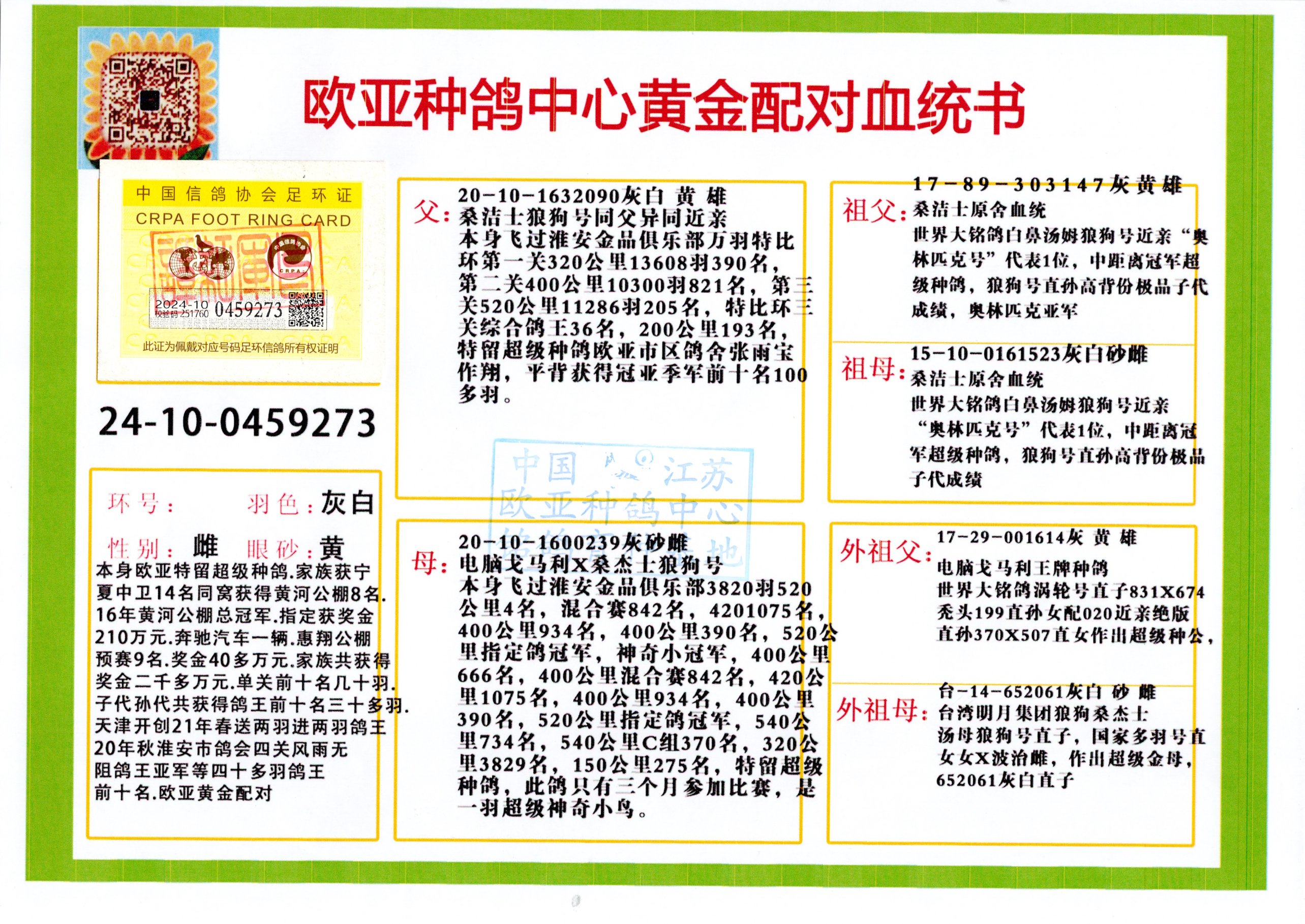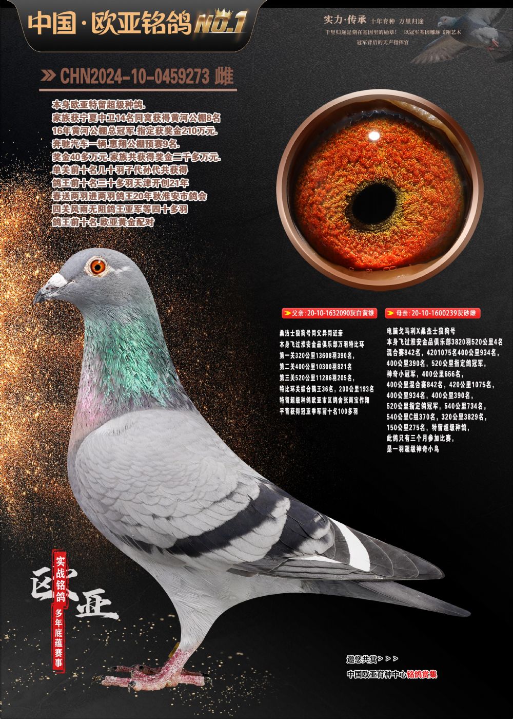 24年秋南京特比环欧亚荣获大团体冠军.小团体冠军551公里大特比13名.14名.16名.19名.20名.21名.24名.26名.27名.28名.42名.52名.54名.57名.65名.66名.68名.70名.71名.72名.74名.76名.80名.82名.83名.84名.85名.86名.90名.92名.110名.116名.121名.122名.128名.131名.158名.161名.164名.165名.166名.172名.174名.177名.182名.195名.196名.201名.205名.208名.210名.216名.253名.269名.275名.276名.294名.296名.299名,,24年秋云南天南铜都公棚决赛415名.天南铜都小棚决赛409名.云南玉活公棚决赛102名.490名.团体32名上笼二羽进二羽,天南铜都大棚506公里决赛445名。热烈祝贺河北省巨鹿县李兰生老师用欧亚泰山号血系连续十一年夺冠军,河北省国家赛冠军.全国季军等多次前十名高位,扬州王军王总用欧亚利奥24年春季获山东翔宇公棚决赛33名盖比53名。南京刘正龙刘总用欧亚盖比获得24年秋山东潍坊国际公棚决赛42名.精英赛30名.三关鸽王71名.决赛86名.加站赛16名.南京市特比环A组鸽王9名.B组鸽王5名.6名.C组鸽王5名.精英赛冠军4名.技能赛A组冠军4名.5名.秦淮区特比环荣获15名.46名.48名.87名。四川西昌徐亮徐总用欧亚利奥获得凉山州聚友决赛177名.第二关亚军双关鸽王19名.三关鸽王105名.云南豪庭公棚决赛603名。热烈祝贺24年四川重庆翔园鸽舍用欧亚泰山号荣获春季400公里冠军.秋季500公里冠军,河北王总用詹森X利奥获得千羽千翔公棚400公里冠军,广东蔡楷焕荣获24年秋爱好者 赛鸽俱乐部三关鸽王季军.一关420公里99名.二关450公里11名.三关520公里32名.单关季军.7名.12名,江西李卫兴荣获贵州红枫公棚8名.共翔俱乐部寄养棚四关综合鸽王30名.一关400公里78名.二关500公里55名.三关520公里37名.四关500公里57名.同父母获公棚18名.雷鸣获得武汉黄浦育翔中心冠军,四川陈文获得四川明鸿俱乐部300公里梦幻2名.3名.4名.9名.10名.13名.14名.15名.31名.34名.40名.41名.42名.43名.69名.71名.72名.73名.74名.94名.95名.97名.98名.99名.419公里决赛荣获总冠军7名.总共归巢9羽,四川徐亮获豪庭决赛603名,山西郑勇获得山西泰鑫公棚决赛255名詹森红狐,热烈祝贺马总获得开尔(飞跃队)决赛9名获奖金1310000万元.第一关52名,天津津福资赛180公里96名.获奖金429543万元,欧亚支持全国鸽友24年秋多人报喜 祝大家取得更好成绩,给欧亚报喜鸽友欧亚决定给每人赠送一羽超级种鸽。欧亚俱乐部特比环多关鸽王成绩:15年秋淮安特比环黑色星期一全会上笼9700多羽,当天无鸽归巢,第二天全会归巢357羽,本舍归巢158羽.前十名八羽.前一百名归巢57羽,16年春季获五关鸽王总冠军,总亚军四名.六名.七名.九名.十名.晶艺俱乐部520公里冠亚季军5名.6名.7名.9名.11名等,火车头冠军.季军6名.8名.9名.10名,16年秋晶艺俱乐部特比环520公里亚军.季军4名.6名.7名.9名,15年春南京白下特比环冠军.亚军.季军6名.7名.8名.9名.10名.指定鸽A B组获得冠军.亚军.季军4名.5名.,17年淮安特比环亚军.4名.5名.7名.8名.10名.六关鸽王总冠军.4名.6名.9名.10名,寄养棚宿迁刘总20羽特比环获冠军.季军.4名.7名.8名.9名等。18年荣获万羽特比环六关鸽王总冠军.总亚军.总季军.6名.8名.十名.单关四羽冠军.二羽亚军.四羽季军.前十名27羽。19年秋万羽特比环六关鸽王总亚军.总季军.5名.8名等,单关二羽冠军.三羽亚军.一羽季军前十名31羽。20年秋淮安市鸽会四关特比环大赛风雨无阻鸽王亚军.鸽王六名,金品俱乐部万羽特比环六关鸽王总冠军,总亚军.四名.五名.六名.七名.八名.十名.前二百名鸽王35羽,单关冠亚季军前十名四十多羽,火车头五关鸽王季军.六名.八名.前二百名鸽王十七羽。20年春荣获淮安五区一市四关鸽王总冠军.亚军.四名.八名.九名。21年秋荣获金品万羽特比环大赛六关鸽王总亚军.总季军.四名.七名.九名.十名.单关冠亚军季军前十名三十多羽。火车头协会鸽王六名.七名.十名.单关前十名十七羽。22年秋荣获鸽王总冠军.总亚军.5名.7名.8名.9名.11名.单关冠亚季军前十名三十多羽,第一关单关前二百名四十多羽,第二关前二百名三十多羽,第三关前二百名四十多羽,第四关前二百名四十多羽,第五关前一百名53羽。23年秋荣获鸽王季军.五名.八名.十名.13名.17名.20名.27名等多羽鸽王.单关前十名二十多羽。公棚.寄养棚部分成绩:16年秋宁夏黄河公棚总冠军电脑戈马力指定通炮冠军,17年送八羽参赛获得鸽王八名进奖四名,支持韩总荣获八名。支持鸽友荣获宁夏中卫公棚决赛总冠军.精英赛冠军,支持18年宁夏黄河公棚决赛冠军詹森X泰山。安徽鼎博寄养棚院内外四关鸽王总冠军.鸽王十七名.三十七名同窝,鸽王39名.42名.58名.67名。18年山东公棚预赛冠军.决赛65名.送八羽进奖五羽.指定获奔驰汽车一辆。支持鸽友获得云南蓝云公棚冠军.盖比X佛卡门。支持鸽友荣获云南银集公棚决赛冠军 詹森427X520血系 速度赛6700羽冠军。17年荣获金马俱乐部寄养棚四关鸽王总冠军.季军.六名.八名.第一关冠军.亚军.季军四名.七名.十一名.金牌教练奖。支持鸽友18年北京费翔公棚预赛九名电脑X桑杰士,支持鸽友荣获陕西威力公棚决赛11名.内蒙古临河寄养棚四关鸽王六名.詹森配泰山,支持河北王总用欧亚詹森427配胡本喜获20年秋开尔青年棚季军。云南东荣公棚16年预赛冠军.决赛77名.17年决赛12名.詹森红狐X泰山,17年平安公棚决赛4名 詹森427。欧亚获得21年金母寄养棚第一关四名.第二关5名.第三关5名.6名.7名.10名.三关鸽王总冠军,四关鸽王14名.十羽鸽王。支持河