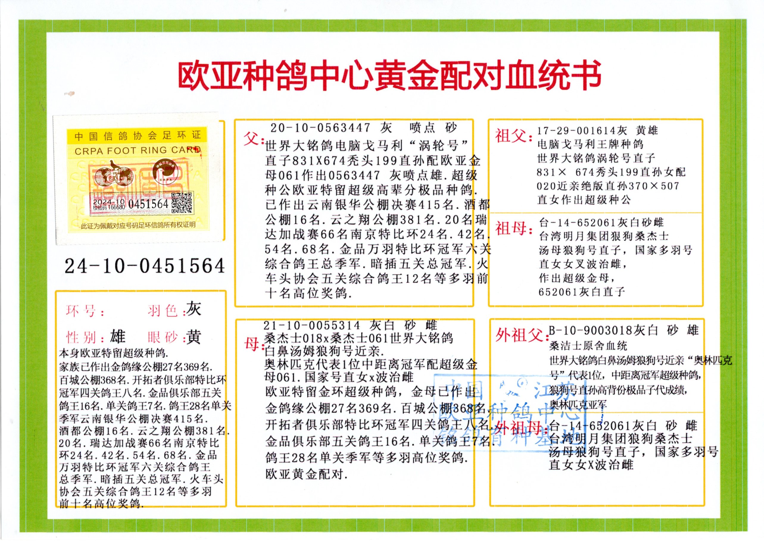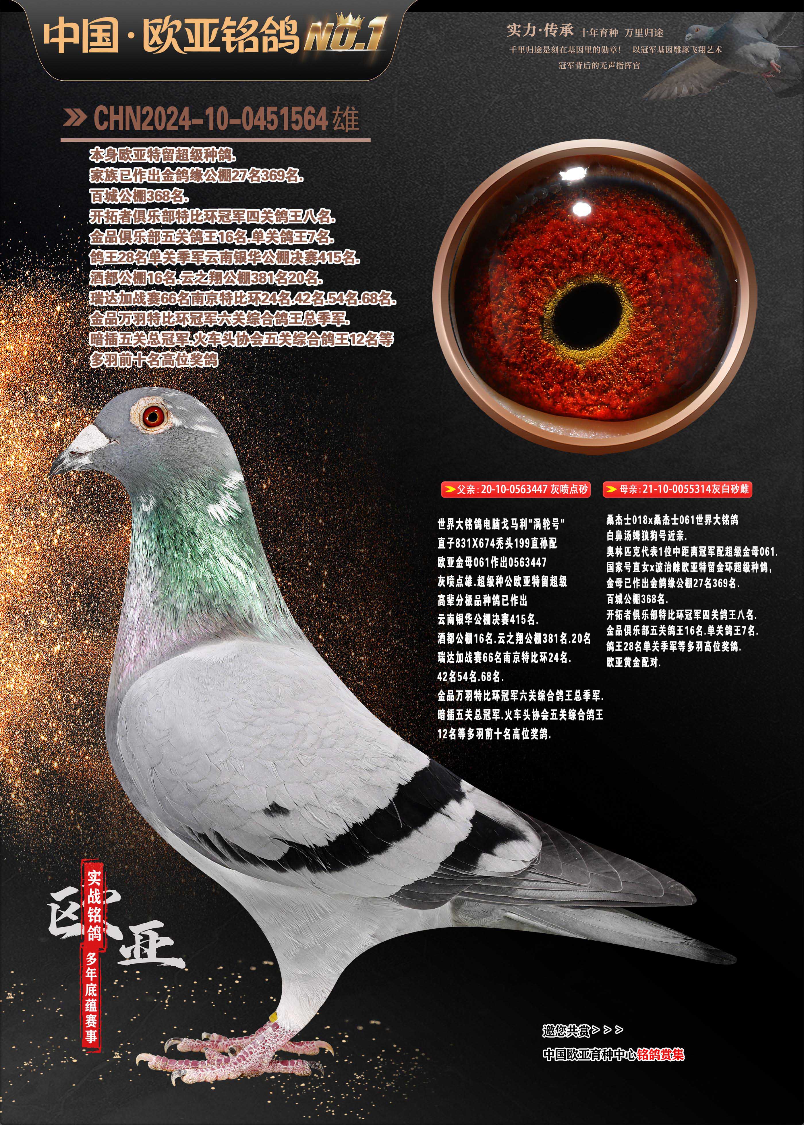 24年秋南京特比环欧亚荣获大团体冠军.小团体冠军551公里大特比13名.14名.16名.19名.20名.21名.24名.26名.27名.28名.42名.52名.54名.57名.65名.66名.68名.70名.71名.72名.74名.76名.80名.82名.83名.84名.85名.86名.90名.92名.110名.116名.121名.122名.128名.131名.158名.161名.164名.165名.166名.172名.174名.177名.182名.195名.196名.201名.205名.208名.210名.216名.253名.269名.275名.276名.294名.296名.299名,,24年秋云南天南铜都公棚决赛415名.天南铜都小棚决赛409名.云南玉活公棚决赛102名.490名.团体32名上笼二羽进二羽,天南铜都大棚506公里决赛445名。热烈祝贺河北省巨鹿县李兰生老师用欧亚泰山号血系连续十一年夺冠军,河北省国家赛冠军.全国季军等多次前十名高位,扬州王军王总用欧亚利奥24年春季获山东翔宇公棚决赛33名盖比53名。南京刘正龙刘总用欧亚盖比获得24年秋山东潍坊国际公棚决赛42名.精英赛30名.三关鸽王71名.决赛86名.加站赛16名.南京市特比环A组鸽王9名.B组鸽王5名.6名.C组鸽王5名.精英赛冠军4名.技能赛A组冠军4名.5名.秦淮区特比环荣获15名.46名.48名.87名。四川西昌徐亮徐总用欧亚利奥获得凉山州聚友决赛177名.第二关亚军双关鸽王19名.三关鸽王105名.云南豪庭公棚决赛603名。热烈祝贺24年四川重庆翔园鸽舍用欧亚泰山号荣获春季400公里冠军.秋季500公里冠军,河北王总用詹森X利奥获得千羽千翔公棚400公里冠军,广东蔡楷焕荣获24年秋爱好者 赛鸽俱乐部三关鸽王季军.一关420公里99名.二关450公里11名.三关520公里32名.单关季军.7名.12名,江西李卫兴荣获贵州红枫公棚8名.共翔俱乐部寄养棚四关综合鸽王30名.一关400公里78名.二关500公里55名.三关520公里37名.四关500公里57名.同父母获公棚18名.雷鸣获得武汉黄浦育翔中心冠军,四川陈文获得四川明鸿俱乐部300公里梦幻2名.3名.4名.9名.10名.13名.14名.15名.31名.34名.40名.41名.42名.43名.69名.71名.72名.73名.74名.94名.95名.97名.98名.99名.419公里决赛荣获总冠军7名.总共归巢9羽,四川徐亮获豪庭决赛603名,山西郑勇获得山西泰鑫公棚决赛255名詹森红狐,热烈祝贺马总获得开尔(飞跃队)决赛9名获奖金1310000万元.第一关52名,天津津福资赛180公里96名.获奖金429543万元,欧亚支持全国鸽友24年秋多人报喜 祝大家取得更好成绩,给欧亚报喜鸽友欧亚决定给每人赠送一羽超级种鸽。欧亚俱乐部特比环多关鸽王成绩:15年秋淮安特比环黑色星期一全会上笼9700多羽,当天无鸽归巢,第二天全会归巢357羽,本舍归巢158羽.前十名八羽.前一百名归巢57羽,16年春季获五关鸽王总冠军,总亚军四名.六名.七名.九名.十名.晶艺俱乐部520公里冠亚季军5名.6名.7名.9名.11名等,火车头冠军.季军6名.8名.9名.10名,16年秋晶艺俱乐部特比环520公里亚军.季军4名.6名.7名.9名,15年春南京白下特比环冠军.亚军.季军6名.7名.8名.9名.10名.指定鸽A B组获得冠军.亚军.季军4名.5名.,17年淮安特比环亚军.4名.5名.7名.8名.10名.六关鸽王总冠军.4名.6名.9名.10名,寄养棚宿迁刘总20羽特比环获冠军.季军.4名.7名.8名.9名等。18年荣获万羽特比环六关鸽王总冠军.总亚军.总季军.6名.8名.十名.单关四羽冠军.二羽亚军.四羽季军.前十名27羽。19年秋万羽特比环六关鸽王总亚军.总季军.5名.8名等,单关二羽冠军.三羽亚军.一羽季军前十名31羽。20年秋淮安市鸽会四关特比环大赛风雨无阻鸽王亚军.鸽王六名,金品俱乐部万羽特比环六关鸽王总冠军,总亚军.四名.五名.六名.七名.八名.十名.前二百名鸽王35羽,单关冠亚季军前十名四十多羽,火车头五关鸽王季军.六名.八名.前二百名鸽王十七羽。20年春荣获淮安五区一市四关鸽王总冠军.亚军.四名.八名.九名。21年秋荣获金品万羽特比环大赛六关鸽王总亚军.总季军.四名.七名.九名.十名.单关冠亚军季军前十名三十多羽。火车头协会鸽王六名.七名.十名.单关前十名十七羽。22年秋荣获鸽王总冠军.总亚军.5名.7名.8名.9名.11名.单关冠亚季军前十名三十多羽,第一关单关前二百名四十多羽,第二关前二百名三十多羽,第三关前二百名四十多羽,第四关前二百名四十多羽,第五关前一百名53羽。23年秋荣获鸽王季军.五名.八名.十名.13名.17名.20名.27名等多羽鸽王.单关前十名二十多羽。公棚.寄养棚部分成绩:16年秋宁夏黄河公棚总冠军电脑戈马力指定通炮冠军,17年送八羽参赛获得鸽王八名进奖四名,支持韩总荣获八名。支持鸽友荣获宁夏中卫公棚决赛总冠军.精英赛冠军,支持18年宁夏黄河公棚决赛冠军詹森X泰山。安徽鼎博寄养棚院内外四关鸽王总冠军.鸽王十七名.三十七名同窝,鸽王39名.42名.58名.67名。18年山东公棚预赛冠军.决赛65名.送八羽进奖五羽.指定获奔驰汽车一辆。支持鸽友获得云南蓝云公棚冠军.盖比X佛卡门。支持鸽友荣获云南银集公棚决赛冠军 詹森427X520血系 速度赛6700羽冠军。17年荣获金马俱乐部寄养棚四关鸽王总冠军.季军.六名.八名.第一关冠军.亚军.季军四名.七名.十一名.金牌教练奖。支持鸽友18年北京费翔公棚预赛九名电脑X桑杰士,支持鸽友荣获陕西威力公棚决赛11名.内蒙古临河寄养棚四关鸽王六名.詹森配泰山,支持河北王总用欧亚詹森427配胡本喜获20年秋开尔青年棚季军。云南东荣公棚16年预赛冠军.决赛77名.17年决赛12名.詹森红狐X泰山,17年平安公棚决赛4名 詹森427。欧亚获得21年金母寄养棚第一关四名.第二关5名.第三关5名.6名.7名.10名.三关鸽王总冠军,四关鸽王14名.十羽鸽王。支持河