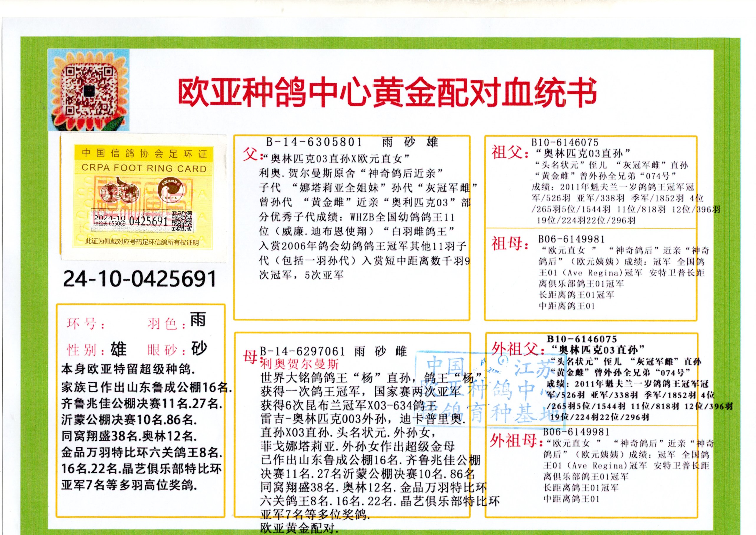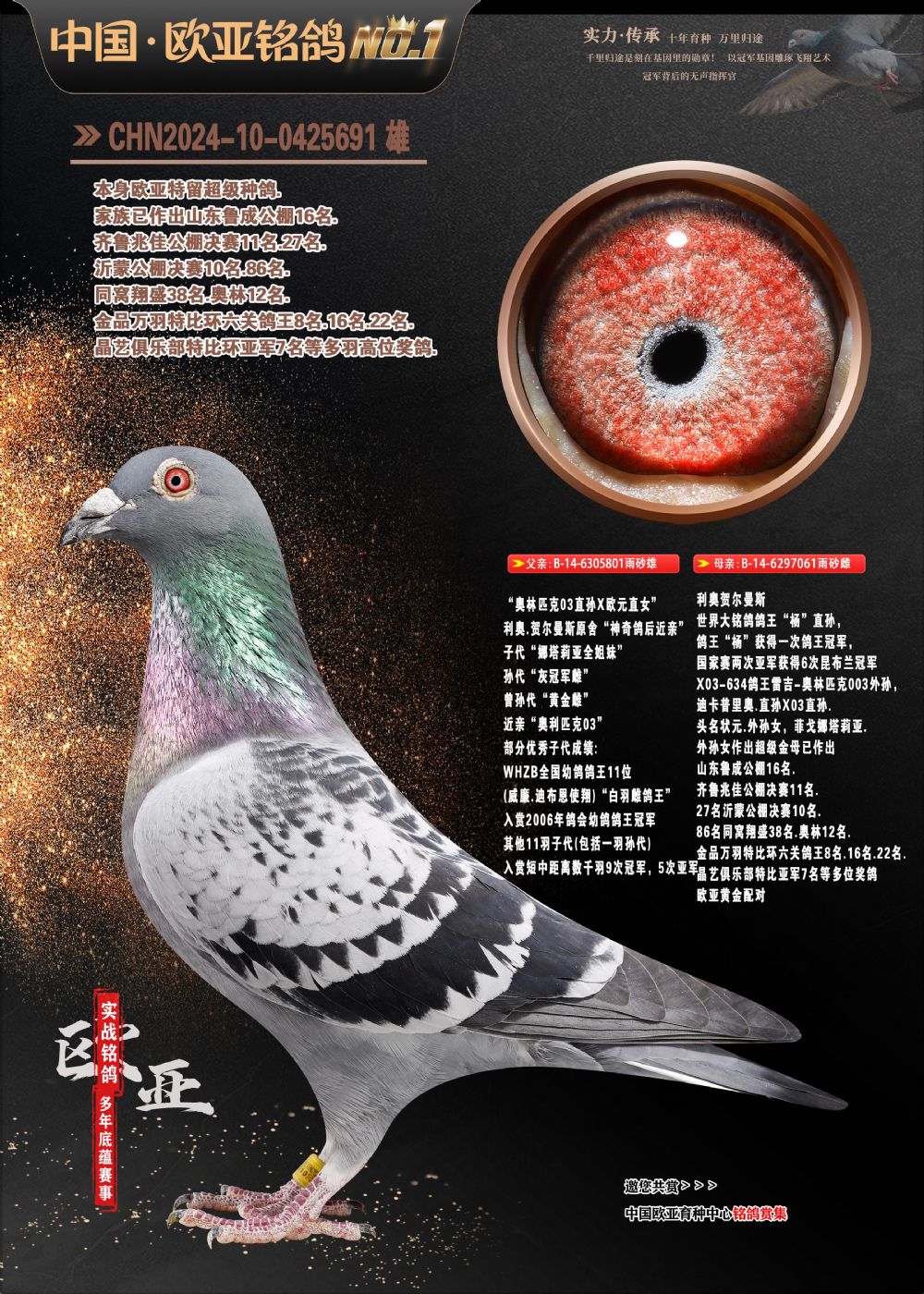 24年秋南京特比环欧亚荣获大团体冠军.小团体冠军551公里大特比13名.14名.16名.19名.20名.21名.24名.26名.27名.28名.42名.52名.54名.57名.65名.66名.68名.70名.71名.72名.74名.76名.80名.82名.83名.84名.85名.86名.90名.92名.110名.116名.121名.122名.128名.131名.158名.161名.164名.165名.166名.172名.174名.177名.182名.195名.196名.201名.205名.208名.210名.216名.253名.269名.275名.276名.294名.296名.299名,,24年秋云南天南铜都公棚决赛415名.天南铜都小棚决赛409名.云南玉活公棚决赛102名.490名.团体32名上笼二羽进二羽,天南铜都大棚506公里决赛445名。热烈祝贺河北省巨鹿县李兰生老师用欧亚泰山号血系连续十一年夺冠军,河北省国家赛冠军.全国季军等多次前十名高位,扬州王军王总用欧亚利奥24年春季获山东翔宇公棚决赛33名盖比53名。南京刘正龙刘总用欧亚盖比获得24年秋山东潍坊国际公棚决赛42名.精英赛30名.三关鸽王71名.决赛86名.加站赛16名.南京市特比环A组鸽王9名.B组鸽王5名.6名.C组鸽王5名.精英赛冠军4名.技能赛A组冠军4名.5名.秦淮区特比环荣获15名.46名.48名.87名。四川西昌徐亮徐总用欧亚利奥获得凉山州聚友决赛177名.第二关亚军双关鸽王19名.三关鸽王105名.云南豪庭公棚决赛603名。热烈祝贺24年四川重庆翔园鸽舍用欧亚泰山号荣获春季400公里冠军.秋季500公里冠军,河北王总用詹森X利奥获得千羽千翔公棚400公里冠军,广东蔡楷焕荣获24年秋爱好者 赛鸽俱乐部三关鸽王季军.一关420公里99名.二关450公里11名.三关520公里32名.单关季军.7名.12名,江西李卫兴荣获贵州红枫公棚8名.共翔俱乐部寄养棚四关综合鸽王30名.一关400公里78名.二关500公里55名.三关520公里37名.四关500公里57名.同父母获公棚18名.雷鸣获得武汉黄浦育翔中心冠军,四川陈文获得四川明鸿俱乐部300公里梦幻2名.3名.4名.9名.10名.13名.14名.15名.31名.34名.40名.41名.42名.43名.69名.71名.72名.73名.74名.94名.95名.97名.98名.99名.419公里决赛荣获总冠军7名.总共归巢9羽,四川徐亮获豪庭决赛603名,山西郑勇获得山西泰鑫公棚决赛255名詹森红狐,热烈祝贺马总获得开尔(飞跃队)决赛9名获奖金1310000万元.第一关52名,天津津福资赛180公里96名.获奖金429543万元,欧亚支持全国鸽友24年秋多人报喜 祝大家取得更好成绩,给欧亚报喜鸽友欧亚决定给每人赠送一羽超级种鸽。欧亚俱乐部特比环多关鸽王成绩:15年秋淮安特比环黑色星期一全会上笼9700多羽,当天无鸽归巢,第二天全会归巢357羽,本舍归巢158羽.前十名八羽.前一百名归巢57羽,16年春季获五关鸽王总冠军,总亚军四名.六名.七名.九名.十名.晶艺俱乐部520公里冠亚季军5名.6名.7名.9名.11名等,火车头冠军.季军6名.8名.9名.10名,16年秋晶艺俱乐部特比环520公里亚军.季军4名.6名.7名.9名,15年春南京白下特比环冠军.亚军.季军6名.7名.8名.9名.10名.指定鸽A B组获得冠军.亚军.季军4名.5名.,17年淮安特比环亚军.4名.5名.7名.8名.10名.六关鸽王总冠军.4名.6名.9名.10名,寄养棚宿迁刘总20羽特比环获冠军.季军.4名.7名.8名.9名等。18年荣获万羽特比环六关鸽王总冠军.总亚军.总季军.6名.8名.十名.单关四羽冠军.二羽亚军.四羽季军.前十名27羽。19年秋万羽特比环六关鸽王总亚军.总季军.5名.8名等,单关二羽冠军.三羽亚军.一羽季军前十名31羽。20年秋淮安市鸽会四关特比环大赛风雨无阻鸽王亚军.鸽王六名,金品俱乐部万羽特比环六关鸽王总冠军,总亚军.四名.五名.六名.七名.八名.十名.前二百名鸽王35羽,单关冠亚季军前十名四十多羽,火车头五关鸽王季军.六名.八名.前二百名鸽王十七羽。20年春荣获淮安五区一市四关鸽王总冠军.亚军.四名.八名.九名。21年秋荣获金品万羽特比环大赛六关鸽王总亚军.总季军.四名.七名.九名.十名.单关冠亚军季军前十名三十多羽。火车头协会鸽王六名.七名.十名.单关前十名十七羽。22年秋荣获鸽王总冠军.总亚军.5名.7名.8名.9名.11名.单关冠亚季军前十名三十多羽,第一关单关前二百名四十多羽,第二关前二百名三十多羽,第三关前二百名四十多羽,第四关前二百名四十多羽,第五关前一百名53羽。23年秋荣获鸽王季军.五名.八名.十名.13名.17名.20名.27名等多羽鸽王.单关前十名二十多羽。公棚.寄养棚部分成绩:16年秋宁夏黄河公棚总冠军电脑戈马力指定通炮冠军,17年送八羽参赛获得鸽王八名进奖四名,支持韩总荣获八名。支持鸽友荣获宁夏中卫公棚决赛总冠军.精英赛冠军,支持18年宁夏黄河公棚决赛冠军詹森X泰山。安徽鼎博寄养棚院内外四关鸽王总冠军.鸽王十七名.三十七名同窝,鸽王39名.42名.58名.67名。18年山东公棚预赛冠军.决赛65名.送八羽进奖五羽.指定获奔驰汽车一辆。支持鸽友获得云南蓝云公棚冠军.盖比X佛卡门。支持鸽友荣获云南银集公棚决赛冠军 詹森427X520血系 速度赛6700羽冠军。17年荣获金马俱乐部寄养棚四关鸽王总冠军.季军.六名.八名.第一关冠军.亚军.季军四名.七名.十一名.金牌教练奖。支持鸽友18年北京费翔公棚预赛九名电脑X桑杰士,支持鸽友荣获陕西威力公棚决赛11名.内蒙古临河寄养棚四关鸽王六名.詹森配泰山,支持河北王总用欧亚詹森427配胡本喜获20年秋开尔青年棚季军。云南东荣公棚16年预赛冠军.决赛77名.17年决赛12名.詹森红狐X泰山,17年平安公棚决赛4名 詹森427。欧亚获得21年金母寄养棚第一关四名.第二关5名.第三关5名.6名.7名.10名.三关鸽王总冠军,四关鸽王14名.十羽鸽王。支持河