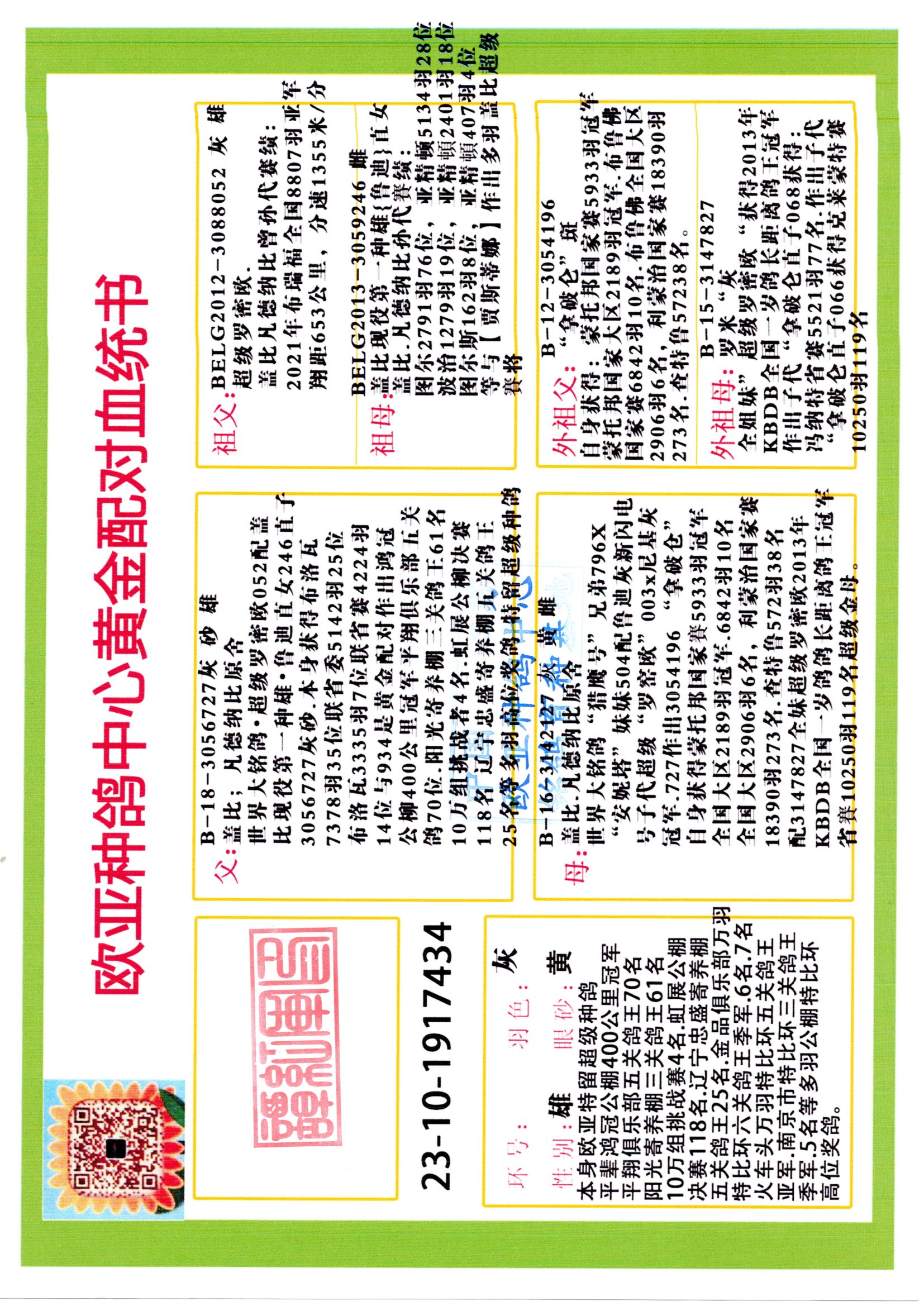 24年秋南京特比环欧亚荣获大团体冠军.小团体冠军551公里大特比13名.14名.16名.19名.20名.21名.24名.26名.27名.28名.42名.52名.54名.57名.65名.66名.68名.70名.71名.72名.74名.76名.80名.82名.83名.84名.85名.86名.90名.92名.110名.116名.121名.122名.128名.131名.158名.161名.164名.165名.166名.172名.174名.177名.182名.195名.196名.201名.205名.208名.210名.216名.253名.269名.275名.276名.294名.296名.299名,,24年秋云南天南铜都公棚决赛415名.天南铜都小棚决赛409名.云南玉活公棚决赛102名.490名.团体32名上笼二羽进二羽,天南铜都大棚506公里决赛445名。热烈祝贺河北省巨鹿县李兰生老师用欧亚泰山号血系连续十一年夺冠军,河北省国家赛冠军.全国季军等多次前十名高位,扬州王军王总用欧亚利奥24年春季获山东翔宇公棚决赛33名盖比53名。南京刘正龙刘总用欧亚盖比获得24年秋山东潍坊国际公棚决赛42名.精英赛30名.三关鸽王71名.决赛86名.加站赛16名.南京市特比环A组鸽王9名.B组鸽王5名.6名.C组鸽王5名.精英赛冠军4名.技能赛A组冠军4名.5名.秦淮区特比环荣获15名.46名.48名.87名。四川西昌徐亮徐总用欧亚利奥获得凉山州聚友决赛177名.第二关亚军双关鸽王19名.三关鸽王105名.云南豪庭公棚决赛603名。热烈祝贺24年四川重庆翔园鸽舍用欧亚泰山号荣获春季400公里冠军.秋季500公里冠军,河北王总用詹森X利奥获得千羽千翔公棚400公里冠军,广东蔡楷焕荣获24年秋爱好者 赛鸽俱乐部三关鸽王季军.一关420公里99名.二关450公里11名.三关520公里32名.单关季军.7名.12名,江西李卫兴荣获贵州红枫公棚8名.共翔俱乐部寄养棚四关综合鸽王30名.一关400公里78名.二关500公里55名.三关520公里37名.四关500公里57名.同父母获公棚18名.雷鸣获得武汉黄浦育翔中心冠军,四川陈文获得四川明鸿俱乐部300公里梦幻2名.3名.4名.9名.10名.13名.14名.15名.31名.34名.40名.41名.42名.43名.69名.71名.72名.73名.74名.94名.95名.97名.98名.99名.419公里决赛荣获总冠军7名.总共归巢9羽,四川徐亮获豪庭决赛603名,山西郑勇获得山西泰鑫公棚决赛255名詹森红狐,热烈祝贺马总获得开尔(飞跃队)决赛9名获奖金1310000万元.第一关52名,天津津福资赛180公里96名.获奖金429543万元,欧亚支持全国鸽友24年秋多人报喜 祝大家取得更好成绩,给欧亚报喜鸽友欧亚决定给每人赠送一羽超级种鸽。欧亚俱乐部特比环多关鸽王成绩:15年秋淮安特比环黑色星期一全会上笼9700多羽,当天无鸽归巢,第二天全会归巢357羽,本舍归巢158羽.前十名八羽.前一百名归巢57羽,16年春季获五关鸽王总冠军,总亚军四名.六名.七名.九名.十名.晶艺俱乐部520公里冠亚季军5名.6名.7名.9名.11名等,火车头冠军.季军6名.8名.9名.10名,16年秋晶艺俱乐部特比环520公里亚军.季军4名.6名.7名.9名,15年春南京白下特比环冠军.亚军.季军6名.7名.8名.9名.10名.指定鸽A B组获得冠军.亚军.季军4名.5名.,17年淮安特比环亚军.4名.5名.7名.8名.10名.六关鸽王总冠军.4名.6名.9名.10名,寄养棚宿迁刘总20羽特比环获冠军.季军.4名.7名.8名.9名等。18年荣获万羽特比环六关鸽王总冠军.总亚军.总季军.6名.8名.十名.单关四羽冠军.二羽亚军.四羽季军.前十名27羽。19年秋万羽特比环六关鸽王总亚军.总季军.5名.8名等,单关二羽冠军.三羽亚军.一羽季军前十名31羽。20年秋淮安市鸽会四关特比环大赛风雨无阻鸽王亚军.鸽王六名,金品俱乐部万羽特比环六关鸽王总冠军,总亚军.四名.五名.六名.七名.八名.十名.前二百名鸽王35羽,单关冠亚季军前十名四十多羽,火车头五关鸽王季军.六名.八名.前二百名鸽王十七羽。20年春荣获淮安五区一市四关鸽王总冠军.亚军.四名.八名.九名。21年秋荣获金品万羽特比环大赛六关鸽王总亚军.总季军.四名.七名.九名.十名.单关冠亚军季军前十名三十多羽。火车头协会鸽王六名.七名.十名.单关前十名十七羽。22年秋荣获鸽王总冠军.总亚军.5名.7名.8名.9名.11名.单关冠亚季军前十名三十多羽,第一关单关前二百名四十多羽,第二关前二百名三十多羽,第三关前二百名四十多羽,第四关前二百名四十多羽,第五关前一百名53羽。23年秋荣获鸽王季军.五名.八名.十名.13名.17名.20名.27名等多羽鸽王.单关前十名二十多羽。公棚.寄养棚部分成绩:16年秋宁夏黄河公棚总冠军电脑戈马力指定通炮冠军,17年送八羽参赛获得鸽王八名进奖四名,支持韩总荣获八名。支持鸽友荣获宁夏中卫公棚决赛总冠军.精英赛冠军,支持18年宁夏黄河公棚决赛冠军詹森X泰山。安徽鼎博寄养棚院内外四关鸽王总冠军.鸽王十七名.三十七名同窝,鸽王39名.42名.58名.67名。18年山东公棚预赛冠军.决赛65名.送八羽进奖五羽.指定获奔驰汽车一辆。支持鸽友获得云南蓝云公棚冠军.盖比X佛卡门。支持鸽友荣获云南银集公棚决赛冠军 詹森427X520血系 速度赛6700羽冠军。17年荣获金马俱乐部寄养棚四关鸽王总冠军.季军.六名.八名.第一关冠军.亚军.季军四名.七名.十一名.金牌教练奖。支持鸽友18年北京费翔公棚预赛九名电脑X桑杰士,支持鸽友荣获陕西威力公棚决赛11名.内蒙古临河寄养棚四关鸽王六名.詹森配泰山,支持河北王总用欧亚詹森427配胡本喜获20年秋开尔青年棚季军。云南东荣公棚16年预赛冠军.决赛77名.17年决赛12名.詹森红狐X泰山,17年平安公棚决赛4名 詹森427。欧亚获得21年金母寄养棚第一关四名.第二关5名.第三关5名.6名.7名.10名.三关鸽王总冠军,四关鸽王14名.十羽鸽王。支持河