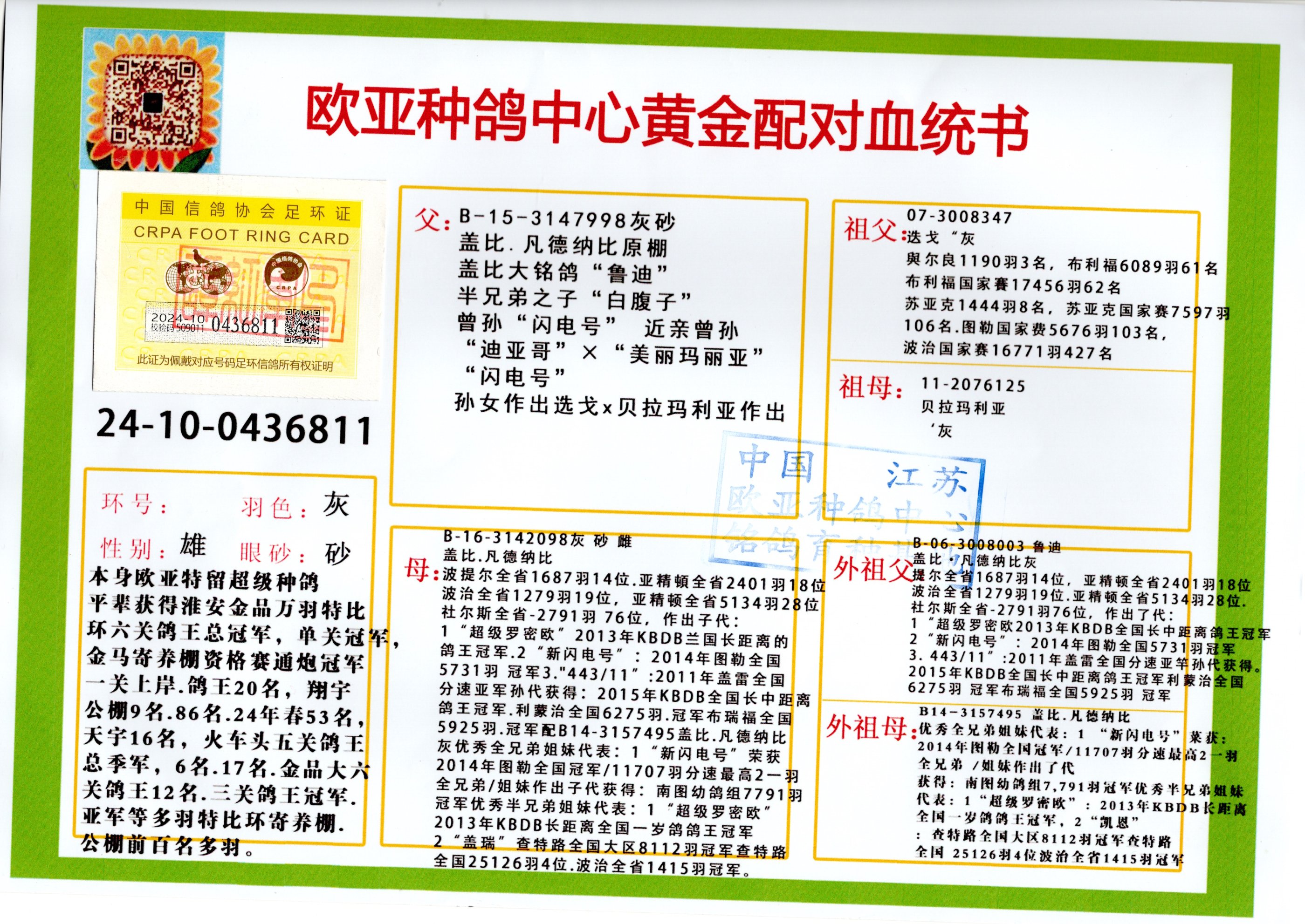 24年秋南京特比环欧亚荣获大团体冠军.小团体冠军551公里大特比13名.14名.16名.19名.20名.21名.24名.26名.27名.28名.42名.52名.54名.57名.65名.66名.68名.70名.71名.72名.74名.76名.80名.82名.83名.84名.85名.86名.90名.92名.110名.116名.121名.122名.128名.131名.158名.161名.164名.165名.166名.172名.174名.177名.182名.195名.196名.201名.205名.208名.210名.216名.253名.269名.275名.276名.294名.296名.299名,,24年秋云南天南铜都公棚决赛415名.天南铜都小棚决赛409名.云南玉活公棚决赛102名.490名.团体32名上笼二羽进二羽,天南铜都大棚506公里决赛445名。热烈祝贺河北省巨鹿县李兰生老师用欧亚泰山号血系连续十一年夺冠军,河北省国家赛冠军.全国季军等多次前十名高位,扬州王军王总用欧亚利奥24年春季获山东翔宇公棚决赛33名盖比53名。南京刘正龙刘总用欧亚盖比获得24年秋山东潍坊国际公棚决赛42名.精英赛30名.三关鸽王71名.决赛86名.加站赛16名.南京市特比环A组鸽王9名.B组鸽王5名.6名.C组鸽王5名.精英赛冠军4名.技能赛A组冠军4名.5名.秦淮区特比环荣获15名.46名.48名.87名。四川西昌徐亮徐总用欧亚利奥获得凉山州聚友决赛177名.第二关亚军双关鸽王19名.三关鸽王105名.云南豪庭公棚决赛603名。热烈祝贺24年四川重庆翔园鸽舍用欧亚泰山号荣获春季400公里冠军.秋季500公里冠军,河北王总用詹森X利奥获得千羽千翔公棚400公里冠军,广东蔡楷焕荣获24年秋爱好者 赛鸽俱乐部三关鸽王季军.一关420公里99名.二关450公里11名.三关520公里32名.单关季军.7名.12名,江西李卫兴荣获贵州红枫公棚8名.共翔俱乐部寄养棚四关综合鸽王30名.一关400公里78名.二关500公里55名.三关520公里37名.四关500公里57名.同父母获公棚18名.雷鸣获得武汉黄浦育翔中心冠军,四川陈文获得四川明鸿俱乐部300公里梦幻2名.3名.4名.9名.10名.13名.14名.15名.31名.34名.40名.41名.42名.43名.69名.71名.72名.73名.74名.94名.95名.97名.98名.99名.419公里决赛荣获总冠军7名.总共归巢9羽,四川徐亮获豪庭决赛603名,山西郑勇获得山西泰鑫公棚决赛255名詹森红狐,热烈祝贺马总获得开尔(飞跃队)决赛9名获奖金1310000万元.第一关52名,天津津福资赛180公里96名.获奖金429543万元,欧亚支持全国鸽友24年秋多人报喜 祝大家取得更好成绩,给欧亚报喜鸽友欧亚决定给每人赠送一羽超级种鸽。欧亚俱乐部特比环多关鸽王成绩:15年秋淮安特比环黑色星期一全会上笼9700多羽,当天无鸽归巢,第二天全会归巢357羽,本舍归巢158羽.前十名八羽.前一百名归巢57羽,16年春季获五关鸽王总冠军,总亚军四名.六名.七名.九名.十名.晶艺俱乐部520公里冠亚季军5名.6名.7名.9名.11名等,火车头冠军.季军6名.8名.9名.10名,16年秋晶艺俱乐部特比环520公里亚军.季军4名.6名.7名.9名,15年春南京白下特比环冠军.亚军.季军6名.7名.8名.9名.10名.指定鸽A B组获得冠军.亚军.季军4名.5名.,17年淮安特比环亚军.4名.5名.7名.8名.10名.六关鸽王总冠军.4名.6名.9名.10名,寄养棚宿迁刘总20羽特比环获冠军.季军.4名.7名.8名.9名等。18年荣获万羽特比环六关鸽王总冠军.总亚军.总季军.6名.8名.十名.单关四羽冠军.二羽亚军.四羽季军.前十名27羽。19年秋万羽特比环六关鸽王总亚军.总季军.5名.8名等,单关二羽冠军.三羽亚军.一羽季军前十名31羽。20年秋淮安市鸽会四关特比环大赛风雨无阻鸽王亚军.鸽王六名,金品俱乐部万羽特比环六关鸽王总冠军,总亚军.四名.五名.六名.七名.八名.十名.前二百名鸽王35羽,单关冠亚季军前十名四十多羽,火车头五关鸽王季军.六名.八名.前二百名鸽王十七羽。20年春荣获淮安五区一市四关鸽王总冠军.亚军.四名.八名.九名。21年秋荣获金品万羽特比环大赛六关鸽王总亚军.总季军.四名.七名.九名.十名.单关冠亚军季军前十名三十多羽。火车头协会鸽王六名.七名.十名.单关前十名十七羽。22年秋荣获鸽王总冠军.总亚军.5名.7名.8名.9名.11名.单关冠亚季军前十名三十多羽,第一关单关前二百名四十多羽,第二关前二百名三十多羽,第三关前二百名四十多羽,第四关前二百名四十多羽,第五关前一百名53羽。23年秋荣获鸽王季军.五名.八名.十名.13名.17名.20名.27名等多羽鸽王.单关前十名二十多羽。公棚.寄养棚部分成绩:16年秋宁夏黄河公棚总冠军电脑戈马力指定通炮冠军,17年送八羽参赛获得鸽王八名进奖四名,支持韩总荣获八名。支持鸽友荣获宁夏中卫公棚决赛总冠军.精英赛冠军,支持18年宁夏黄河公棚决赛冠军詹森X泰山。安徽鼎博寄养棚院内外四关鸽王总冠军.鸽王十七名.三十七名同窝,鸽王39名.42名.58名.67名。18年山东公棚预赛冠军.决赛65名.送八羽进奖五羽.指定获奔驰汽车一辆。支持鸽友获得云南蓝云公棚冠军.盖比X佛卡门。支持鸽友荣获云南银集公棚决赛冠军 詹森427X520血系 速度赛6700羽冠军。17年荣获金马俱乐部寄养棚四关鸽王总冠军.季军.六名.八名.第一关冠军.亚军.季军四名.七名.十一名.金牌教练奖。支持鸽友18年北京费翔公棚预赛九名电脑X桑杰士,支持鸽友荣获陕西威力公棚决赛11名.内蒙古临河寄养棚四关鸽王六名.詹森配泰山,支持河北王总用欧亚詹森427配胡本喜获20年秋开尔青年棚季军。云南东荣公棚16年预赛冠军.决赛77名.17年决赛12名.詹森红狐X泰山,17年平安公棚决赛4名 詹森427。欧亚获得21年金母寄养棚第一关四名.第二关5名.第三关5名.6名.7名.10名.三关鸽王总冠军,四关鸽王14名.十羽鸽王。支持河