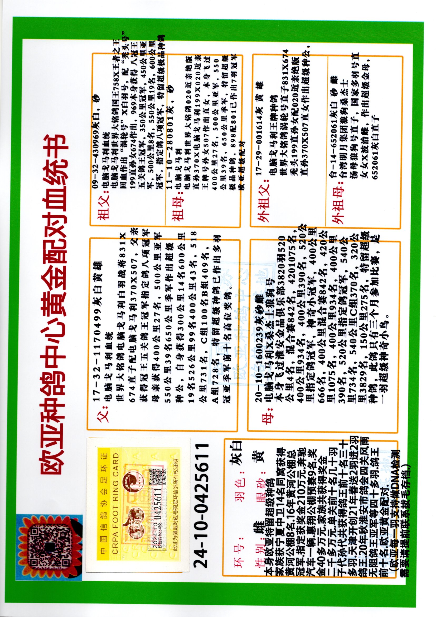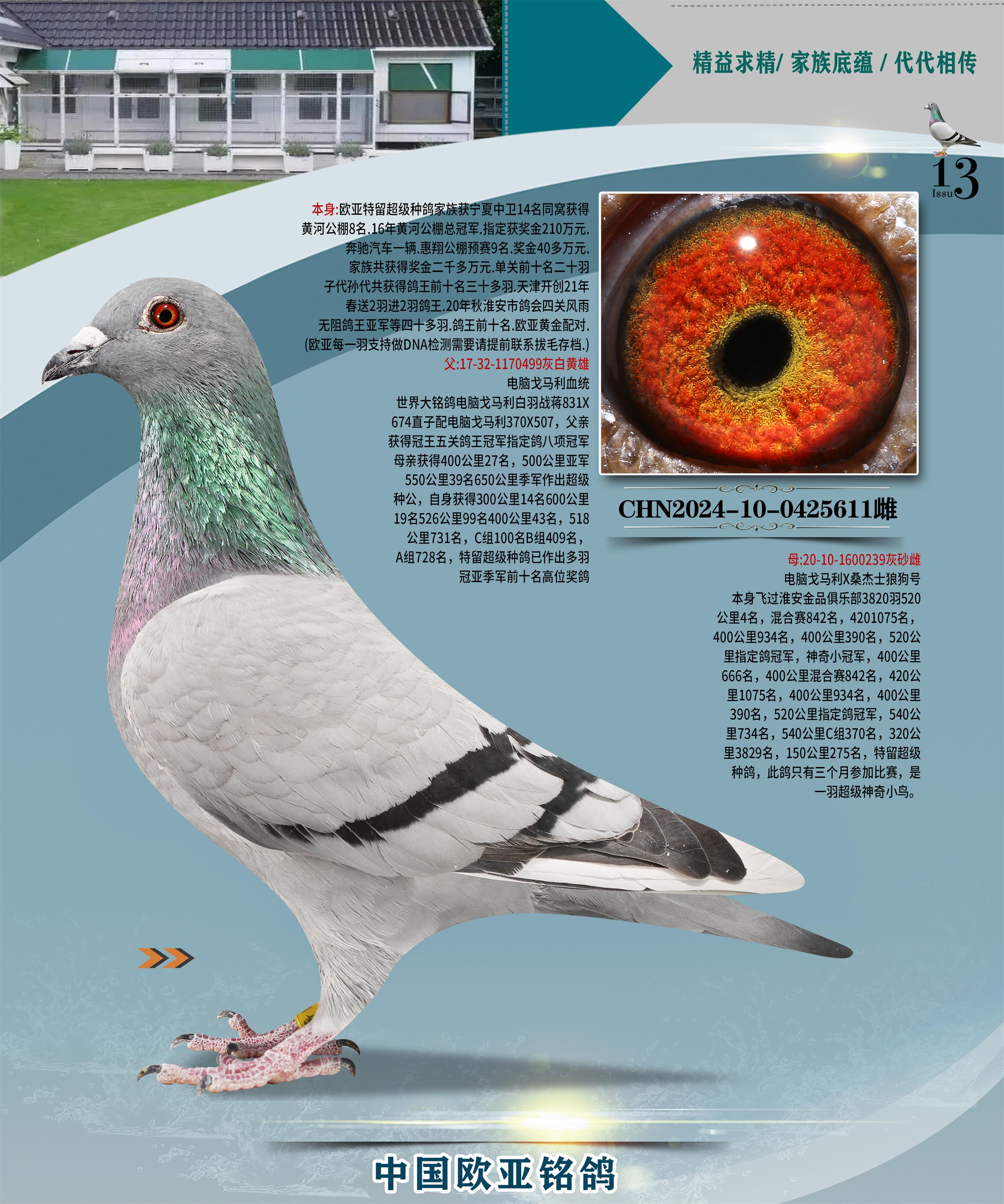 24年秋南京特比环欧亚荣获大团体冠军.小团体冠军551公里大特比13名.14名.16名.19名.20名.21名.24名.26名.27名.28名.42名.52名.54名.57名.65名.66名.68名.70名.71名.72名.74名.76名.80名.82名.83名.84名.85名.86名.90名.92名.110名.116名.121名.122名.128名.131名.158名.161名.164名.165名.166名.172名.174名.177名.182名.195名.196名.201名.205名.208名.210名.216名.253名.269名.275名.276名.294名.296名.299名,,24年秋云南天南铜都公棚决赛415名.天南铜都小棚决赛409名.云南玉活公棚决赛102名.490名.团体32名上笼二羽进二羽,天南铜都大棚506公里决赛445名。热烈祝贺河北省巨鹿县李兰生老师用欧亚泰山号血系连续十一年夺冠军,河北省国家赛冠军.全国季军等多次前十名高位,扬州王军王总用欧亚利奥24年春季获山东翔宇公棚决赛33名盖比53名。南京刘正龙刘总用欧亚盖比获得24年秋山东潍坊国际公棚决赛42名.精英赛30名.三关鸽王71名.决赛86名.加站赛16名.南京市特比环A组鸽王9名.B组鸽王5名.6名.C组鸽王5名.精英赛冠军4名.技能赛A组冠军4名.5名.秦淮区特比环荣获15名.46名.48名.87名。四川西昌徐亮徐总用欧亚利奥获得凉山州聚友决赛177名.第二关亚军双关鸽王19名.三关鸽王105名.云南豪庭公棚决赛603名。热烈祝贺24年四川重庆翔园鸽舍用欧亚泰山号荣获春季400公里冠军.秋季500公里冠军,河北王总用詹森X利奥获得千羽千翔公棚400公里冠军,广东蔡楷焕荣获24年秋爱好者 赛鸽俱乐部三关鸽王季军.一关420公里99名.二关450公里11名.三关520公里32名.单关季军.7名.12名,江西李卫兴荣获贵州红枫公棚8名.共翔俱乐部寄养棚四关综合鸽王30名.一关400公里78名.二关500公里55名.三关520公里37名.四关500公里57名.同父母获公棚18名.雷鸣获得武汉黄浦育翔中心冠军,四川陈文获得四川明鸿俱乐部300公里梦幻2名.3名.4名.9名.10名.13名.14名.15名.31名.34名.40名.41名.42名.43名.69名.71名.72名.73名.74名.94名.95名.97名.98名.99名.419公里决赛荣获总冠军7名.总共归巢9羽,四川徐亮获豪庭决赛603名,山西郑勇获得山西泰鑫公棚决赛255名詹森红狐,热烈祝贺马总获得开尔(飞跃队)决赛9名获奖金1310000万元.第一关52名,天津津福资赛180公里96名.获奖金429543万元,欧亚支持全国鸽友24年秋多人报喜 祝大家取得更好成绩,给欧亚报喜鸽友欧亚决定给每人赠送一羽超级种鸽。欧亚俱乐部特比环多关鸽王成绩:15年秋淮安特比环黑色星期一全会上笼9700多羽,当天无鸽归巢,第二天全会归巢357羽,本舍归巢158羽.前十名八羽.前一百名归巢57羽,16年春季获五关鸽王总冠军,总亚军四名.六名.七名.九名.十名.晶艺俱乐部520公里冠亚季军5名.6名.7名.9名.11名等,火车头冠军.季军6名.8名.9名.10名,16年秋晶艺俱乐部特比环520公里亚军.季军4名.6名.7名.9名,15年春南京白下特比环冠军.亚军.季军6名.7名.8名.9名.10名.指定鸽A B组获得冠军.亚军.季军4名.5名.,17年淮安特比环亚军.4名.5名.7名.8名.10名.六关鸽王总冠军.4名.6名.9名.10名,寄养棚宿迁刘总20羽特比环获冠军.季军.4名.7名.8名.9名等。18年荣获万羽特比环六关鸽王总冠军.总亚军.总季军.6名.8名.十名.单关四羽冠军.二羽亚军.四羽季军.前十名27羽。19年秋万羽特比环六关鸽王总亚军.总季军.5名.8名等,单关二羽冠军.三羽亚军.一羽季军前十名31羽。20年秋淮安市鸽会四关特比环大赛风雨无阻鸽王亚军.鸽王六名,金品俱乐部万羽特比环六关鸽王总冠军,总亚军.四名.五名.六名.七名.八名.十名.前二百名鸽王35羽,单关冠亚季军前十名四十多羽,火车头五关鸽王季军.六名.八名.前二百名鸽王十七羽。20年春荣获淮安五区一市四关鸽王总冠军.亚军.四名.八名.九名。21年秋荣获金品万羽特比环大赛六关鸽王总亚军.总季军.四名.七名.九名.十名.单关冠亚军季军前十名三十多羽。火车头协会鸽王六名.七名.十名.单关前十名十七羽。22年秋荣获鸽王总冠军.总亚军.5名.7名.8名.9名.11名.单关冠亚季军前十名三十多羽,第一关单关前二百名四十多羽,第二关前二百名三十多羽,第三关前二百名四十多羽,第四关前二百名四十多羽,第五关前一百名53羽。23年秋荣获鸽王季军.五名.八名.十名.13名.17名.20名.27名等多羽鸽王.单关前十名二十多羽。公棚.寄养棚部分成绩:16年秋宁夏黄河公棚总冠军电脑戈马力指定通炮冠军,17年送八羽参赛获得鸽王八名进奖四名,支持韩总荣获八名。支持鸽友荣获宁夏中卫公棚决赛总冠军.精英赛冠军,支持18年宁夏黄河公棚决赛冠军詹森X泰山。安徽鼎博寄养棚院内外四关鸽王总冠军.鸽王十七名.三十七名同窝,鸽王39名.42名.58名.67名。18年山东公棚预赛冠军.决赛65名.送八羽进奖五羽.指定获奔驰汽车一辆。支持鸽友获得云南蓝云公棚冠军.盖比X佛卡门。支持鸽友荣获云南银集公棚决赛冠军 詹森427X520血系 速度赛6700羽冠军。17年荣获金马俱乐部寄养棚四关鸽王总冠军.季军.六名.八名.第一关冠军.亚军.季军四名.七名.十一名.金牌教练奖。支持鸽友18年北京费翔公棚预赛九名电脑X桑杰士,支持鸽友荣获陕西威力公棚决赛11名.内蒙古临河寄养棚四关鸽王六名.詹森配泰山,支持河北王总用欧亚詹森427配胡本喜获20年秋开尔青年棚季军。云南东荣公棚16年预赛冠军.决赛77名.17年决赛12名.詹森红狐X泰山,17年平安公棚决赛4名 詹森427。欧亚获得21年金母寄养棚第一关四名.第二关5名.第三关5名.6名.7名.10名.三关鸽王总冠军,四关鸽王14名.十羽鸽王。支持河