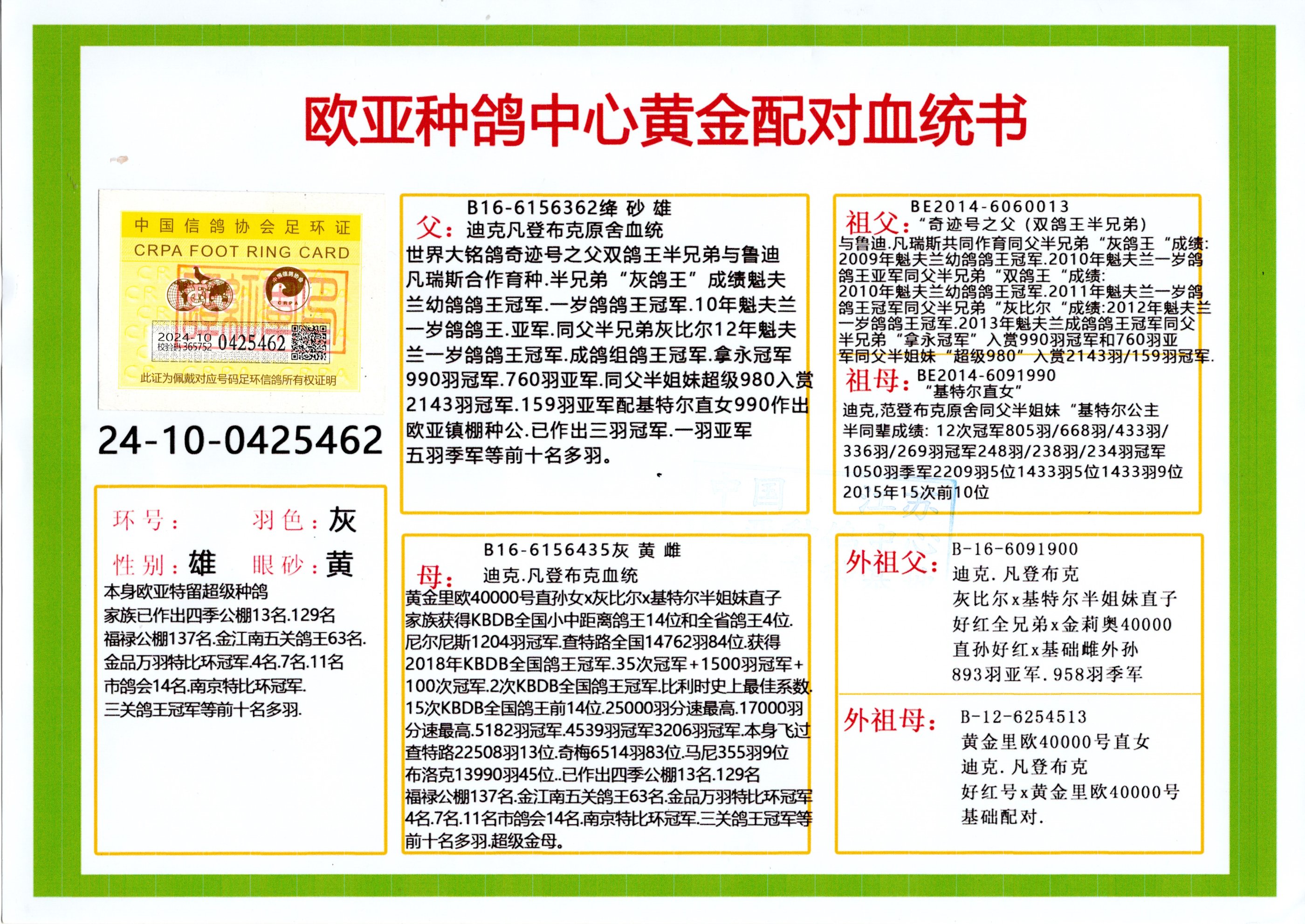 24年秋南京特比环欧亚荣获大团体冠军.小团体冠军551公里大特比13名.14名.16名.19名.20名.21名.24名.26名.27名.28名.42名.52名.54名.57名.65名.66名.68名.70名.71名.72名.74名.76名.80名.82名.83名.84名.85名.86名.90名.92名.110名.116名.121名.122名.128名.131名.158名.161名.164名.165名.166名.172名.174名.177名.182名.195名.196名.201名.205名.208名.210名.216名.253名.269名.275名.276名.294名.296名.299名,,24年秋云南天南铜都公棚决赛415名.天南铜都小棚决赛409名.云南玉活公棚决赛102名.490名.团体32名上笼二羽进二羽,天南铜都大棚506公里决赛445名。热烈祝贺河北省巨鹿县李兰生老师用欧亚泰山号血系连续十一年夺冠军,河北省国家赛冠军.全国季军等多次前十名高位,扬州王军王总用欧亚利奥24年春季获山东翔宇公棚决赛33名盖比53名。南京刘正龙刘总用欧亚盖比获得24年秋山东潍坊国际公棚决赛42名.精英赛30名.三关鸽王71名.决赛86名.加站赛16名.南京市特比环A组鸽王9名.B组鸽王5名.6名.C组鸽王5名.精英赛冠军4名.技能赛A组冠军4名.5名.秦淮区特比环荣获15名.46名.48名.87名。四川西昌徐亮徐总用欧亚利奥获得凉山州聚友决赛177名.第二关亚军双关鸽王19名.三关鸽王105名.云南豪庭公棚决赛603名。热烈祝贺24年四川重庆翔园鸽舍用欧亚泰山号荣获春季400公里冠军.秋季500公里冠军,河北王总用詹森X利奥获得千羽千翔公棚400公里冠军,广东蔡楷焕荣获24年秋爱好者 赛鸽俱乐部三关鸽王季军.一关420公里99名.二关450公里11名.三关520公里32名.单关季军.7名.12名,江西李卫兴荣获贵州红枫公棚8名.共翔俱乐部寄养棚四关综合鸽王30名.一关400公里78名.二关500公里55名.三关520公里37名.四关500公里57名.同父母获公棚18名.雷鸣获得武汉黄浦育翔中心冠军,四川陈文获得四川明鸿俱乐部300公里梦幻2名.3名.4名.9名.10名.13名.14名.15名.31名.34名.40名.41名.42名.43名.69名.71名.72名.73名.74名.94名.95名.97名.98名.99名.419公里决赛荣获总冠军7名.总共归巢9羽,四川徐亮获豪庭决赛603名,山西郑勇获得山西泰鑫公棚决赛255名詹森红狐,热烈祝贺马总获得开尔(飞跃队)决赛9名获奖金1310000万元.第一关52名,天津津福资赛180公里96名.获奖金429543万元,欧亚支持全国鸽友24年秋多人报喜 祝大家取得更好成绩,给欧亚报喜鸽友欧亚决定给每人赠送一羽超级种鸽。欧亚俱乐部特比环多关鸽王成绩:15年秋淮安特比环黑色星期一全会上笼9700多羽,当天无鸽归巢,第二天全会归巢357羽,本舍归巢158羽.前十名八羽.前一百名归巢57羽,16年春季获五关鸽王总冠军,总亚军四名.六名.七名.九名.十名.晶艺俱乐部520公里冠亚季军5名.6名.7名.9名.11名等,火车头冠军.季军6名.8名.9名.10名,16年秋晶艺俱乐部特比环520公里亚军.季军4名.6名.7名.9名,15年春南京白下特比环冠军.亚军.季军6名.7名.8名.9名.10名.指定鸽A B组获得冠军.亚军.季军4名.5名.,17年淮安特比环亚军.4名.5名.7名.8名.10名.六关鸽王总冠军.4名.6名.9名.10名,寄养棚宿迁刘总20羽特比环获冠军.季军.4名.7名.8名.9名等。18年荣获万羽特比环六关鸽王总冠军.总亚军.总季军.6名.8名.十名.单关四羽冠军.二羽亚军.四羽季军.前十名27羽。19年秋万羽特比环六关鸽王总亚军.总季军.5名.8名等,单关二羽冠军.三羽亚军.一羽季军前十名31羽。20年秋淮安市鸽会四关特比环大赛风雨无阻鸽王亚军.鸽王六名,金品俱乐部万羽特比环六关鸽王总冠军,总亚军.四名.五名.六名.七名.八名.十名.前二百名鸽王35羽,单关冠亚季军前十名四十多羽,火车头五关鸽王季军.六名.八名.前二百名鸽王十七羽。20年春荣获淮安五区一市四关鸽王总冠军.亚军.四名.八名.九名。21年秋荣获金品万羽特比环大赛六关鸽王总亚军.总季军.四名.七名.九名.十名.单关冠亚军季军前十名三十多羽。火车头协会鸽王六名.七名.十名.单关前十名十七羽。22年秋荣获鸽王总冠军.总亚军.5名.7名.8名.9名.11名.单关冠亚季军前十名三十多羽,第一关单关前二百名四十多羽,第二关前二百名三十多羽,第三关前二百名四十多羽,第四关前二百名四十多羽,第五关前一百名53羽。23年秋荣获鸽王季军.五名.八名.十名.13名.17名.20名.27名等多羽鸽王.单关前十名二十多羽。公棚.寄养棚部分成绩:16年秋宁夏黄河公棚总冠军电脑戈马力指定通炮冠军,17年送八羽参赛获得鸽王八名进奖四名,支持韩总荣获八名。支持鸽友荣获宁夏中卫公棚决赛总冠军.精英赛冠军,支持18年宁夏黄河公棚决赛冠军詹森X泰山。安徽鼎博寄养棚院内外四关鸽王总冠军.鸽王十七名.三十七名同窝,鸽王39名.42名.58名.67名。18年山东公棚预赛冠军.决赛65名.送八羽进奖五羽.指定获奔驰汽车一辆。支持鸽友获得云南蓝云公棚冠军.盖比X佛卡门。支持鸽友荣获云南银集公棚决赛冠军 詹森427X520血系 速度赛6700羽冠军。17年荣获金马俱乐部寄养棚四关鸽王总冠军.季军.六名.八名.第一关冠军.亚军.季军四名.七名.十一名.金牌教练奖。支持鸽友18年北京费翔公棚预赛九名电脑X桑杰士,支持鸽友荣获陕西威力公棚决赛11名.内蒙古临河寄养棚四关鸽王六名.詹森配泰山,支持河北王总用欧亚詹森427配胡本喜获20年秋开尔青年棚季军。云南东荣公棚16年预赛冠军.决赛77名.17年决赛12名.詹森红狐X泰山,17年平安公棚决赛4名 詹森427。欧亚获得21年金母寄养棚第一关四名.第二关5名.第三关5名.6名.7名.10名.三关鸽王总冠军,四关鸽王14名.十羽鸽王。支持河