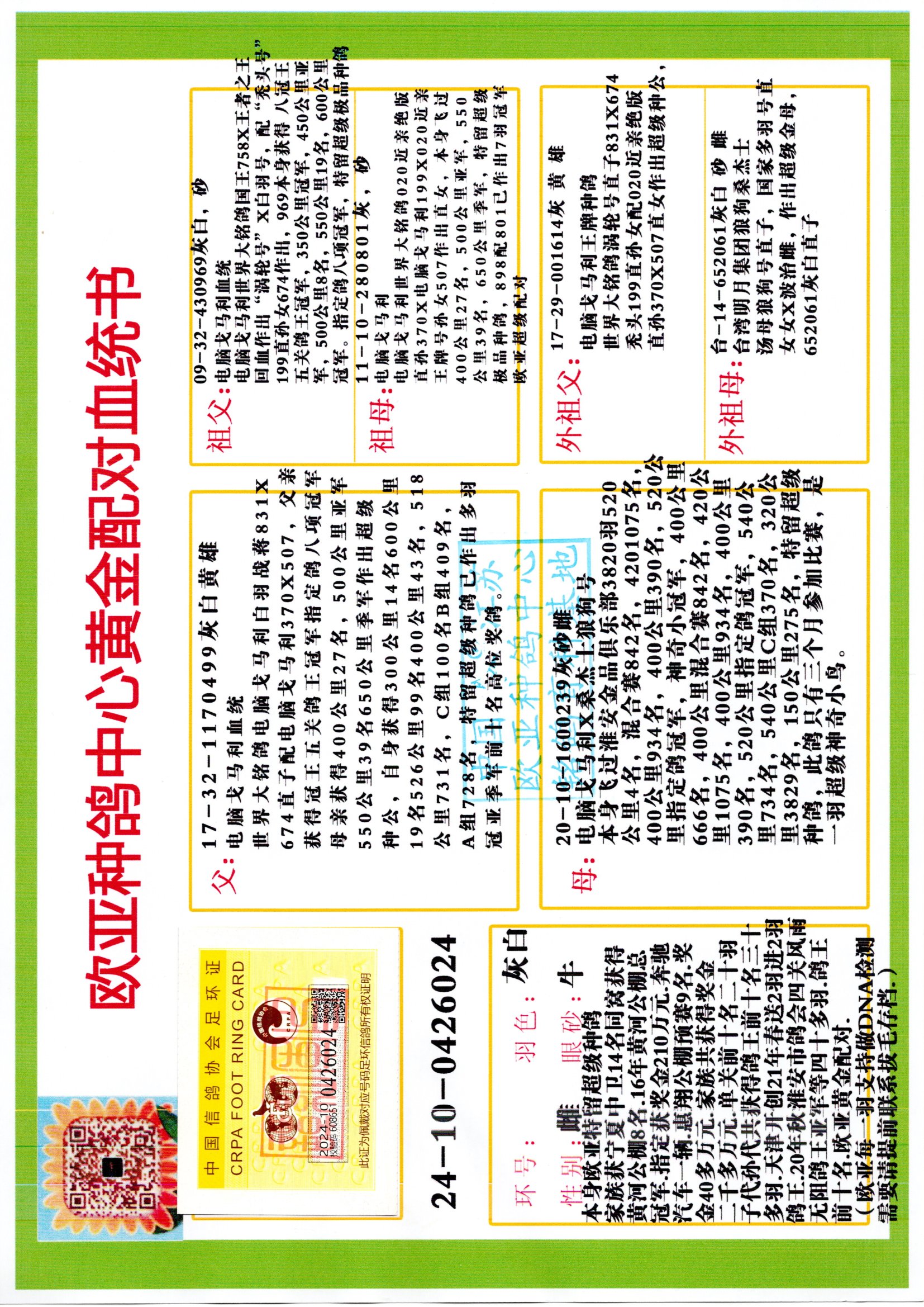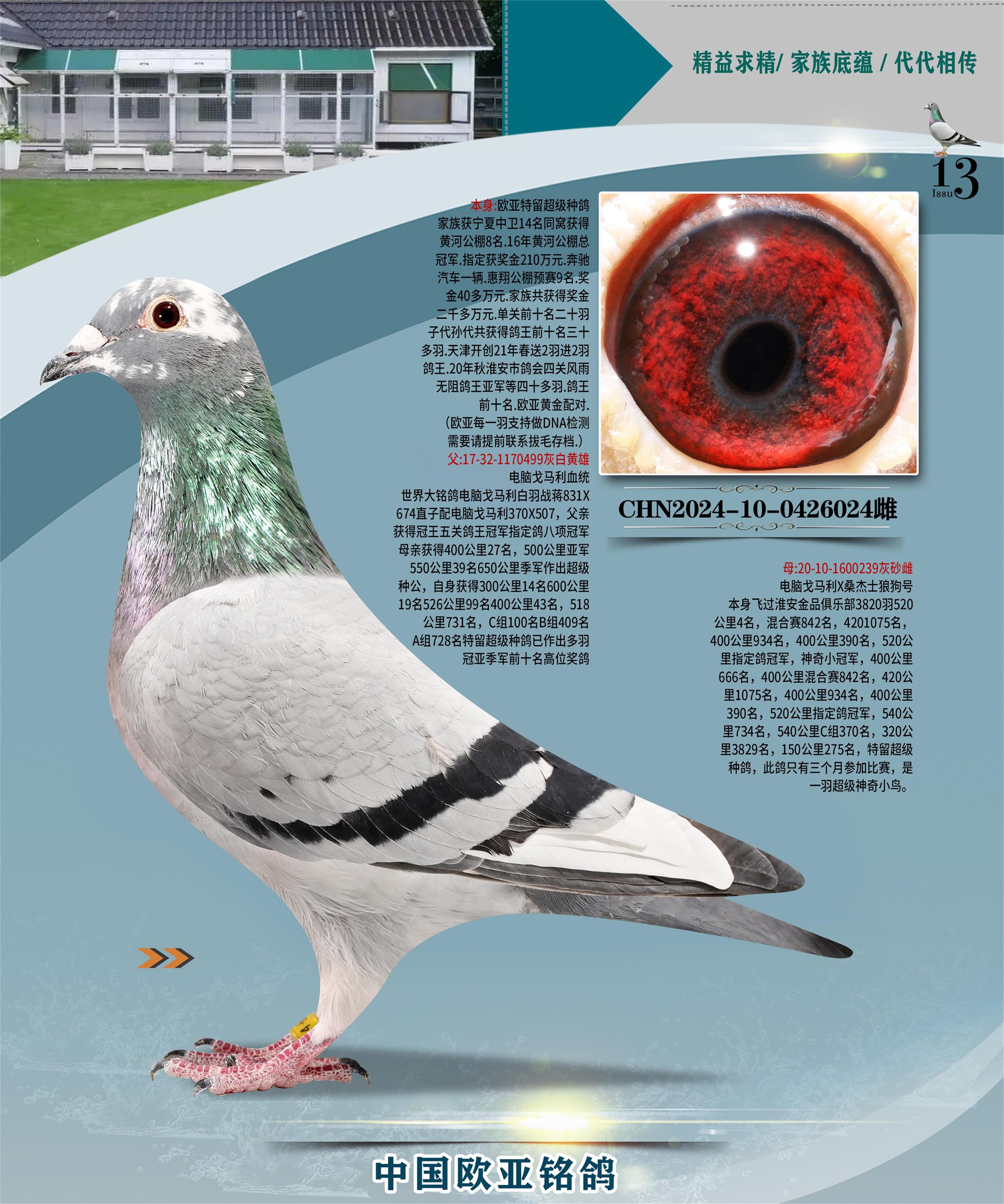 24年秋南京特比环欧亚荣获大团体冠军.小团体冠军551公里大特比13名.14名.16名.19名.20名.21名.24名.26名.27名.28名.42名.52名.54名.57名.65名.66名.68名.70名.71名.72名.74名.76名.80名.82名.83名.84名.85名.86名.90名.92名.110名.116名.121名.122名.128名.131名.158名.161名.164名.165名.166名.172名.174名.177名.182名.195名.196名.201名.205名.208名.210名.216名.253名.269名.275名.276名.294名.296名.299名,,24年秋云南天南铜都公棚决赛415名.天南铜都小棚决赛409名.云南玉活公棚决赛102名.490名.团体32名上笼二羽进二羽,天南铜都大棚506公里决赛445名。热烈祝贺河北省巨鹿县李兰生老师用欧亚泰山号血系连续十一年夺冠军,河北省国家赛冠军.全国季军等多次前十名高位,扬州王军王总用欧亚利奥24年春季获山东翔宇公棚决赛33名盖比53名。南京刘正龙刘总用欧亚盖比获得24年秋山东潍坊国际公棚决赛42名.精英赛30名.三关鸽王71名.决赛86名.加站赛16名.南京市特比环A组鸽王9名.B组鸽王5名.6名.C组鸽王5名.精英赛冠军4名.技能赛A组冠军4名.5名.秦淮区特比环荣获15名.46名.48名.87名。四川西昌徐亮徐总用欧亚利奥获得凉山州聚友决赛177名.第二关亚军双关鸽王19名.三关鸽王105名.云南豪庭公棚决赛603名。热烈祝贺24年四川重庆翔园鸽舍用欧亚泰山号荣获春季400公里冠军.秋季500公里冠军,河北王总用詹森X利奥获得千羽千翔公棚400公里冠军,广东蔡楷焕荣获24年秋爱好者 赛鸽俱乐部三关鸽王季军.一关420公里99名.二关450公里11名.三关520公里32名.单关季军.7名.12名,江西李卫兴荣获贵州红枫公棚8名.共翔俱乐部寄养棚四关综合鸽王30名.一关400公里78名.二关500公里55名.三关520公里37名.四关500公里57名.同父母获公棚18名.雷鸣获得武汉黄浦育翔中心冠军,四川陈文获得四川明鸿俱乐部300公里梦幻2名.3名.4名.9名.10名.13名.14名.15名.31名.34名.40名.41名.42名.43名.69名.71名.72名.73名.74名.94名.95名.97名.98名.99名.419公里决赛荣获总冠军7名.总共归巢9羽,四川徐亮获豪庭决赛603名,山西郑勇获得山西泰鑫公棚决赛255名詹森红狐,热烈祝贺马总获得开尔(飞跃队)决赛9名获奖金1310000万元.第一关52名,天津津福资赛180公里96名.获奖金429543万元,欧亚支持全国鸽友24年秋多人报喜 祝大家取得更好成绩,给欧亚报喜鸽友欧亚决定给每人赠送一羽超级种鸽。欧亚俱乐部特比环多关鸽王成绩:15年秋淮安特比环黑色星期一全会上笼9700多羽,当天无鸽归巢,第二天全会归巢357羽,本舍归巢158羽.前十名八羽.前一百名归巢57羽,16年春季获五关鸽王总冠军,总亚军四名.六名.七名.九名.十名.晶艺俱乐部520公里冠亚季军5名.6名.7名.9名.11名等,火车头冠军.季军6名.8名.9名.10名,16年秋晶艺俱乐部特比环520公里亚军.季军4名.6名.7名.9名,15年春南京白下特比环冠军.亚军.季军6名.7名.8名.9名.10名.指定鸽A B组获得冠军.亚军.季军4名.5名.,17年淮安特比环亚军.4名.5名.7名.8名.10名.六关鸽王总冠军.4名.6名.9名.10名,寄养棚宿迁刘总20羽特比环获冠军.季军.4名.7名.8名.9名等。18年荣获万羽特比环六关鸽王总冠军.总亚军.总季军.6名.8名.十名.单关四羽冠军.二羽亚军.四羽季军.前十名27羽。19年秋万羽特比环六关鸽王总亚军.总季军.5名.8名等,单关二羽冠军.三羽亚军.一羽季军前十名31羽。20年秋淮安市鸽会四关特比环大赛风雨无阻鸽王亚军.鸽王六名,金品俱乐部万羽特比环六关鸽王总冠军,总亚军.四名.五名.六名.七名.八名.十名.前二百名鸽王35羽,单关冠亚季军前十名四十多羽,火车头五关鸽王季军.六名.八名.前二百名鸽王十七羽。20年春荣获淮安五区一市四关鸽王总冠军.亚军.四名.八名.九名。21年秋荣获金品万羽特比环大赛六关鸽王总亚军.总季军.四名.七名.九名.十名.单关冠亚军季军前十名三十多羽。火车头协会鸽王六名.七名.十名.单关前十名十七羽。22年秋荣获鸽王总冠军.总亚军.5名.7名.8名.9名.11名.单关冠亚季军前十名三十多羽,第一关单关前二百名四十多羽,第二关前二百名三十多羽,第三关前二百名四十多羽,第四关前二百名四十多羽,第五关前一百名53羽。23年秋荣获鸽王季军.五名.八名.十名.13名.17名.20名.27名等多羽鸽王.单关前十名二十多羽。公棚.寄养棚部分成绩:16年秋宁夏黄河公棚总冠军电脑戈马力指定通炮冠军,17年送八羽参赛获得鸽王八名进奖四名,支持韩总荣获八名。支持鸽友荣获宁夏中卫公棚决赛总冠军.精英赛冠军,支持18年宁夏黄河公棚决赛冠军詹森X泰山。安徽鼎博寄养棚院内外四关鸽王总冠军.鸽王十七名.三十七名同窝,鸽王39名.42名.58名.67名。18年山东公棚预赛冠军.决赛65名.送八羽进奖五羽.指定获奔驰汽车一辆。支持鸽友获得云南蓝云公棚冠军.盖比X佛卡门。支持鸽友荣获云南银集公棚决赛冠军 詹森427X520血系 速度赛6700羽冠军。17年荣获金马俱乐部寄养棚四关鸽王总冠军.季军.六名.八名.第一关冠军.亚军.季军四名.七名.十一名.金牌教练奖。支持鸽友18年北京费翔公棚预赛九名电脑X桑杰士,支持鸽友荣获陕西威力公棚决赛11名.内蒙古临河寄养棚四关鸽王六名.詹森配泰山,支持河北王总用欧亚詹森427配胡本喜获20年秋开尔青年棚季军。云南东荣公棚16年预赛冠军.决赛77名.17年决赛12名.詹森红狐X泰山,17年平安公棚决赛4名 詹森427。欧亚获得21年金母寄养棚第一关四名.第二关5名.第三关5名.6名.7名.10名.三关鸽王总冠军,四关鸽王14名.十羽鸽王。支持河