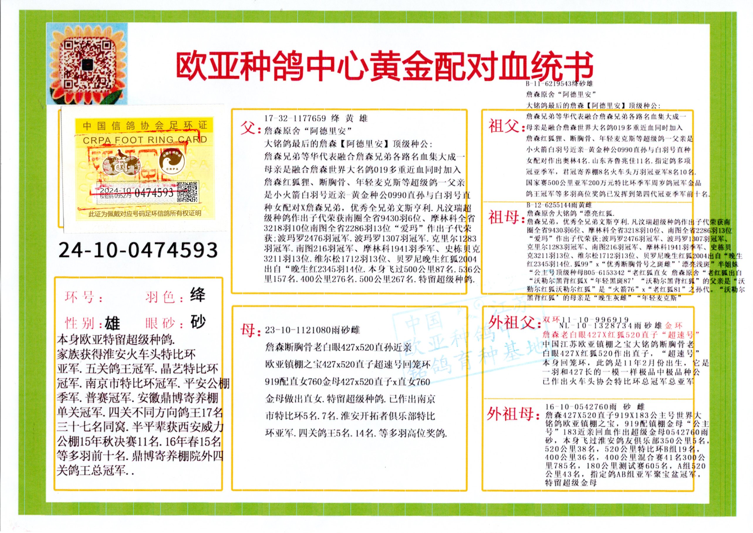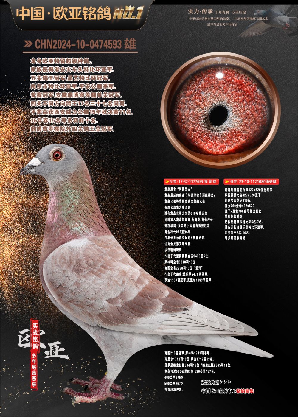 24年秋南京特比环欧亚荣获大团体冠军.小团体冠军551公里大特比13名.14名.16名.19名.20名.21名.24名.26名.27名.28名.42名.52名.54名.57名.65名.66名.68名.70名.71名.72名.74名.76名.80名.82名.83名.84名.85名.86名.90名.92名.110名.116名.121名.122名.128名.131名.158名.161名.164名.165名.166名.172名.174名.177名.182名.195名.196名.201名.205名.208名.210名.216名.253名.269名.275名.276名.294名.296名.299名,,24年秋云南天南铜都公棚决赛415名.天南铜都小棚决赛409名.云南玉活公棚决赛102名.490名.团体32名上笼二羽进二羽,天南铜都大棚506公里决赛445名。热烈祝贺河北省巨鹿县李兰生老师用欧亚泰山号血系连续十一年夺冠军,河北省国家赛冠军.全国季军等多次前十名高位,扬州王军王总用欧亚利奥24年春季获山东翔宇公棚决赛33名盖比53名。南京刘正龙刘总用欧亚盖比获得24年秋山东潍坊国际公棚决赛42名.精英赛30名.三关鸽王71名.决赛86名.加站赛16名.南京市特比环A组鸽王9名.B组鸽王5名.6名.C组鸽王5名.精英赛冠军4名.技能赛A组冠军4名.5名.秦淮区特比环荣获15名.46名.48名.87名。四川西昌徐亮徐总用欧亚利奥获得凉山州聚友决赛177名.第二关亚军双关鸽王19名.三关鸽王105名.云南豪庭公棚决赛603名。热烈祝贺24年四川重庆翔园鸽舍用欧亚泰山号荣获春季400公里冠军.秋季500公里冠军,河北王总用詹森X利奥获得千羽千翔公棚400公里冠军,广东蔡楷焕荣获24年秋爱好者 赛鸽俱乐部三关鸽王季军.一关420公里99名.二关450公里11名.三关520公里32名.单关季军.7名.12名,江西李卫兴荣获贵州红枫公棚8名.共翔俱乐部寄养棚四关综合鸽王30名.一关400公里78名.二关500公里55名.三关520公里37名.四关500公里57名.同父母获公棚18名.雷鸣获得武汉黄浦育翔中心冠军,四川陈文获得四川明鸿俱乐部300公里梦幻2名.3名.4名.9名.10名.13名.14名.15名.31名.34名.40名.41名.42名.43名.69名.71名.72名.73名.74名.94名.95名.97名.98名.99名.419公里决赛荣获总冠军7名.总共归巢9羽,四川徐亮获豪庭决赛603名,山西郑勇获得山西泰鑫公棚决赛255名詹森红狐,热烈祝贺马总获得开尔(飞跃队)决赛9名获奖金1310000万元.第一关52名,天津津福资赛180公里96名.获奖金429543万元,欧亚支持全国鸽友24年秋多人报喜 祝大家取得更好成绩,给欧亚报喜鸽友欧亚决定给每人赠送一羽超级种鸽。欧亚俱乐部特比环多关鸽王成绩:15年秋淮安特比环黑色星期一全会上笼9700多羽,当天无鸽归巢,第二天全会归巢357羽,本舍归巢158羽.前十名八羽.前一百名归巢57羽,16年春季获五关鸽王总冠军,总亚军四名.六名.七名.九名.十名.晶艺俱乐部520公里冠亚季军5名.6名.7名.9名.11名等,火车头冠军.季军6名.8名.9名.10名,16年秋晶艺俱乐部特比环520公里亚军.季军4名.6名.7名.9名,15年春南京白下特比环冠军.亚军.季军6名.7名.8名.9名.10名.指定鸽A B组获得冠军.亚军.季军4名.5名.,17年淮安特比环亚军.4名.5名.7名.8名.10名.六关鸽王总冠军.4名.6名.9名.10名,寄养棚宿迁刘总20羽特比环获冠军.季军.4名.7名.8名.9名等。18年荣获万羽特比环六关鸽王总冠军.总亚军.总季军.6名.8名.十名.单关四羽冠军.二羽亚军.四羽季军.前十名27羽。19年秋万羽特比环六关鸽王总亚军.总季军.5名.8名等,单关二羽冠军.三羽亚军.一羽季军前十名31羽。20年秋淮安市鸽会四关特比环大赛风雨无阻鸽王亚军.鸽王六名,金品俱乐部万羽特比环六关鸽王总冠军,总亚军.四名.五名.六名.七名.八名.十名.前二百名鸽王35羽,单关冠亚季军前十名四十多羽,火车头五关鸽王季军.六名.八名.前二百名鸽王十七羽。20年春荣获淮安五区一市四关鸽王总冠军.亚军.四名.八名.九名。21年秋荣获金品万羽特比环大赛六关鸽王总亚军.总季军.四名.七名.九名.十名.单关冠亚军季军前十名三十多羽。火车头协会鸽王六名.七名.十名.单关前十名十七羽。22年秋荣获鸽王总冠军.总亚军.5名.7名.8名.9名.11名.单关冠亚季军前十名三十多羽,第一关单关前二百名四十多羽,第二关前二百名三十多羽,第三关前二百名四十多羽,第四关前二百名四十多羽,第五关前一百名53羽。23年秋荣获鸽王季军.五名.八名.十名.13名.17名.20名.27名等多羽鸽王.单关前十名二十多羽。公棚.寄养棚部分成绩:16年秋宁夏黄河公棚总冠军电脑戈马力指定通炮冠军,17年送八羽参赛获得鸽王八名进奖四名,支持韩总荣获八名。支持鸽友荣获宁夏中卫公棚决赛总冠军.精英赛冠军,支持18年宁夏黄河公棚决赛冠军詹森X泰山。安徽鼎博寄养棚院内外四关鸽王总冠军.鸽王十七名.三十七名同窝,鸽王39名.42名.58名.67名。18年山东公棚预赛冠军.决赛65名.送八羽进奖五羽.指定获奔驰汽车一辆。支持鸽友获得云南蓝云公棚冠军.盖比X佛卡门。支持鸽友荣获云南银集公棚决赛冠军 詹森427X520血系 速度赛6700羽冠军。17年荣获金马俱乐部寄养棚四关鸽王总冠军.季军.六名.八名.第一关冠军.亚军.季军四名.七名.十一名.金牌教练奖。支持鸽友18年北京费翔公棚预赛九名电脑X桑杰士,支持鸽友荣获陕西威力公棚决赛11名.内蒙古临河寄养棚四关鸽王六名.詹森配泰山,支持河北王总用欧亚詹森427配胡本喜获20年秋开尔青年棚季军。云南东荣公棚16年预赛冠军.决赛77名.17年决赛12名.詹森红狐X泰山,17年平安公棚决赛4名 詹森427。欧亚获得21年金母寄养棚第一关四名.第二关5名.第三关5名.6名.7名.10名.三关鸽王总冠军,四关鸽王14名.十羽鸽王。支持河