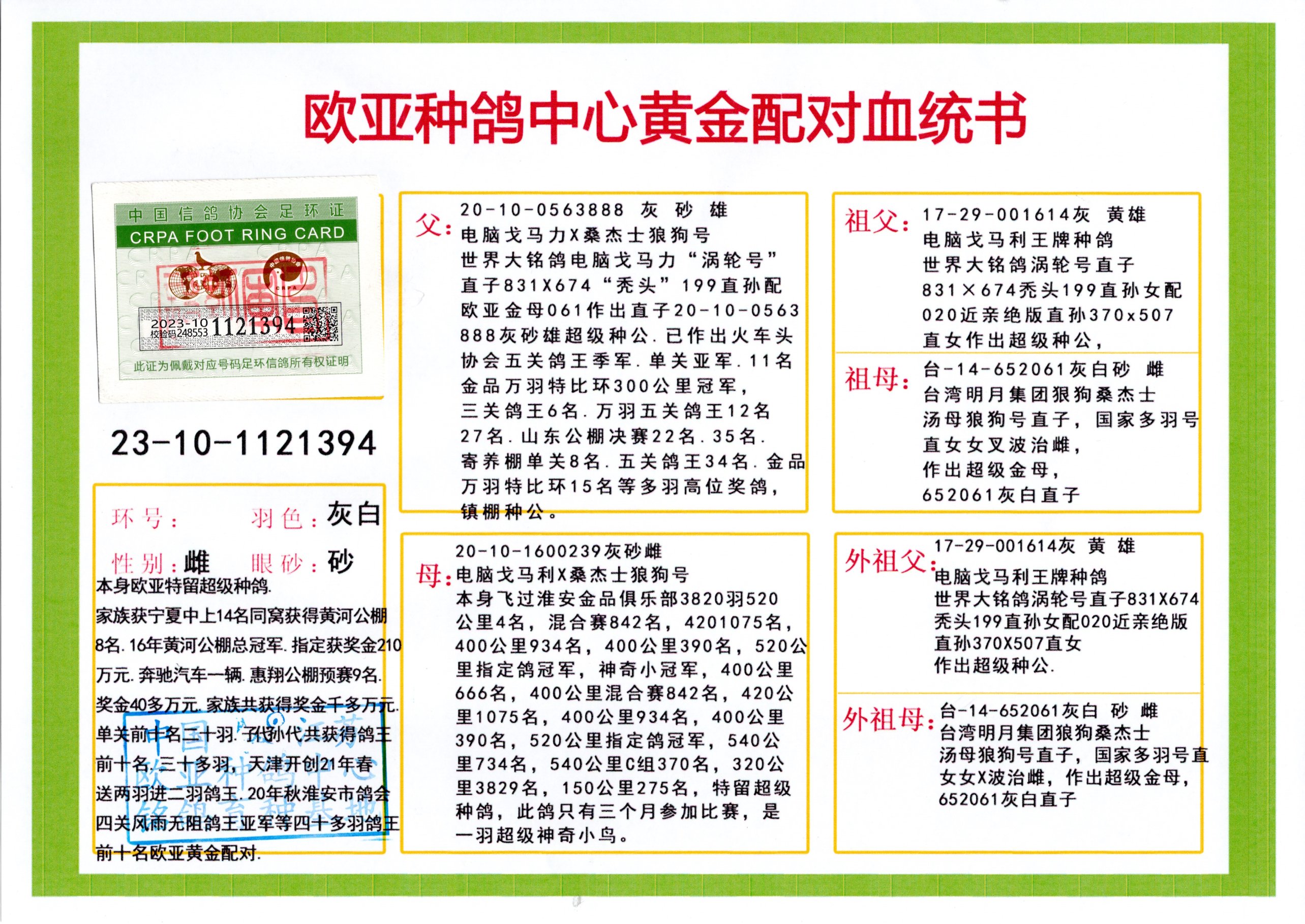24年秋南京特比环欧亚荣获大团体冠军.小团体冠军551公里大特比13名.14名.16名.19名.20名.21名.24名.26名.27名.28名.42名.52名.54名.57名.65名.66名.68名.70名.71名.72名.74名.76名.80名.82名.83名.84名.85名.86名.90名.92名.110名.116名.121名.122名.128名.131名.158名.161名.164名.165名.166名.172名.174名.177名.182名.195名.196名.201名.205名.208名.210名.216名.253名.269名.275名.276名.294名.296名.299名,,24年秋云南天南铜都公棚决赛415名.天南铜都小棚决赛409名.云南玉活公棚决赛102名.490名.团体32名上笼二羽进二羽,天南铜都大棚506公里决赛445名。热烈祝贺河北省巨鹿县李兰生老师用欧亚泰山号血系连续十一年夺冠军,河北省国家赛冠军.全国季军等多次前十名高位,扬州王军王总用欧亚利奥24年春季获山东翔宇公棚决赛33名盖比53名。南京刘正龙刘总用欧亚盖比获得24年秋山东潍坊国际公棚决赛42名.精英赛30名.三关鸽王71名.决赛86名.加站赛16名.南京市特比环A组鸽王9名.B组鸽王5名.6名.C组鸽王5名.精英赛冠军4名.技能赛A组冠军4名.5名.秦淮区特比环荣获15名.46名.48名.87名。四川西昌徐亮徐总用欧亚利奥获得凉山州聚友决赛177名.第二关亚军双关鸽王19名.三关鸽王105名.云南豪庭公棚决赛603名。热烈祝贺24年四川重庆翔园鸽舍用欧亚泰山号荣获春季400公里冠军.秋季500公里冠军,河北王总用詹森X利奥获得千羽千翔公棚400公里冠军,广东蔡楷焕荣获24年秋爱好者 赛鸽俱乐部三关鸽王季军.一关420公里99名.二关450公里11名.三关520公里32名.单关季军.7名.12名,江西李卫兴荣获贵州红枫公棚8名.共翔俱乐部寄养棚四关综合鸽王30名.一关400公里78名.二关500公里55名.三关520公里37名.四关500公里57名.同父母获公棚18名.雷鸣获得武汉黄浦育翔中心冠军,四川陈文获得四川明鸿俱乐部300公里梦幻2名.3名.4名.9名.10名.13名.14名.15名.31名.34名.40名.41名.42名.43名.69名.71名.72名.73名.74名.94名.95名.97名.98名.99名.419公里决赛荣获总冠军7名.总共归巢9羽,四川徐亮获豪庭决赛603名,山西郑勇获得山西泰鑫公棚决赛255名詹森红狐,热烈祝贺马总获得开尔(飞跃队)决赛9名获奖金1310000万元.第一关52名,天津津福资赛180公里96名.获奖金429543万元,欧亚支持全国鸽友24年秋多人报喜 祝大家取得更好成绩,给欧亚报喜鸽友欧亚决定给每人赠送一羽超级种鸽。欧亚俱乐部特比环多关鸽王成绩:15年秋淮安特比环黑色星期一全会上笼9700多羽,当天无鸽归巢,第二天全会归巢357羽,本舍归巢158羽.前十名八羽.前一百名归巢57羽,16年春季获五关鸽王总冠军,总亚军四名.六名.七名.九名.十名.晶艺俱乐部520公里冠亚季军5名.6名.7名.9名.11名等,火车头冠军.季军6名.8名.9名.10名,16年秋晶艺俱乐部特比环520公里亚军.季军4名.6名.7名.9名,15年春南京白下特比环冠军.亚军.季军6名.7名.8名.9名.10名.指定鸽A B组获得冠军.亚军.季军4名.5名.,17年淮安特比环亚军.4名.5名.7名.8名.10名.六关鸽王总冠军.4名.6名.9名.10名,寄养棚宿迁刘总20羽特比环获冠军.季军.4名.7名.8名.9名等。18年荣获万羽特比环六关鸽王总冠军.总亚军.总季军.6名.8名.十名.单关四羽冠军.二羽亚军.四羽季军.前十名27羽。19年秋万羽特比环六关鸽王总亚军.总季军.5名.8名等,单关二羽冠军.三羽亚军.一羽季军前十名31羽。20年秋淮安市鸽会四关特比环大赛风雨无阻鸽王亚军.鸽王六名,金品俱乐部万羽特比环六关鸽王总冠军,总亚军.四名.五名.六名.七名.八名.十名.前二百名鸽王35羽,单关冠亚季军前十名四十多羽,火车头五关鸽王季军.六名.八名.前二百名鸽王十七羽。20年春荣获淮安五区一市四关鸽王总冠军.亚军.四名.八名.九名。21年秋荣获金品万羽特比环大赛六关鸽王总亚军.总季军.四名.七名.九名.十名.单关冠亚军季军前十名三十多羽。火车头协会鸽王六名.七名.十名.单关前十名十七羽。22年秋荣获鸽王总冠军.总亚军.5名.7名.8名.9名.11名.单关冠亚季军前十名三十多羽,第一关单关前二百名四十多羽,第二关前二百名三十多羽,第三关前二百名四十多羽,第四关前二百名四十多羽,第五关前一百名53羽。23年秋荣获鸽王季军.五名.八名.十名.13名.17名.20名.27名等多羽鸽王.单关前十名二十多羽。公棚.寄养棚部分成绩:16年秋宁夏黄河公棚总冠军电脑戈马力指定通炮冠军,17年送八羽参赛获得鸽王八名进奖四名,支持韩总荣获八名。支持鸽友荣获宁夏中卫公棚决赛总冠军.精英赛冠军,支持18年宁夏黄河公棚决赛冠军詹森X泰山。安徽鼎博寄养棚院内外四关鸽王总冠军.鸽王十七名.三十七名同窝,鸽王39名.42名.58名.67名。18年山东公棚预赛冠军.决赛65名.送八羽进奖五羽.指定获奔驰汽车一辆。支持鸽友获得云南蓝云公棚冠军.盖比X佛卡门。支持鸽友荣获云南银集公棚决赛冠军 詹森427X520血系 速度赛6700羽冠军。17年荣获金马俱乐部寄养棚四关鸽王总冠军.季军.六名.八名.第一关冠军.亚军.季军四名.七名.十一名.金牌教练奖。支持鸽友18年北京费翔公棚预赛九名电脑X桑杰士,支持鸽友荣获陕西威力公棚决赛11名.内蒙古临河寄养棚四关鸽王六名.詹森配泰山,支持河北王总用欧亚詹森427配胡本喜获20年秋开尔青年棚季军。云南东荣公棚16年预赛冠军.决赛77名.17年决赛12名.詹森红狐X泰山,17年平安公棚决赛4名 詹森427。欧亚获得21年金母寄养棚第一关四名.第二关5名.第三关5名.6名.7名.10名.三关鸽王总冠军,四关鸽王14名.十羽鸽王。支持河