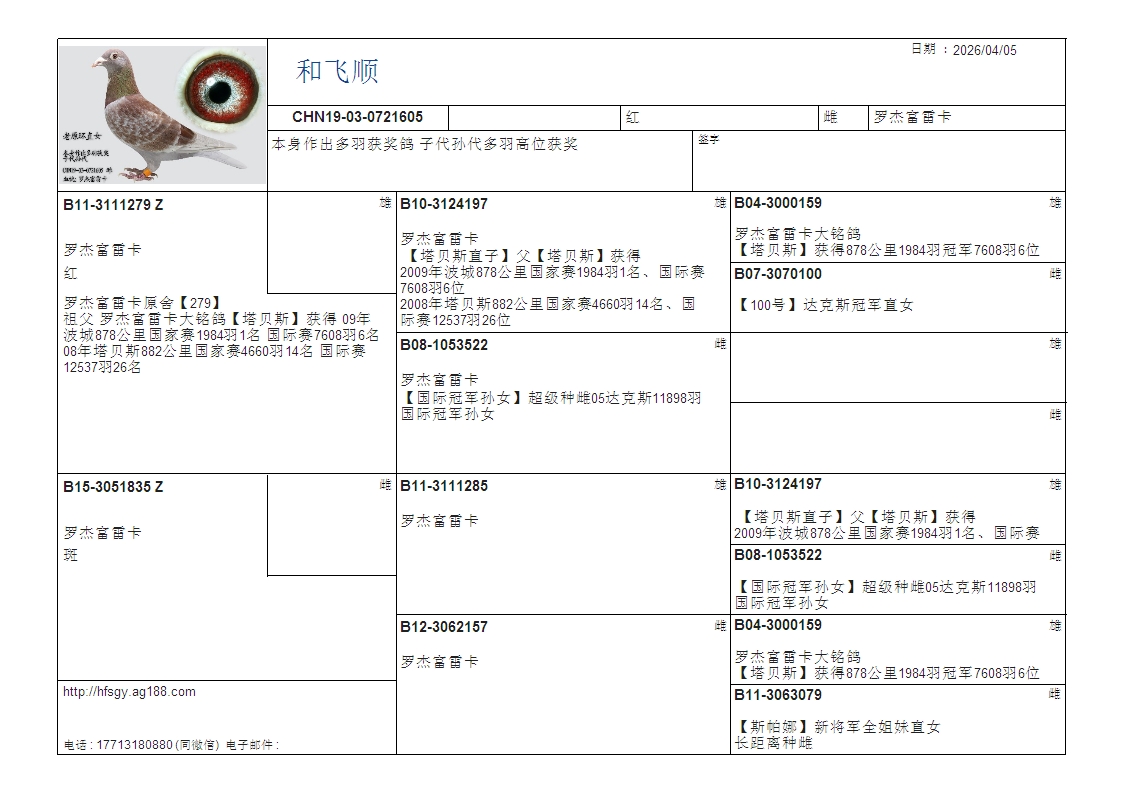 - 当前查看拍卖鸽:罗杰富雷卡 长距离恶略赛事 种雌