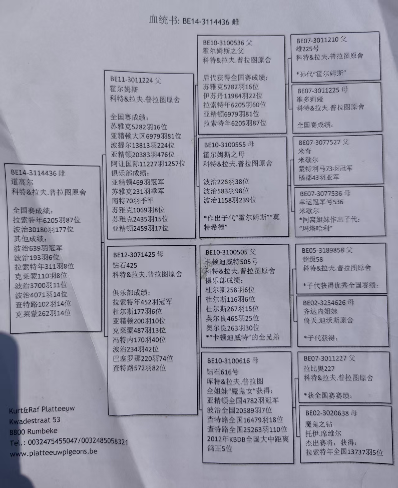 B14-3114436 雌【注;此鸽当年PIPA 15万余元引进 25年正常作育血统书齐全!!!】