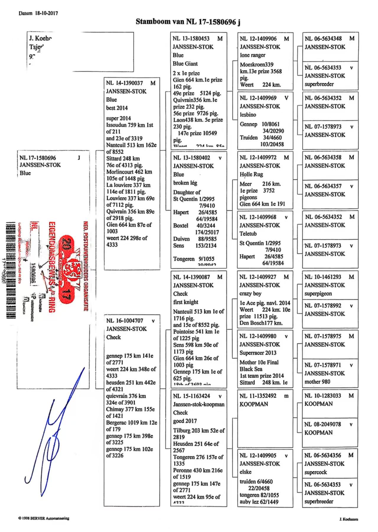 本身获:伊苏丹759公里211羽冠军/3319羽23名吉恩664公里1003羽87名