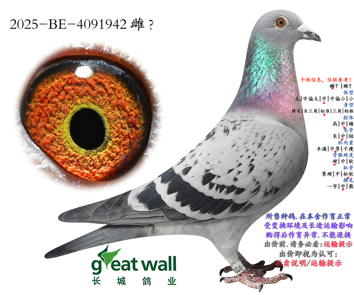 因拍卖鸽均是未做育过的种鸽或幼鸽,图内所标雌雄仅供参考,实际性别已实物为准。不做退换理由。
