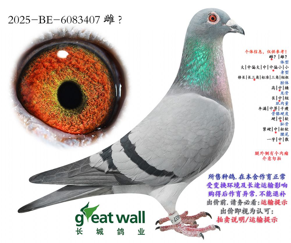 因拍卖鸽均是未做育过的种鸽或幼鸽,图内所标雌雄仅供参考,实际性别已实物为准。不做退换理由。
