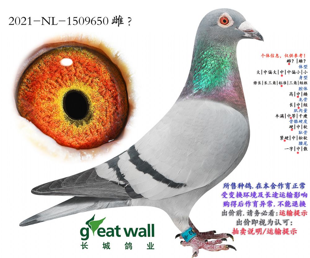 因拍卖鸽均是未做育过的种鸽或幼鸽,图内所标雌雄仅供参考,实际性别已实物为准。不做退换理由。