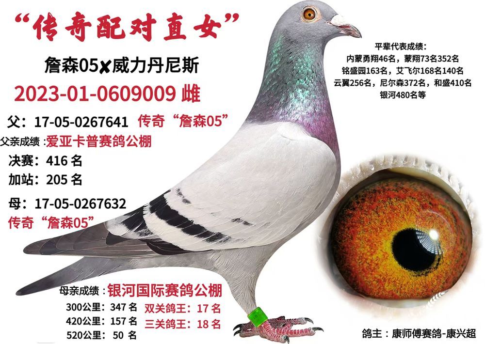 母:17-05-0267632 传奇“詹森05” 自身银河国际赛鸽公棚300公里347名,420公里157名,520公里50名,双关鸽王17名,三关鸽王18名;