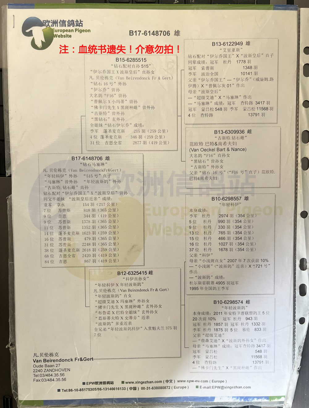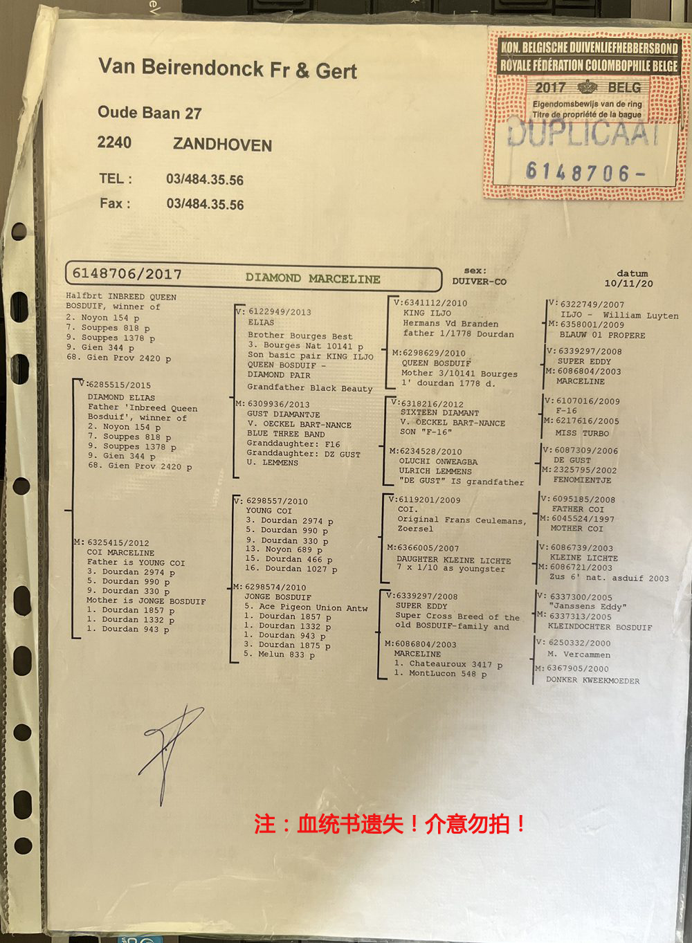 母:B12-6325415 “科伊直孙女” “年轻科伊X年轻波斯鸽” 凡.贝伦栋克;