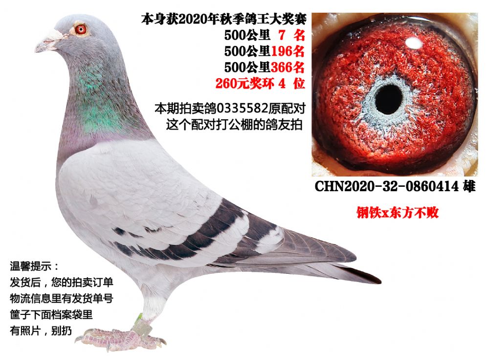 - 当前查看拍卖鸽:原配对雄鸽,500公里7名,奖环鸽王4位