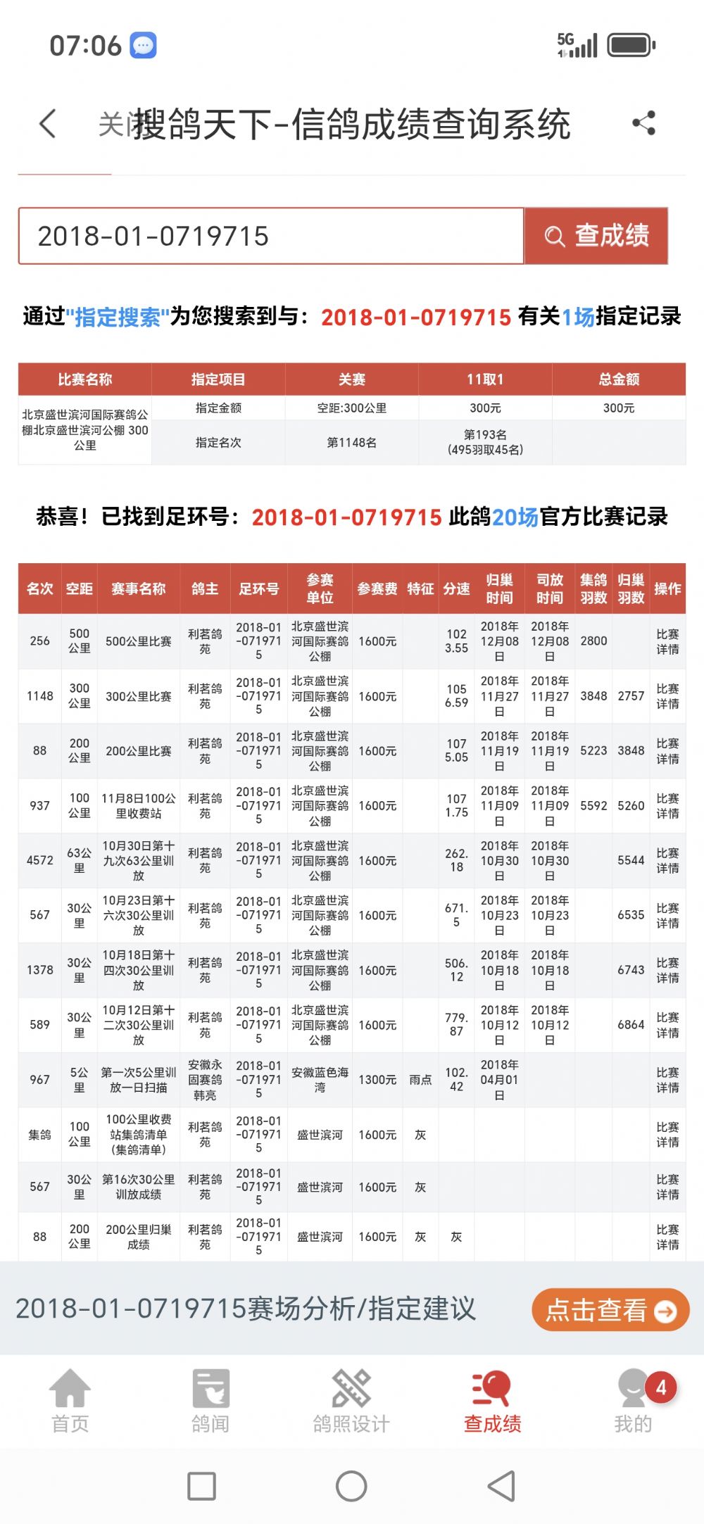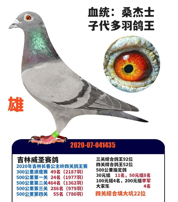2020年吉林长春公主岭四关鸽王赛300公里速度赛49名(2187羽) 500公里第一关24名(1977羽) 500公里第二关464名(1362羽) 500公里第三关286名(979羽) 500公里第四关55名(780羽)