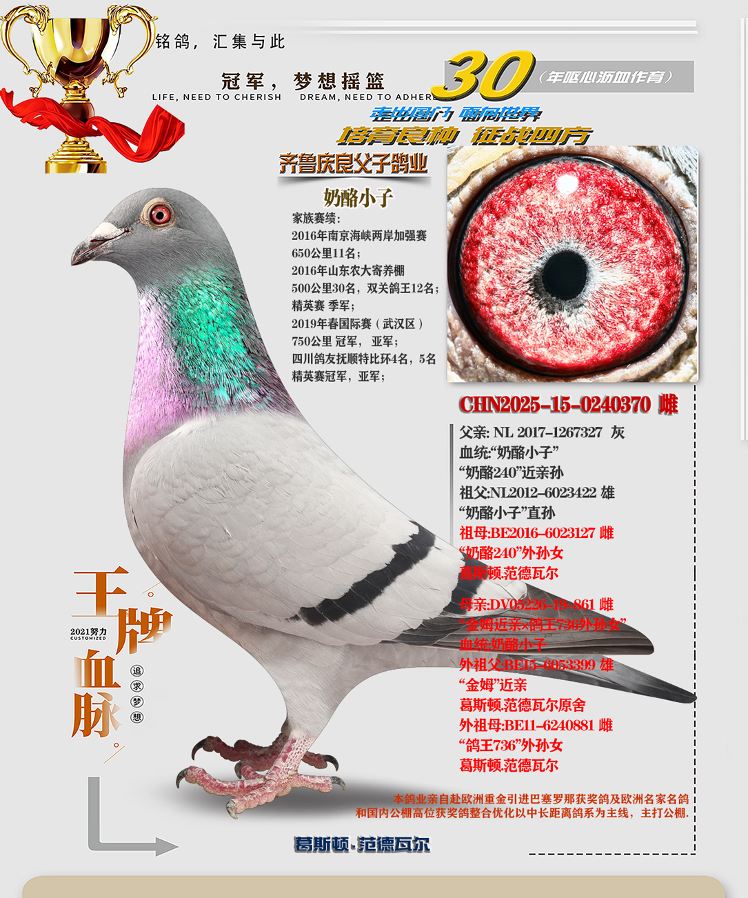 刘总你好!给报喜,我引进你的2016-32-0014055灰雄盖比闪电号近亲。它的直子2020-01-0840803灰。在2020年秋北京国信达公棚获得300公里冠军,500公里20名,双关鸽王,三关鸽王!通指。感谢您的支持!感谢您的优秀种鸽。