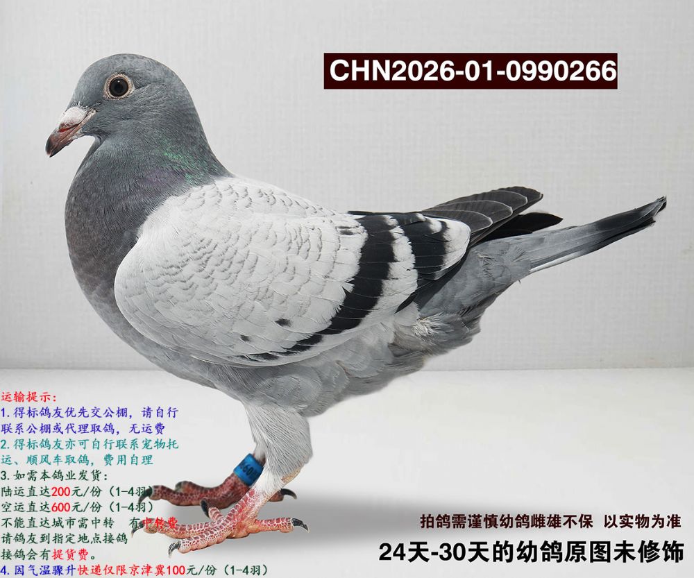 所有拍卖赛鸽均为幼鸽,如经过长途运输、变换鸽舍及周边环境;如出现健康问题:收到鸽子请录视频为证,收到鸽子3日内联系,逾期不做保证;成年后做育问题,我们不做保证。