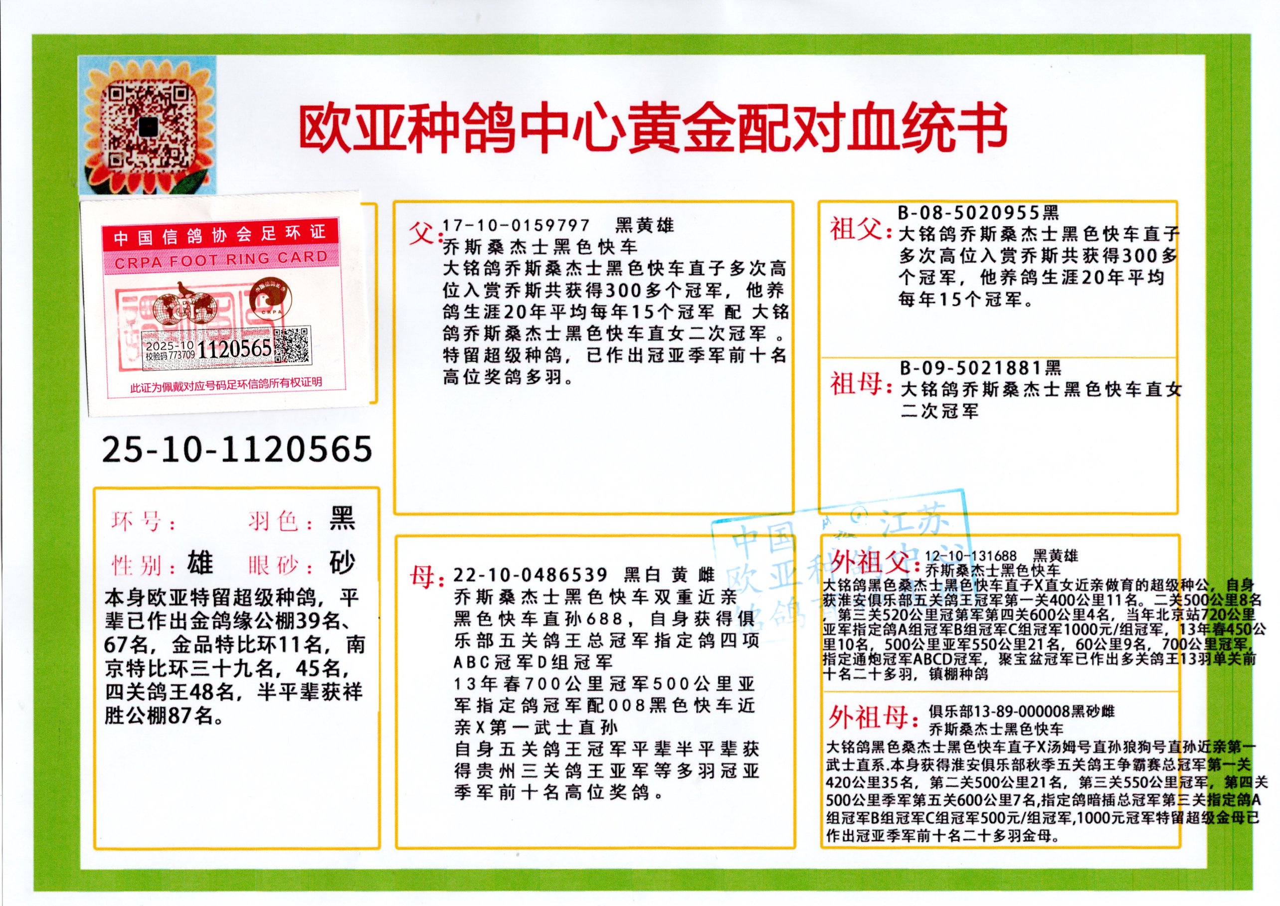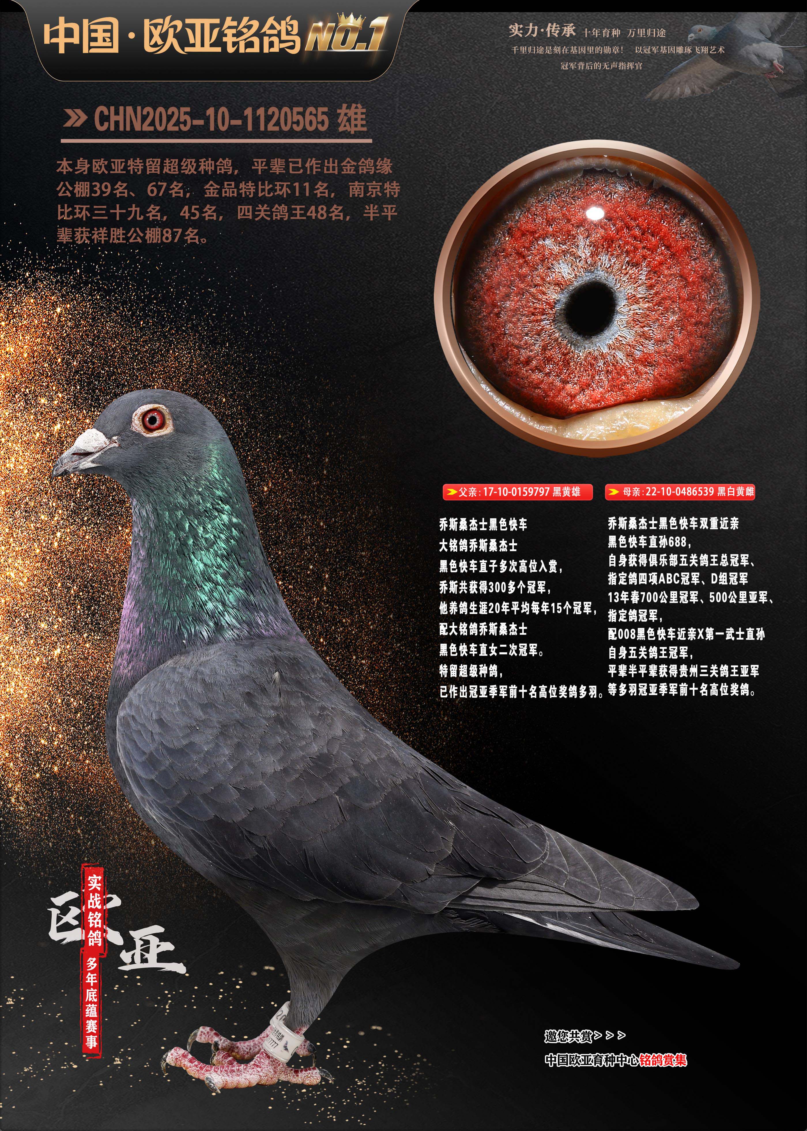 24年秋南京特比环欧亚荣获大团体冠军.小团体冠军551公里大特比13名.14名.16名.19名.20名.21名.24名.26名.27名.28名.42名.52名.54名.57名.65名.66名.68名.70名.71名.72名.74名.76名.80名.82名.83名.84名.85名.86名.90名.92名.110名.116名.121名.122名.128名.131名.158名.161名.164名.165名.166名.172名.174名.177名.182名.195名.196名.201名.205名.208名.210名.216名.253名.269名.275名.276名.294名.296名.299名,,24年秋云南天南铜都公棚决赛415名.天南铜都小棚决赛409名.云南玉活公棚决赛102名.490名.团体32名上笼二羽进二羽,天南铜都大棚506公里决赛445名。热烈祝贺河北省巨鹿县李兰生老师用欧亚泰山号血系连续十一年夺冠军,河北省国家赛冠军.全国季军等多次前十名高位,扬州王军王总用欧亚利奥24年春季获山东翔宇公棚决赛33名盖比53名。南京刘正龙刘总用欧亚盖比获得24年秋山东潍坊国际公棚决赛42名.精英赛30名.三关鸽王71名.决赛86名.加站赛16名.南京市特比环A组鸽王9名.B组鸽王5名.6名.C组鸽王5名.精英赛冠军4名.技能赛A组冠军4名.5名.秦淮区特比环荣获15名.46名.48名.87名。四川西昌徐亮徐总用欧亚利奥获得凉山州聚友决赛177名.第二关亚军双关鸽王19名.三关鸽王105名.云南豪庭公棚决赛603名。热烈祝贺24年四川重庆翔园鸽舍用欧亚泰山号荣获春季400公里冠军.秋季500公里冠军,河北王总用詹森X利奥获得千羽千翔公棚400公里冠军,广东蔡楷焕荣获24年秋爱好者 赛鸽俱乐部三关鸽王季军.一关420公里99名.二关450公里11名.三关520公里32名.单关季军.7名.12名,江西李卫兴荣获贵州红枫公棚8名.共翔俱乐部寄养棚四关综合鸽王30名.一关400公里78名.二关500公里55名.三关520公里37名.四关500公里57名.同父母获公棚18名.雷鸣获得武汉黄浦育翔中心冠军,四川陈文获得四川明鸿俱乐部300公里梦幻2名.3名.4名.9名.10名.13名.14名.15名.31名.34名.40名.41名.42名.43名.69名.71名.72名.73名.74名.94名.95名.97名.98名.99名.419公里决赛荣获总冠军7名.总共归巢9羽,四川徐亮获豪庭决赛603名,山西郑勇获得山西泰鑫公棚决赛255名詹森红狐,热烈祝贺马总获得开尔(飞跃队)决赛9名获奖金1310000万元.第一关52名,天津津福资赛180公里96名.获奖金429543万元,欧亚支持全国鸽友24年秋多人报喜 祝大家取得更好成绩,给欧亚报喜鸽友欧亚决定给每人赠送一羽超级种鸽。欧亚俱乐部特比环多关鸽王成绩:15年秋淮安特比环黑色星期一全会上笼9700多羽,当天无鸽归巢,第二天全会归巢357羽,本舍归巢158羽.前十名八羽.前一百名归巢57羽,16年春季获五关鸽王总冠军,总亚军四名.六名.七名.九名.十名.晶艺俱乐部520公里冠亚季军5名.6名.7名.9名.11名等,火车头冠军.季军6名.8名.9名.10名,16年秋晶艺俱乐部特比环520公里亚军.季军4名.6名.7名.9名,15年春南京白下特比环冠军.亚军.季军6名.7名.8名.9名.10名.指定鸽A B组获得冠军.亚军.季军4名.5名.,17年淮安特比环亚军.4名.5名.7名.8名.10名.六关鸽王总冠军.4名.6名.9名.10名,寄养棚宿迁刘总20羽特比环获冠军.季军.4名.7名.8名.9名等。18年荣获万羽特比环六关鸽王总冠军.总亚军.总季军.6名.8名.十名.单关四羽冠军.二羽亚军.四羽季军.前十名27羽。19年秋万羽特比环六关鸽王总亚军.总季军.5名.8名等,单关二羽冠军.三羽亚军.一羽季军前十名31羽。20年秋淮安市鸽会四关特比环大赛风雨无阻鸽王亚军.鸽王六名,金品俱乐部万羽特比环六关鸽王总冠军,总亚军.四名.五名.六名.七名.八名.十名.前二百名鸽王35羽,单关冠亚季军前十名四十多羽,火车头五关鸽王季军.六名.八名.前二百名鸽王十七羽。20年春荣获淮安五区一市四关鸽王总冠军.亚军.四名.八名.九名。21年秋荣获金品万羽特比环大赛六关鸽王总亚军.总季军.四名.七名.九名.十名.单关冠亚军季军前十名三十多羽。火车头协会鸽王六名.七名.十名.单关前十名十七羽。22年秋荣获鸽王总冠军.总亚军.5名.7名.8名.9名.11名.单关冠亚季军前十名三十多羽,第一关单关前二百名四十多羽,第二关前二百名三十多羽,第三关前二百名四十多羽,第四关前二百名四十多羽,第五关前一百名53羽。23年秋荣获鸽王季军.五名.八名.十名.13名.17名.20名.27名等多羽鸽王.单关前十名二十多羽。公棚.寄养棚部分成绩:16年秋宁夏黄河公棚总冠军电脑戈马力指定通炮冠军,17年送八羽参赛获得鸽王八名进奖四名,支持韩总荣获八名。支持鸽友荣获宁夏中卫公棚决赛总冠军.精英赛冠军,支持18年宁夏黄河公棚决赛冠军詹森X泰山。安徽鼎博寄养棚院内外四关鸽王总冠军.鸽王十七名.三十七名同窝,鸽王39名.42名.58名.67名。18年山东公棚预赛冠军.决赛65名.送八羽进奖五羽.指定获奔驰汽车一辆。支持鸽友获得云南蓝云公棚冠军.盖比X佛卡门。支持鸽友荣获云南银集公棚决赛冠军 詹森427X520血系 速度赛6700羽冠军。17年荣获金马俱乐部寄养棚四关鸽王总冠军.季军.六名.八名.第一关冠军.亚军.季军四名.七名.十一名.金牌教练奖。支持鸽友18年北京费翔公棚预赛九名电脑X桑杰士,支持鸽友荣获陕西威力公棚决赛11名.内蒙古临河寄养棚四关鸽王六名.詹森配泰山,支持河北王总用欧亚詹森427配胡本喜获20年秋开尔青年棚季军。云南东荣公棚16年预赛冠军.决赛77名.17年决赛12名.詹森红狐X泰山,17年平安公棚决赛4名 詹森427。欧亚获得21年金母寄养棚第一关四名.第二关5名.第三关5名.6名.7名.10名.三关鸽王总冠军,四关鸽王14名.十羽鸽王。支持河