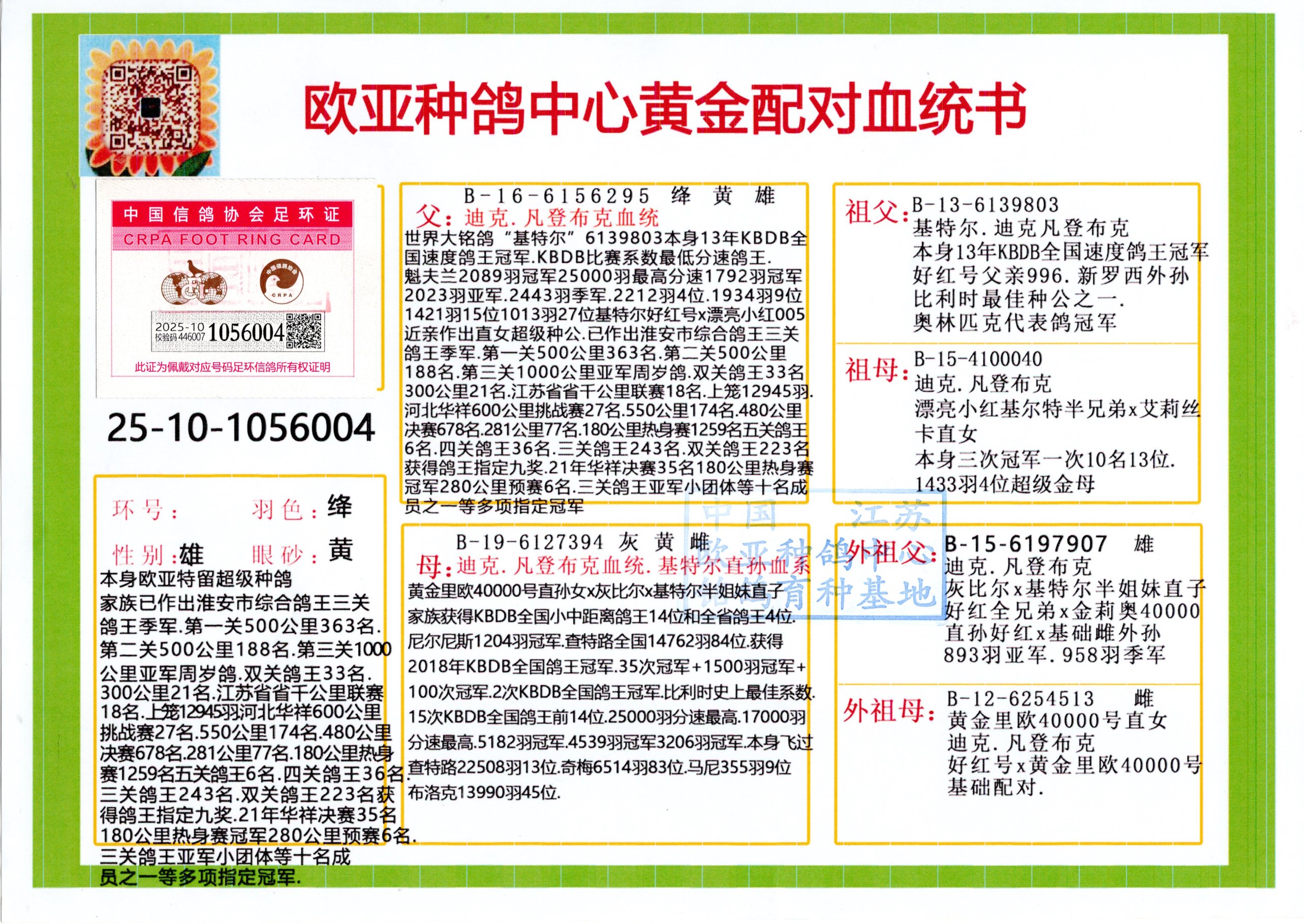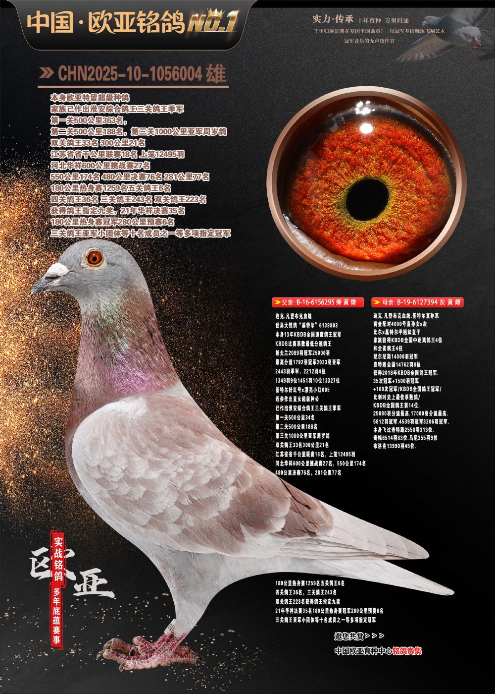 24年秋南京特比环欧亚荣获大团体冠军.小团体冠军551公里大特比13名.14名.16名.19名.20名.21名.24名.26名.27名.28名.42名.52名.54名.57名.65名.66名.68名.70名.71名.72名.74名.76名.80名.82名.83名.84名.85名.86名.90名.92名.110名.116名.121名.122名.128名.131名.158名.161名.164名.165名.166名.172名.174名.177名.182名.195名.196名.201名.205名.208名.210名.216名.253名.269名.275名.276名.294名.296名.299名,,24年秋云南天南铜都公棚决赛415名.天南铜都小棚决赛409名.云南玉活公棚决赛102名.490名.团体32名上笼二羽进二羽,天南铜都大棚506公里决赛445名。热烈祝贺河北省巨鹿县李兰生老师用欧亚泰山号血系连续十一年夺冠军,河北省国家赛冠军.全国季军等多次前十名高位,扬州王军王总用欧亚利奥24年春季获山东翔宇公棚决赛33名盖比53名。南京刘正龙刘总用欧亚盖比获得24年秋山东潍坊国际公棚决赛42名.精英赛30名.三关鸽王71名.决赛86名.加站赛16名.南京市特比环A组鸽王9名.B组鸽王5名.6名.C组鸽王5名.精英赛冠军4名.技能赛A组冠军4名.5名.秦淮区特比环荣获15名.46名.48名.87名。四川西昌徐亮徐总用欧亚利奥获得凉山州聚友决赛177名.第二关亚军双关鸽王19名.三关鸽王105名.云南豪庭公棚决赛603名。热烈祝贺24年四川重庆翔园鸽舍用欧亚泰山号荣获春季400公里冠军.秋季500公里冠军,河北王总用詹森X利奥获得千羽千翔公棚400公里冠军,广东蔡楷焕荣获24年秋爱好者 赛鸽俱乐部三关鸽王季军.一关420公里99名.二关450公里11名.三关520公里32名.单关季军.7名.12名,江西李卫兴荣获贵州红枫公棚8名.共翔俱乐部寄养棚四关综合鸽王30名.一关400公里78名.二关500公里55名.三关520公里37名.四关500公里57名.同父母获公棚18名.雷鸣获得武汉黄浦育翔中心冠军,四川陈文获得四川明鸿俱乐部300公里梦幻2名.3名.4名.9名.10名.13名.14名.15名.31名.34名.40名.41名.42名.43名.69名.71名.72名.73名.74名.94名.95名.97名.98名.99名.419公里决赛荣获总冠军7名.总共归巢9羽,四川徐亮获豪庭决赛603名,山西郑勇获得山西泰鑫公棚决赛255名詹森红狐,热烈祝贺马总获得开尔(飞跃队)决赛9名获奖金1310000万元.第一关52名,天津津福资赛180公里96名.获奖金429543万元,欧亚支持全国鸽友24年秋多人报喜 祝大家取得更好成绩,给欧亚报喜鸽友欧亚决定给每人赠送一羽超级种鸽。欧亚俱乐部特比环多关鸽王成绩:15年秋淮安特比环黑色星期一全会上笼9700多羽,当天无鸽归巢,第二天全会归巢357羽,本舍归巢158羽.前十名八羽.前一百名归巢57羽,16年春季获五关鸽王总冠军,总亚军四名.六名.七名.九名.十名.晶艺俱乐部520公里冠亚季军5名.6名.7名.9名.11名等,火车头冠军.季军6名.8名.9名.10名,16年秋晶艺俱乐部特比环520公里亚军.季军4名.6名.7名.9名,15年春南京白下特比环冠军.亚军.季军6名.7名.8名.9名.10名.指定鸽A B组获得冠军.亚军.季军4名.5名.,17年淮安特比环亚军.4名.5名.7名.8名.10名.六关鸽王总冠军.4名.6名.9名.10名,寄养棚宿迁刘总20羽特比环获冠军.季军.4名.7名.8名.9名等。18年荣获万羽特比环六关鸽王总冠军.总亚军.总季军.6名.8名.十名.单关四羽冠军.二羽亚军.四羽季军.前十名27羽。19年秋万羽特比环六关鸽王总亚军.总季军.5名.8名等,单关二羽冠军.三羽亚军.一羽季军前十名31羽。20年秋淮安市鸽会四关特比环大赛风雨无阻鸽王亚军.鸽王六名,金品俱乐部万羽特比环六关鸽王总冠军,总亚军.四名.五名.六名.七名.八名.十名.前二百名鸽王35羽,单关冠亚季军前十名四十多羽,火车头五关鸽王季军.六名.八名.前二百名鸽王十七羽。20年春荣获淮安五区一市四关鸽王总冠军.亚军.四名.八名.九名。21年秋荣获金品万羽特比环大赛六关鸽王总亚军.总季军.四名.七名.九名.十名.单关冠亚军季军前十名三十多羽。火车头协会鸽王六名.七名.十名.单关前十名十七羽。22年秋荣获鸽王总冠军.总亚军.5名.7名.8名.9名.11名.单关冠亚季军前十名三十多羽,第一关单关前二百名四十多羽,第二关前二百名三十多羽,第三关前二百名四十多羽,第四关前二百名四十多羽,第五关前一百名53羽。23年秋荣获鸽王季军.五名.八名.十名.13名.17名.20名.27名等多羽鸽王.单关前十名二十多羽。公棚.寄养棚部分成绩:16年秋宁夏黄河公棚总冠军电脑戈马力指定通炮冠军,17年送八羽参赛获得鸽王八名进奖四名,支持韩总荣获八名。支持鸽友荣获宁夏中卫公棚决赛总冠军.精英赛冠军,支持18年宁夏黄河公棚决赛冠军詹森X泰山。安徽鼎博寄养棚院内外四关鸽王总冠军.鸽王十七名.三十七名同窝,鸽王39名.42名.58名.67名。18年山东公棚预赛冠军.决赛65名.送八羽进奖五羽.指定获奔驰汽车一辆。支持鸽友获得云南蓝云公棚冠军.盖比X佛卡门。支持鸽友荣获云南银集公棚决赛冠军 詹森427X520血系 速度赛6700羽冠军。17年荣获金马俱乐部寄养棚四关鸽王总冠军.季军.六名.八名.第一关冠军.亚军.季军四名.七名.十一名.金牌教练奖。支持鸽友18年北京费翔公棚预赛九名电脑X桑杰士,支持鸽友荣获陕西威力公棚决赛11名.内蒙古临河寄养棚四关鸽王六名.詹森配泰山,支持河北王总用欧亚詹森427配胡本喜获20年秋开尔青年棚季军。云南东荣公棚16年预赛冠军.决赛77名.17年决赛12名.詹森红狐X泰山,17年平安公棚决赛4名 詹森427。欧亚获得21年金母寄养棚第一关四名.第二关5名.第三关5名.6名.7名.10名.三关鸽王总冠军,四关鸽王14名.十羽鸽王。支持河